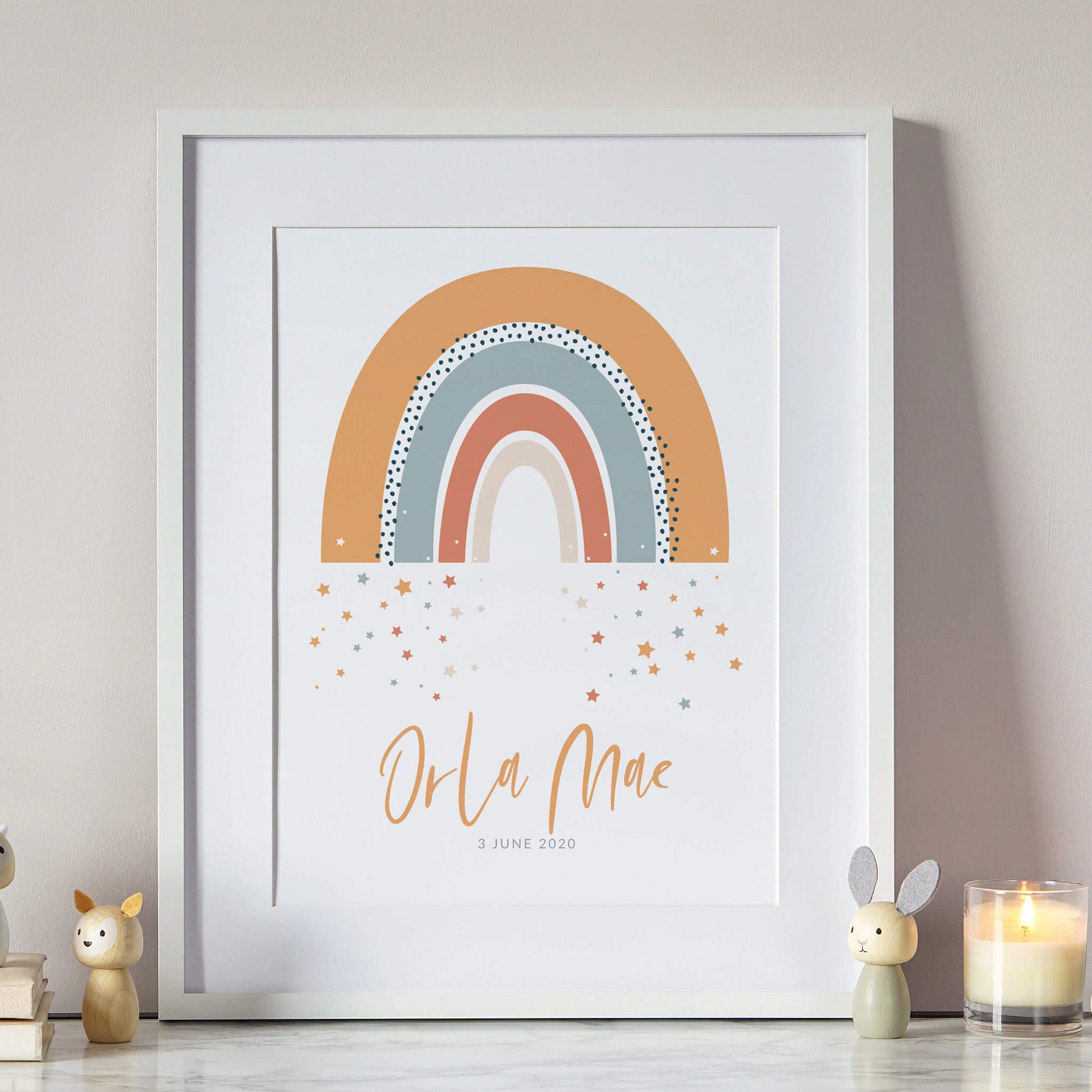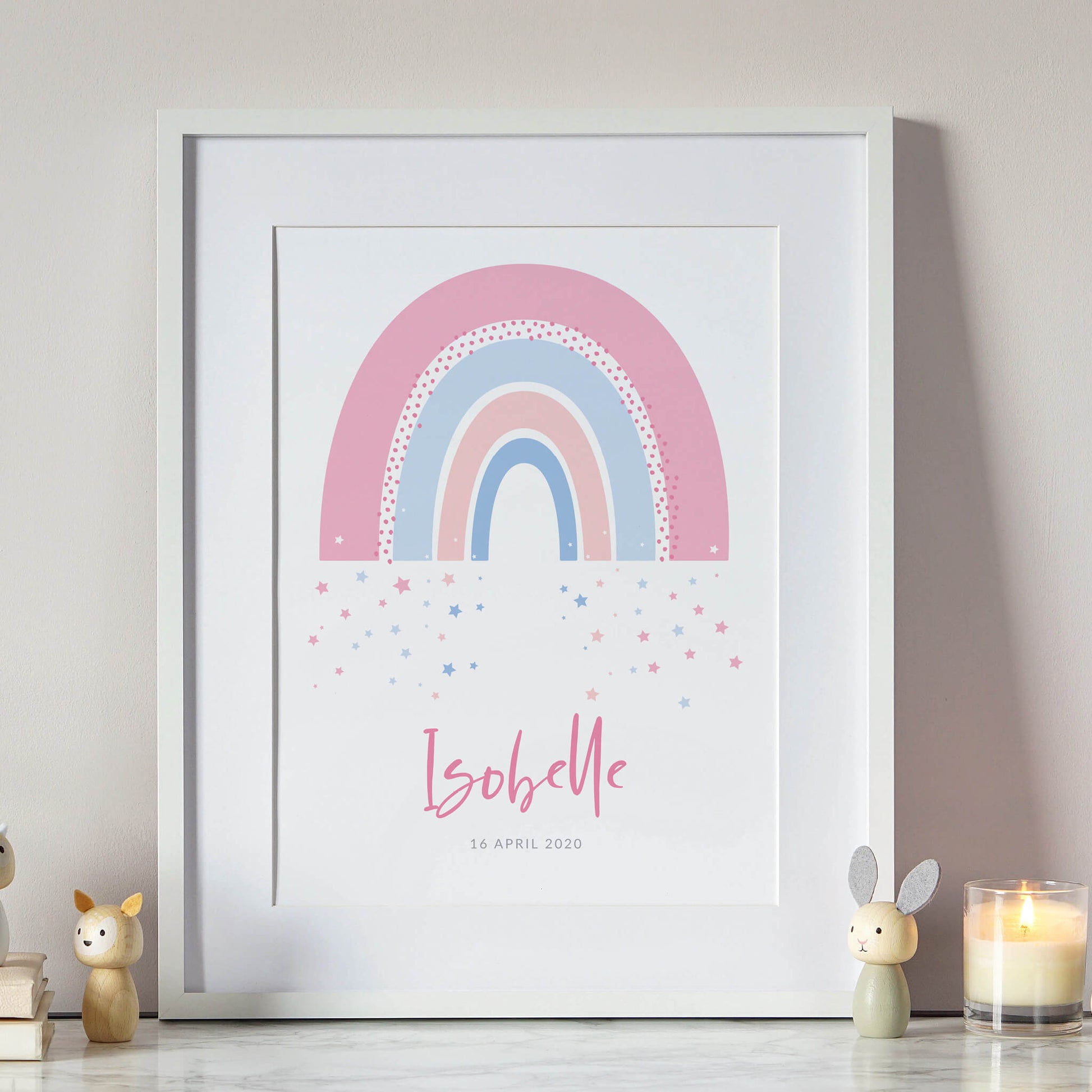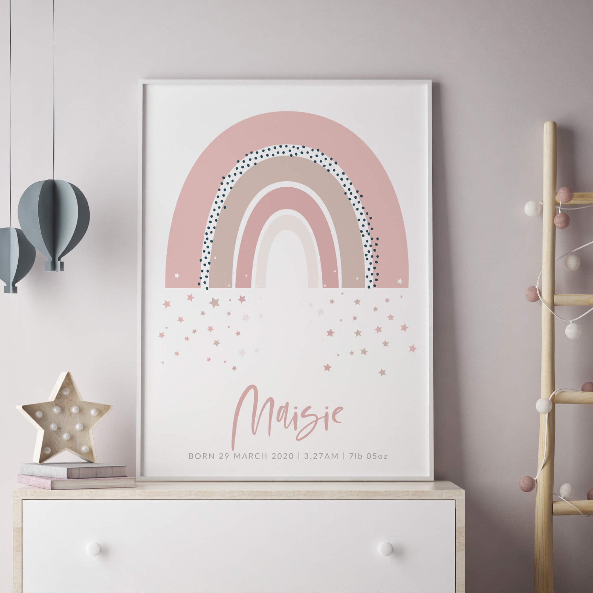What child isn’t obsessed with rainbows? I know my two certainly are, but it’s not just a thing of beauty, the rainbow has become an icon and a symbol of hope which is why I felt it was important to include one in my childrens’ collection. This personalised rainbow print also incorporates falling stars, for that extra little bit of magic.
