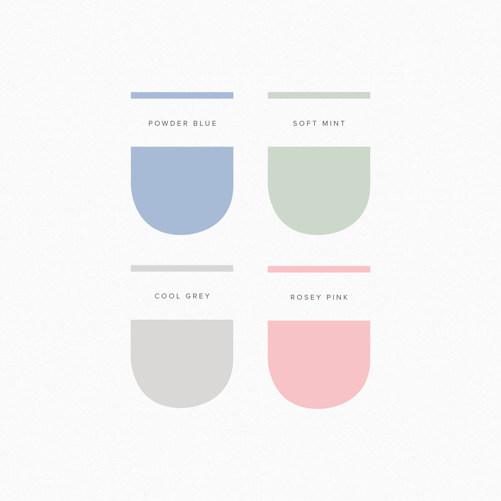 This print is available in four beautiful colours including soft mint, powder blue, rosey pink and cool grey, all with a white background with the baby's name in colour.
