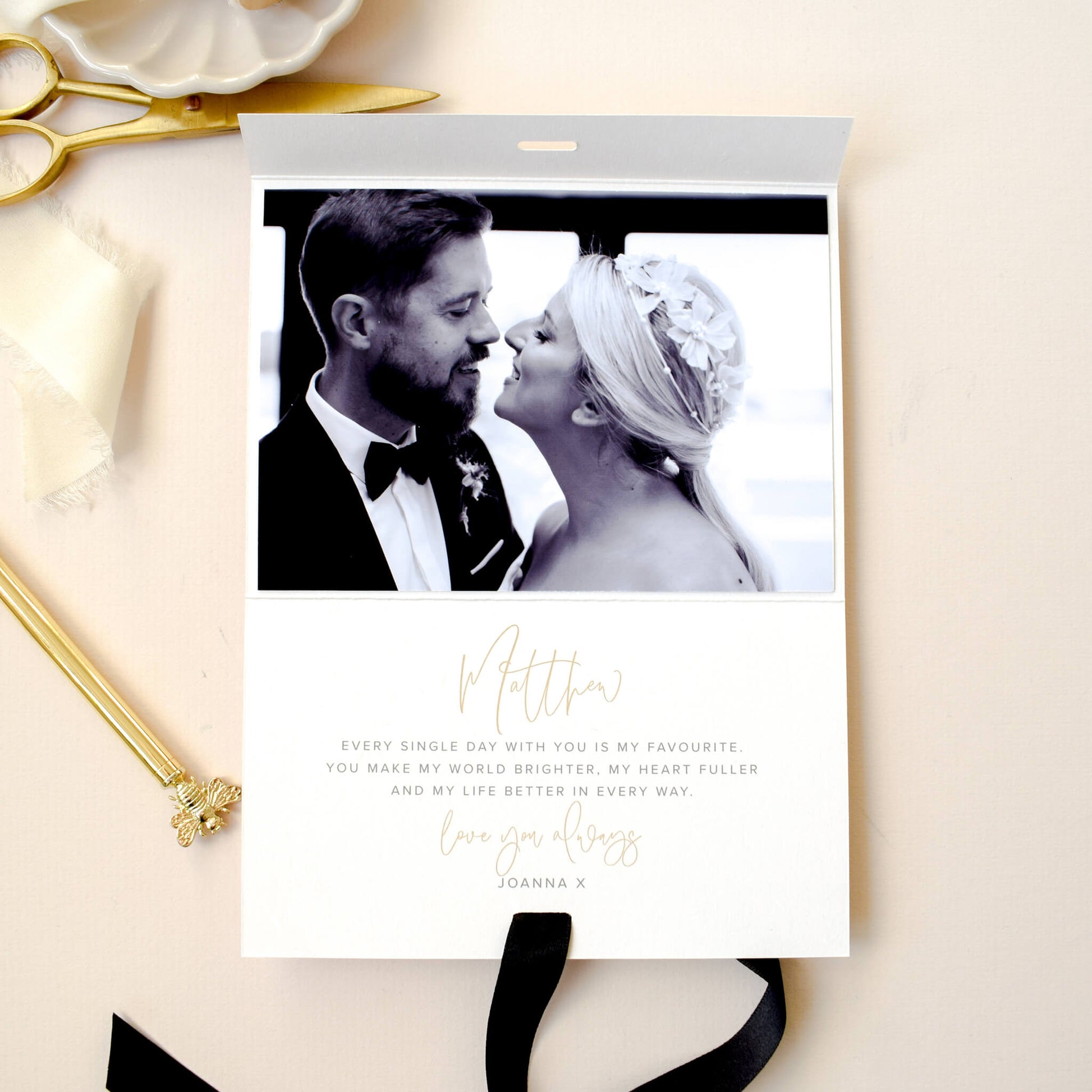 Beautifully crafted from luxury recycled paper and tied with a premium black satin ribbon, this elegant card holds a special surprise inside. As the ribbon is untied, the recipient will discover a printed photo and your personalised message, creating a truly meaningful moment.