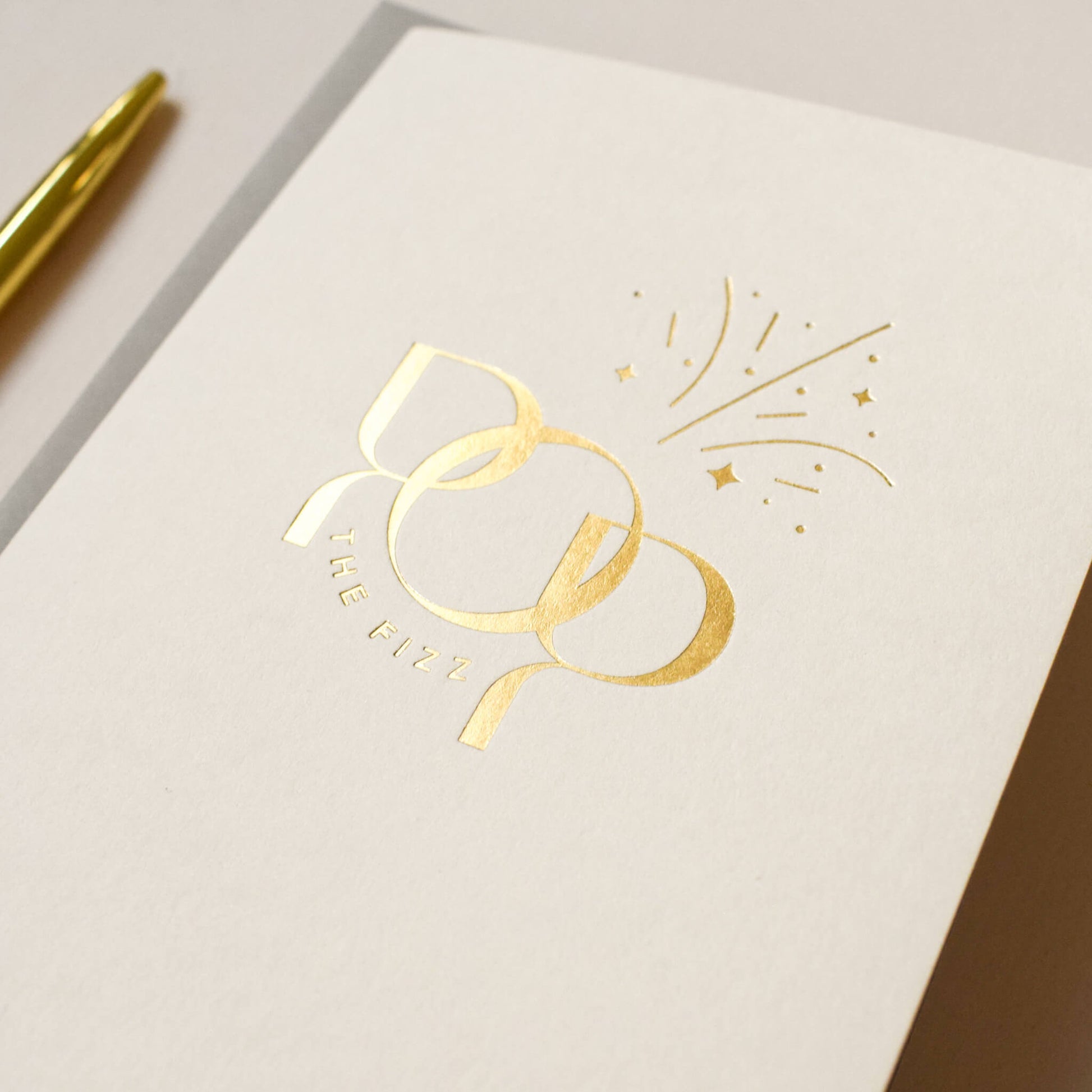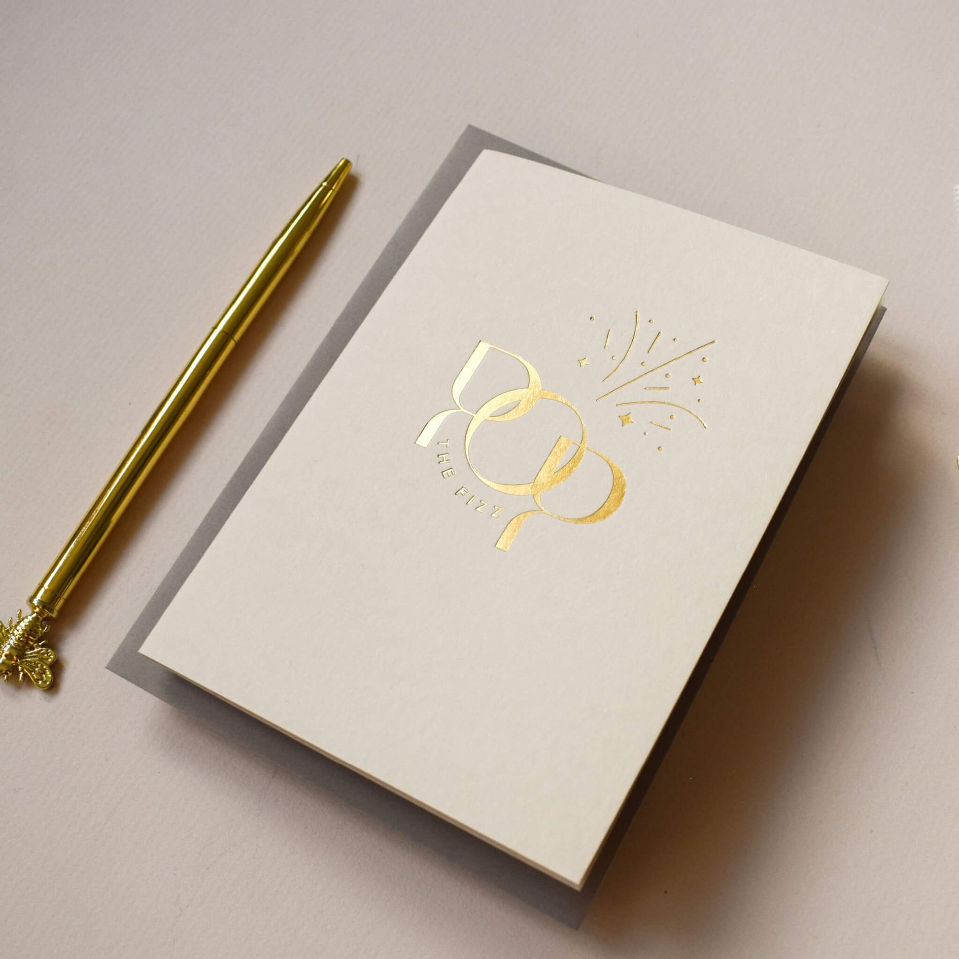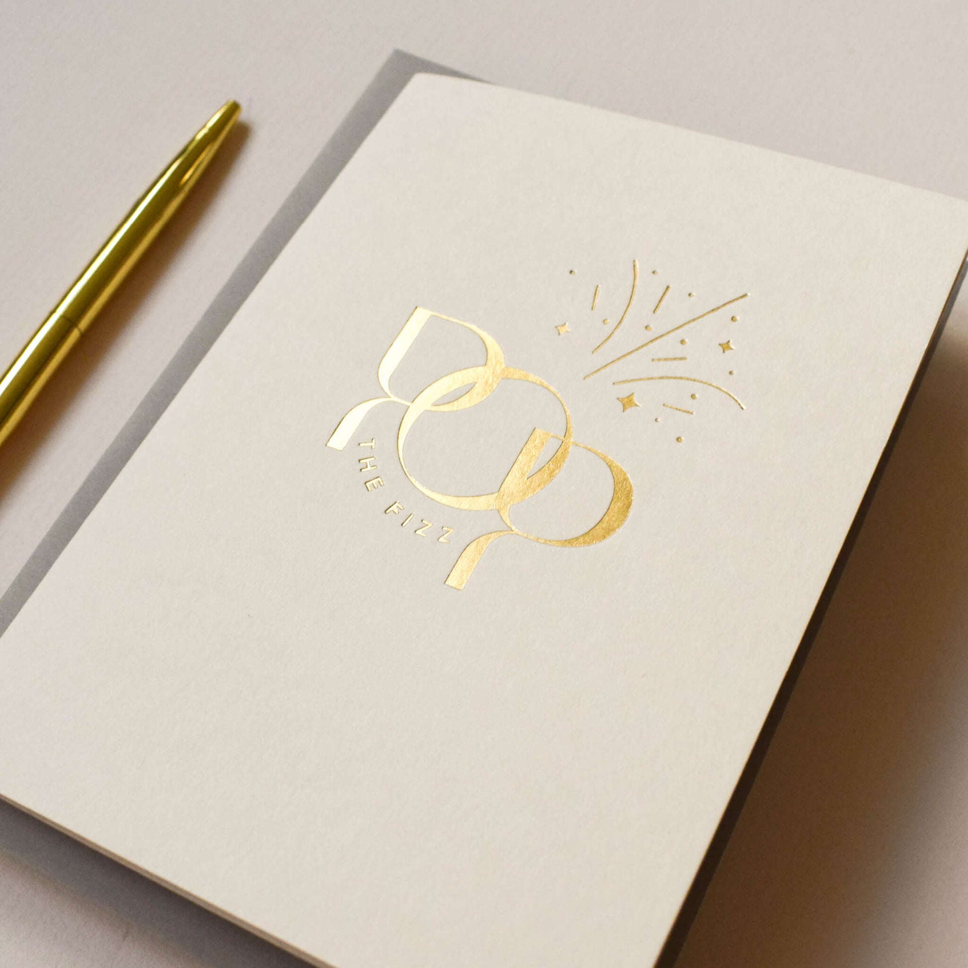 This luxury card features the words 'Pop The Fizz’ in a modern and minimalistic typographic design, printed in gold foil onto mist coloured paper. The dynamic design is enhanced by a minimalistic illustration to reflect the fizz from the champagne. This celebratory card is suitable for any occasion where you want to send your congratulations including a birthday, a wedding, an engagement or even a card for a new home.