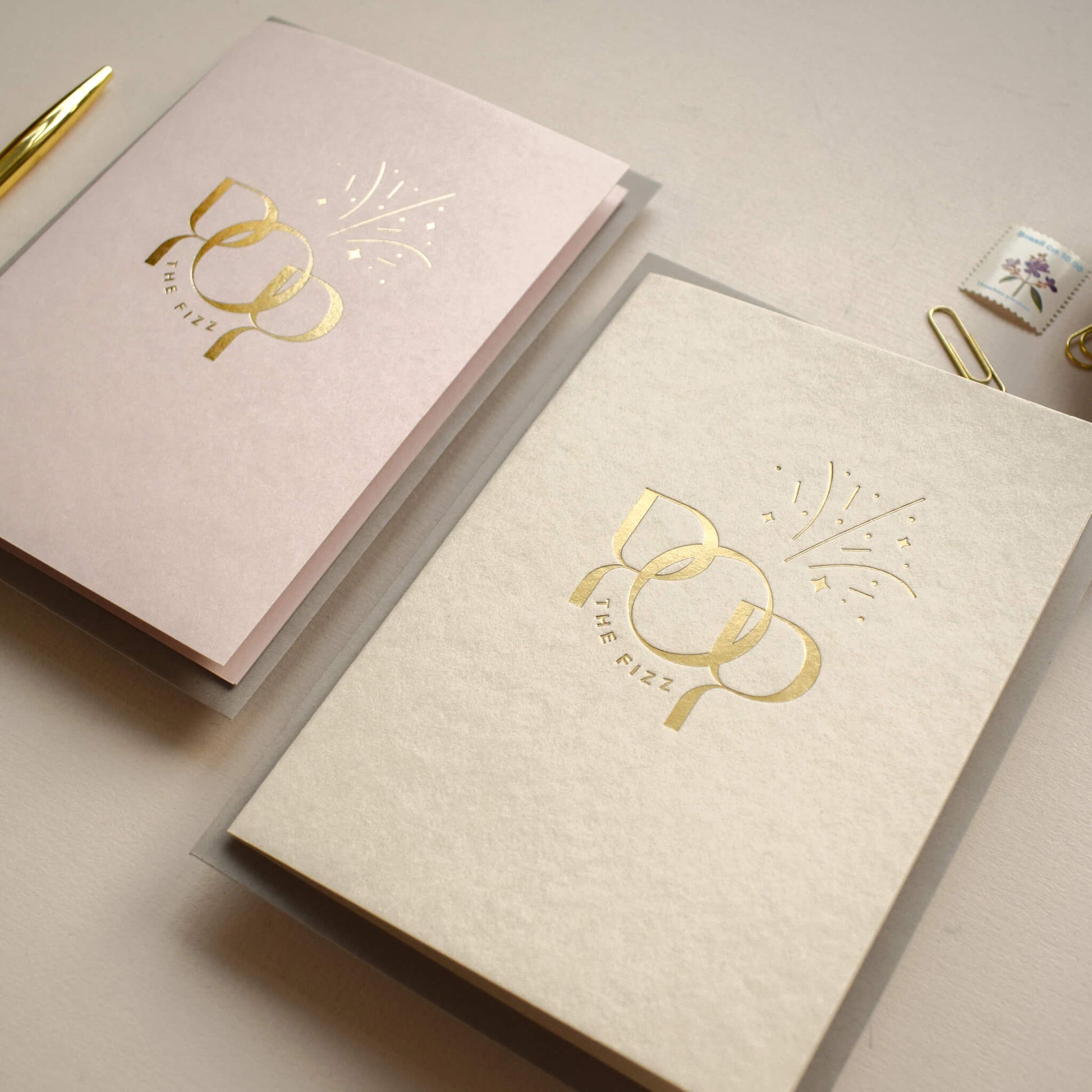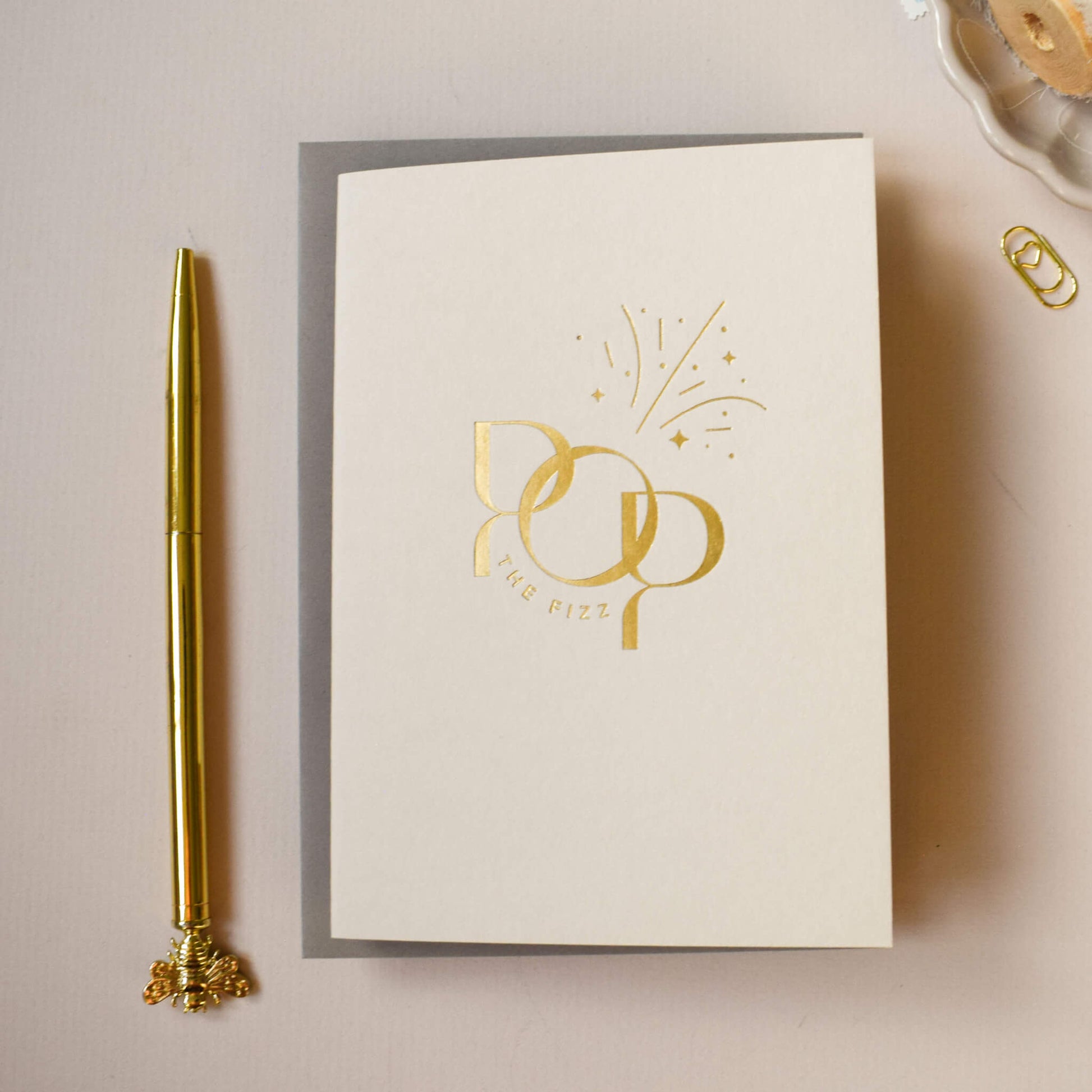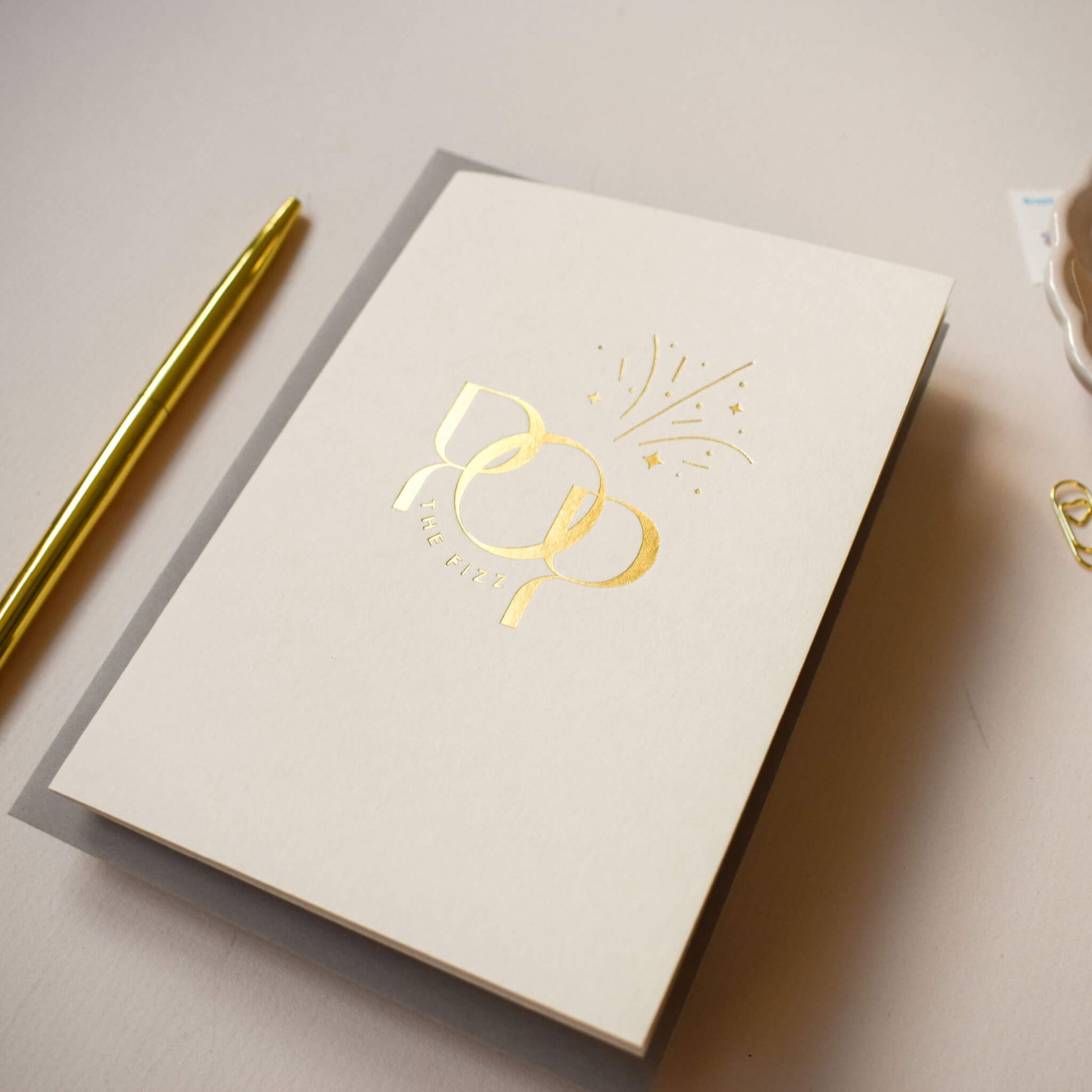 This luxury card features the words 'Pop The Fizz’ in a modern and minimalistic typographic design, printed in gold foil onto mist coloured paper. The dynamic design is enhanced by a minimalistic illustration to reflect the fizz from the champagne. This celebratory card is suitable for any occasion where you want to send your congratulations including a birthday, a wedding, an engagement or even a card for a new home.