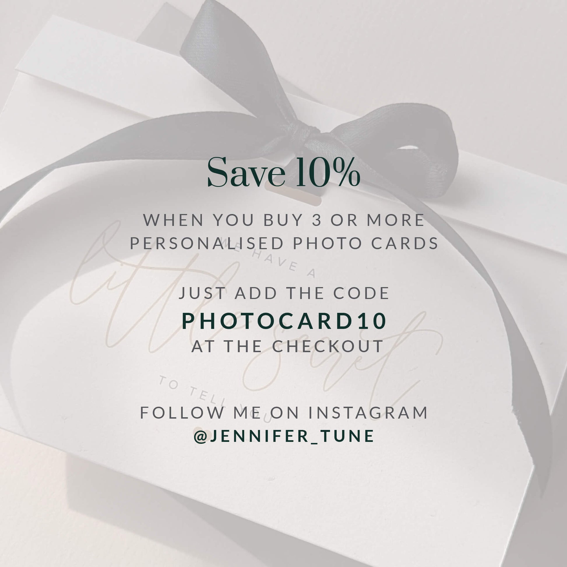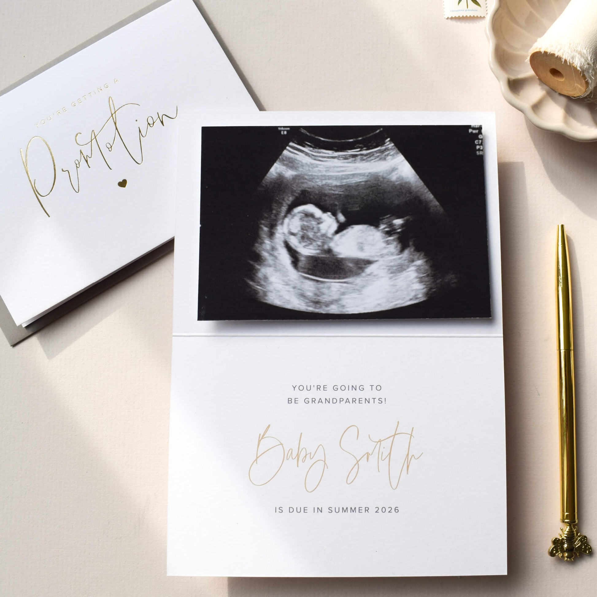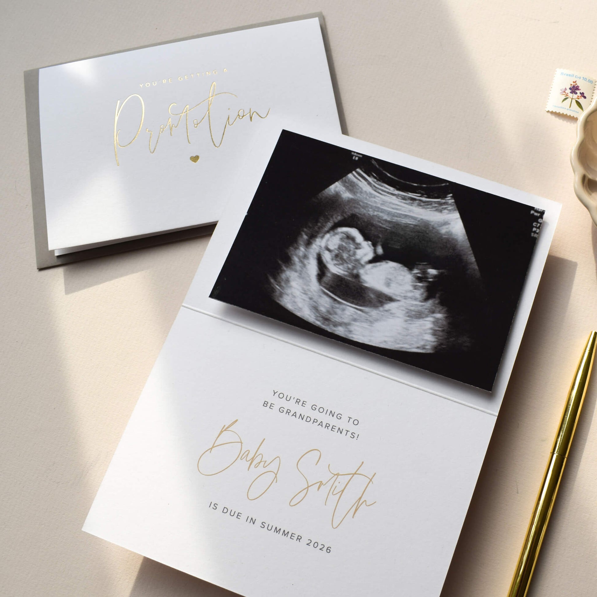 Make your card even more personal by choosing to have a message printed inside in a beautiful font. You can also add your baby scan photo, professionally printed on high-quality photo paper and carefully mounted inside the card for an extra thoughtful touch.