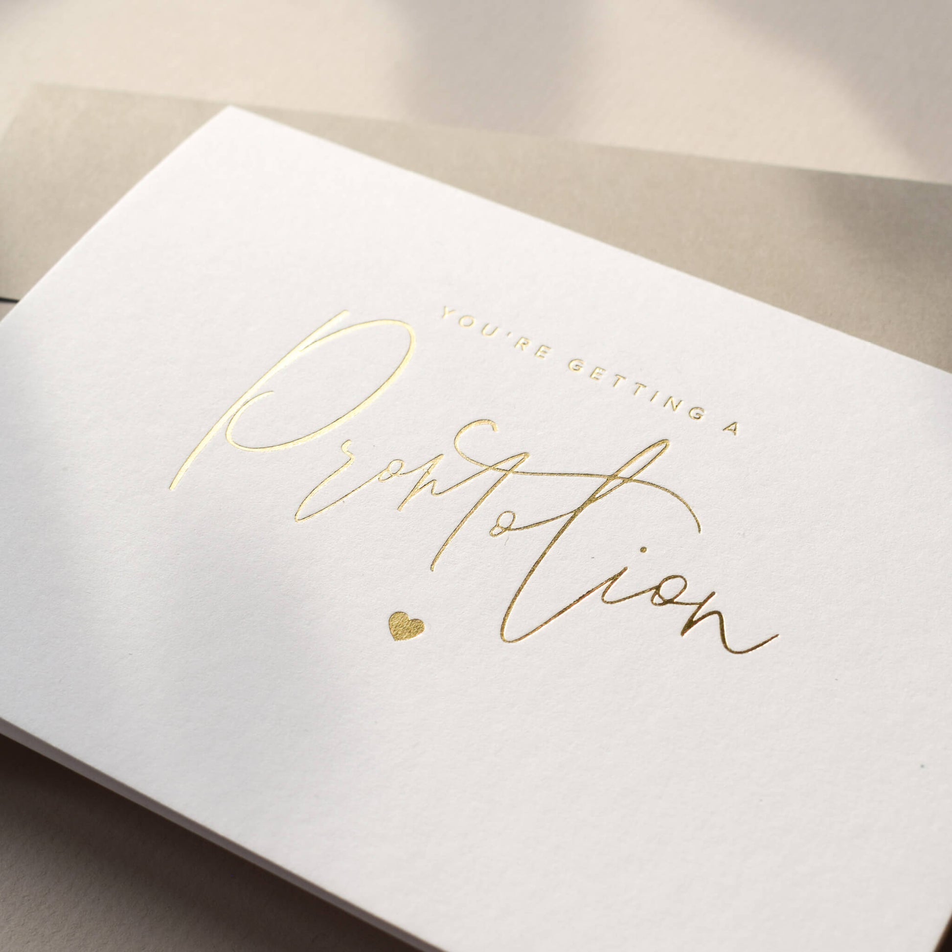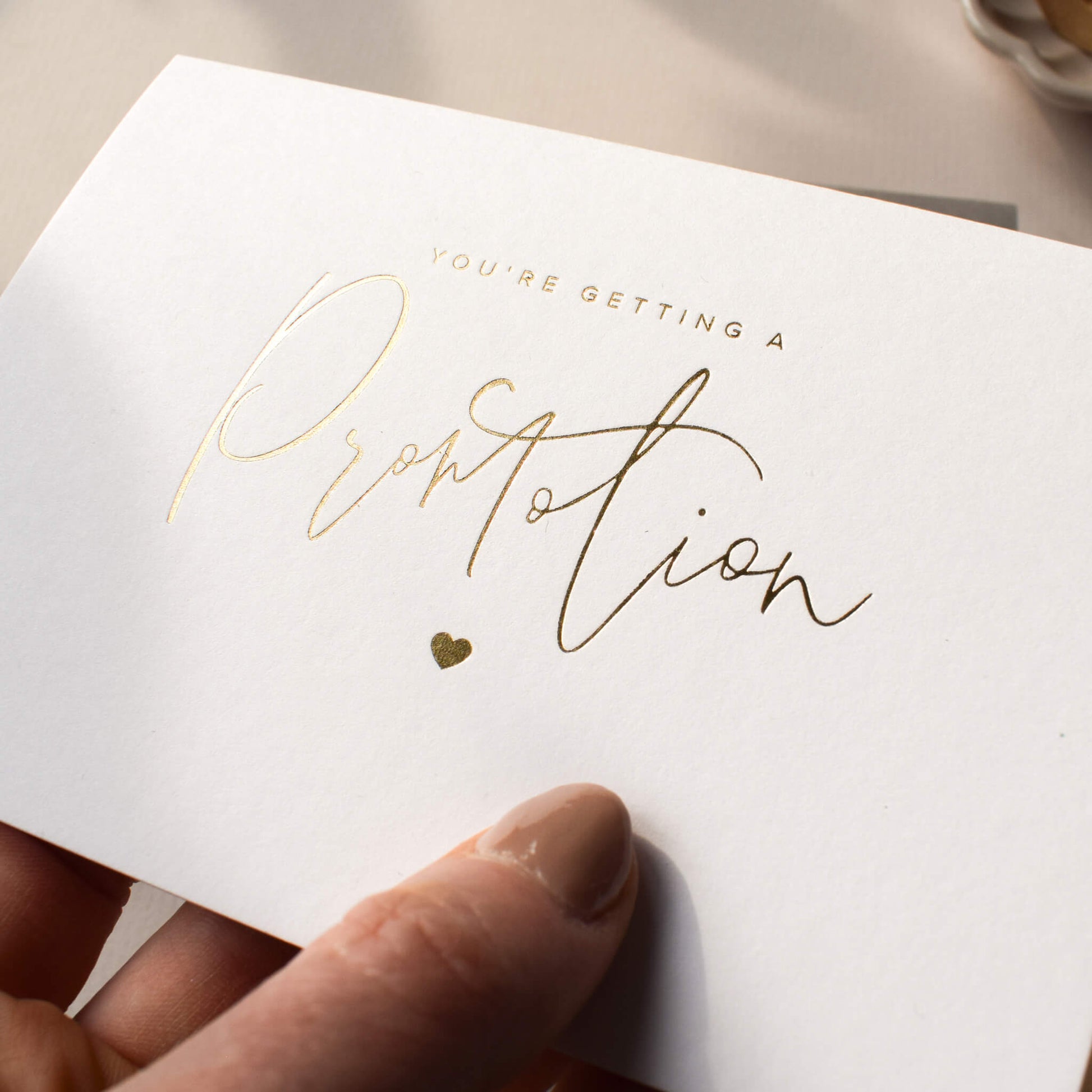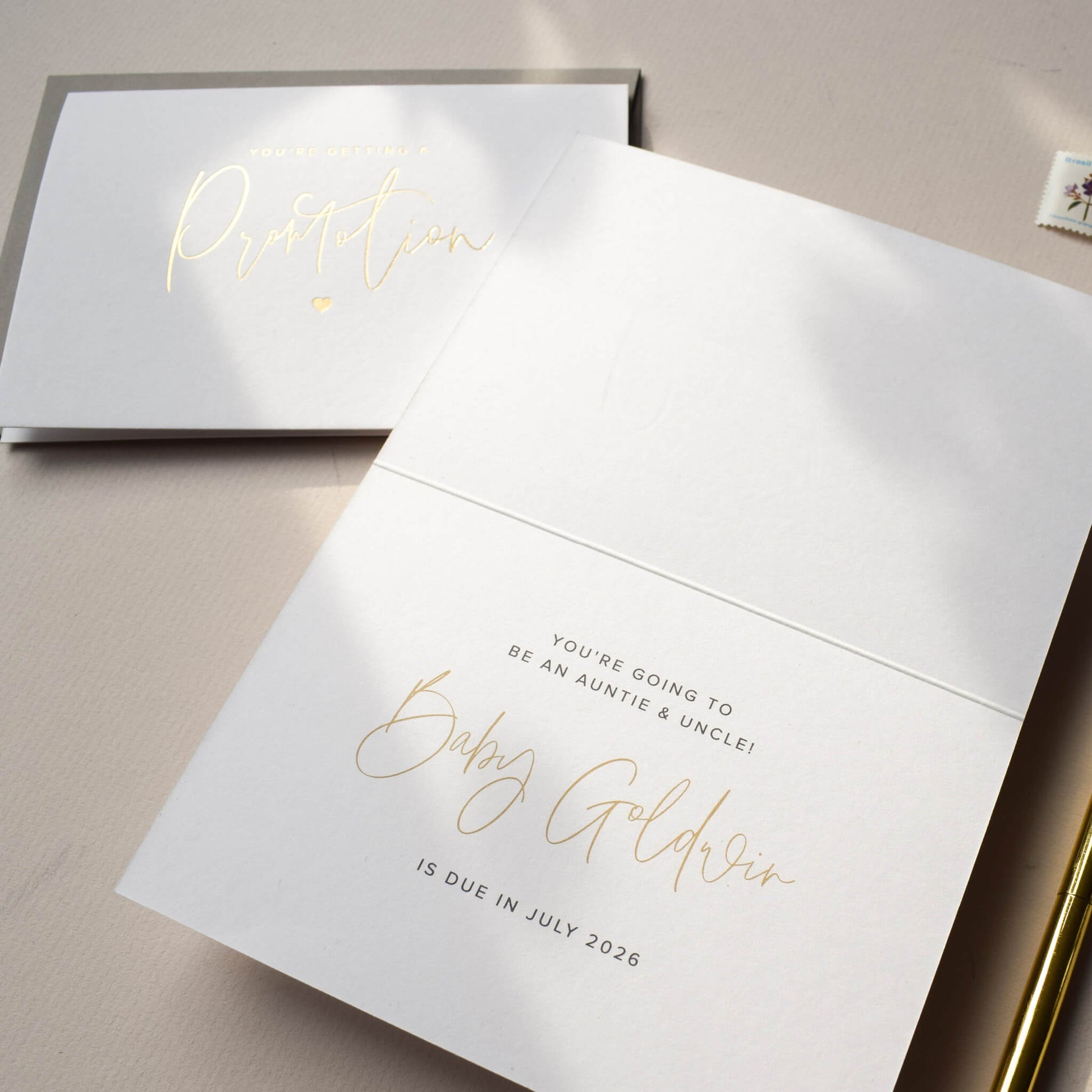 Share your exciting news in style with this elegant gold foil pregnancy announcement card, the perfect way to reveal your pregnancy to friends and family. The front of the card features the text"You're Getting A Promotion" in luxurious gold foil, making it a truly special keepsake.