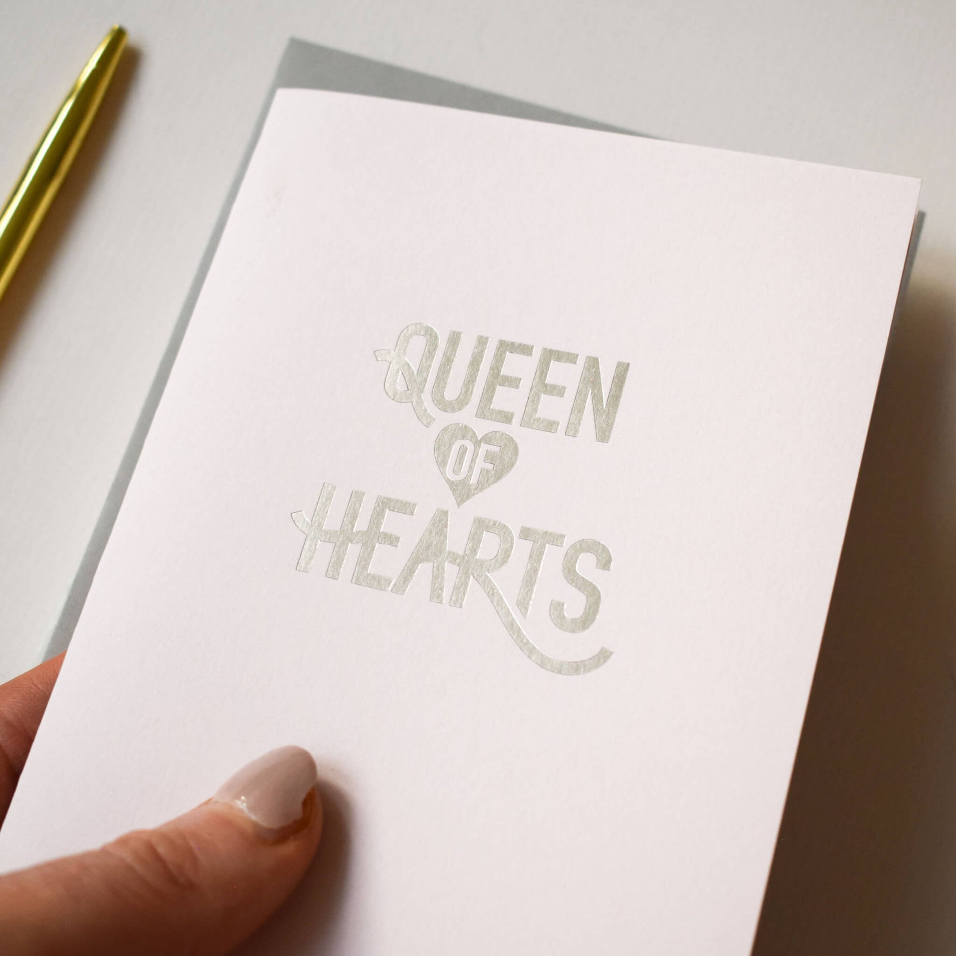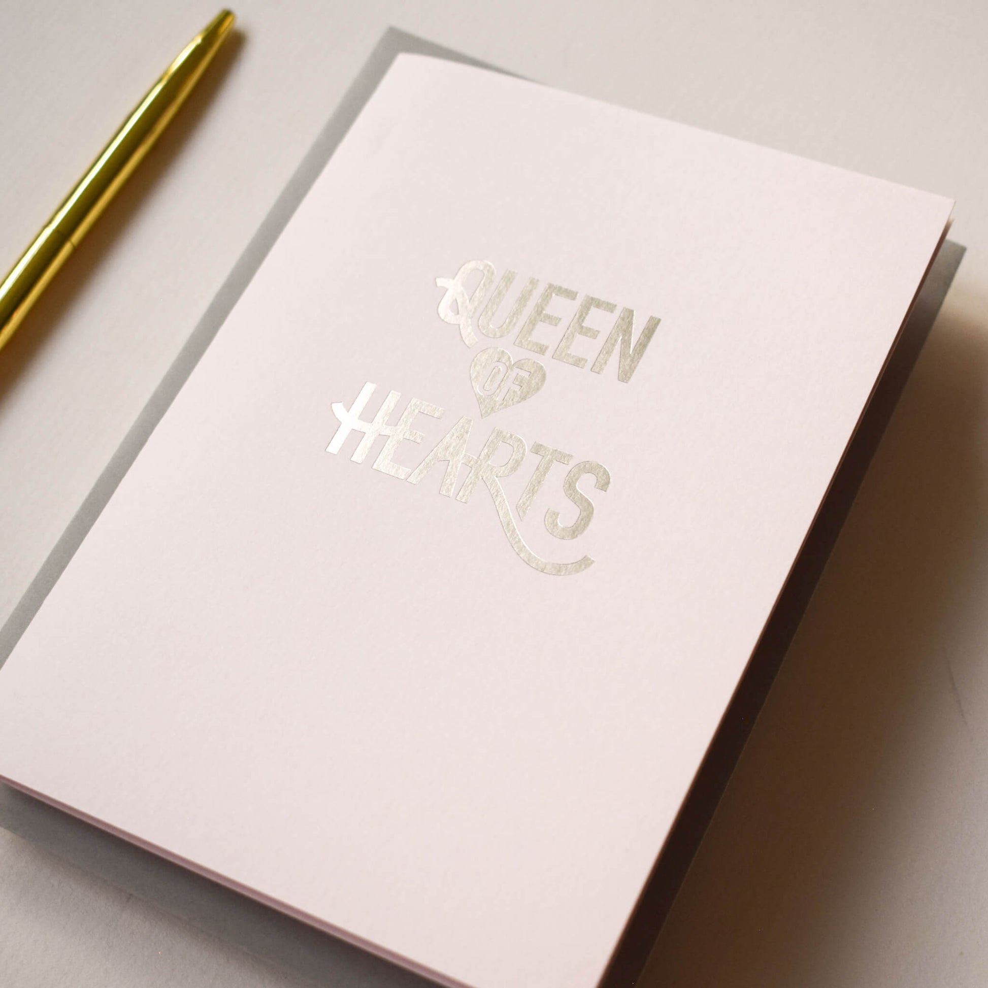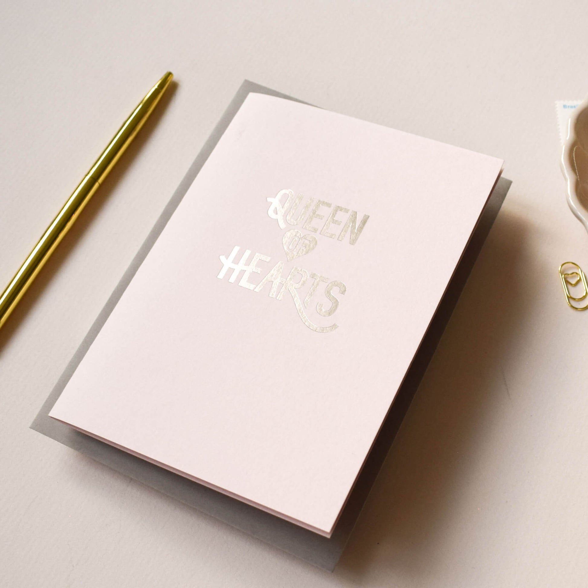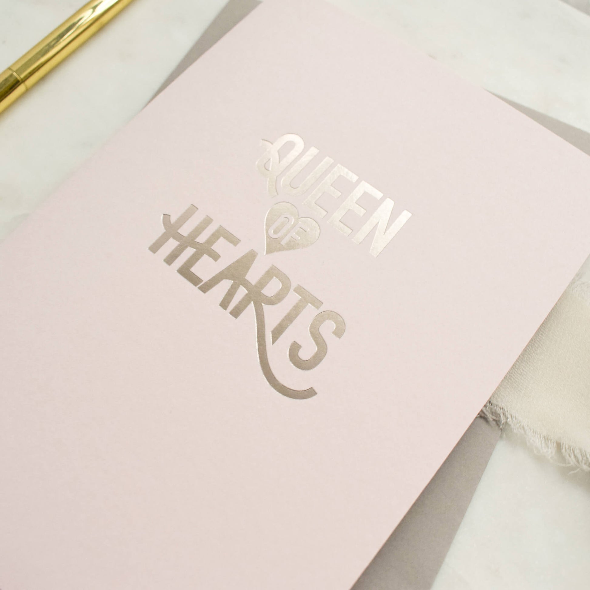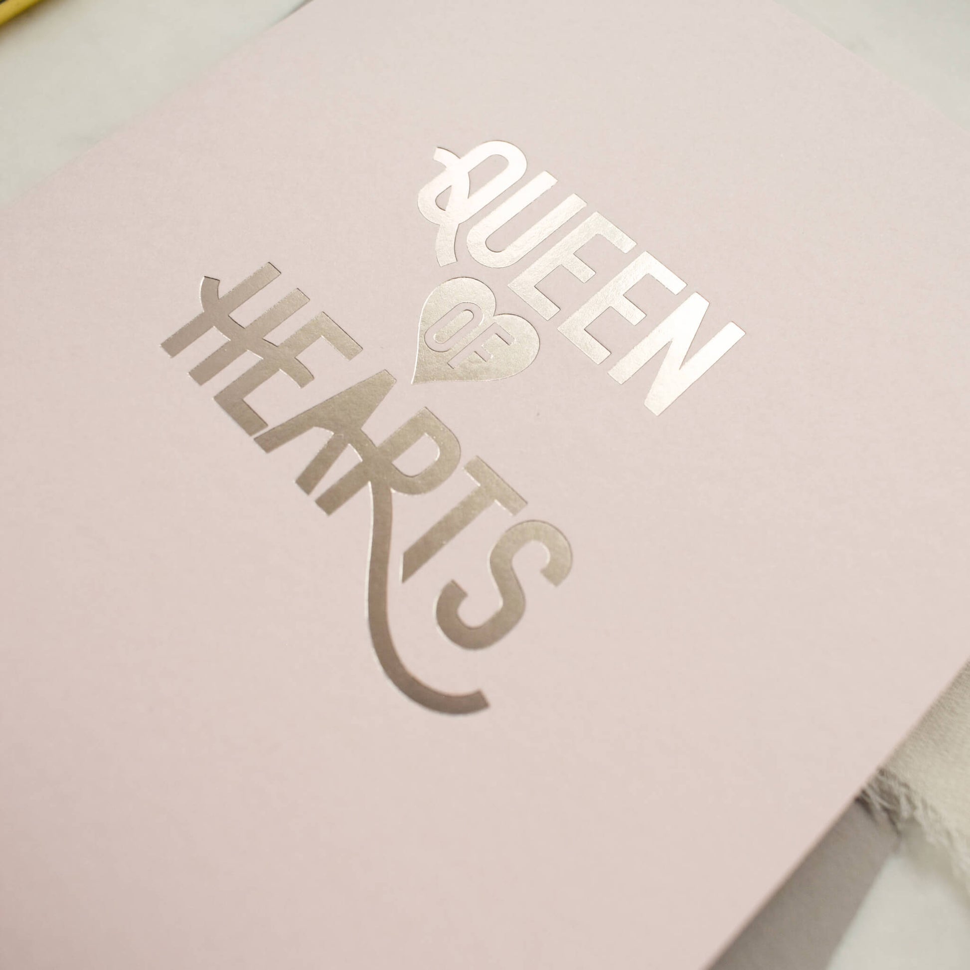 This stunning typographic card features the words 'Queen of Hearts' in a minimalistic and modern design. The combination of the dynamic design, the wonderful tactile blush pink paper and the exquisite silver foil make this a stand-out card, perfect for a range of occasions such as Valentine's Day or Mother's Day.