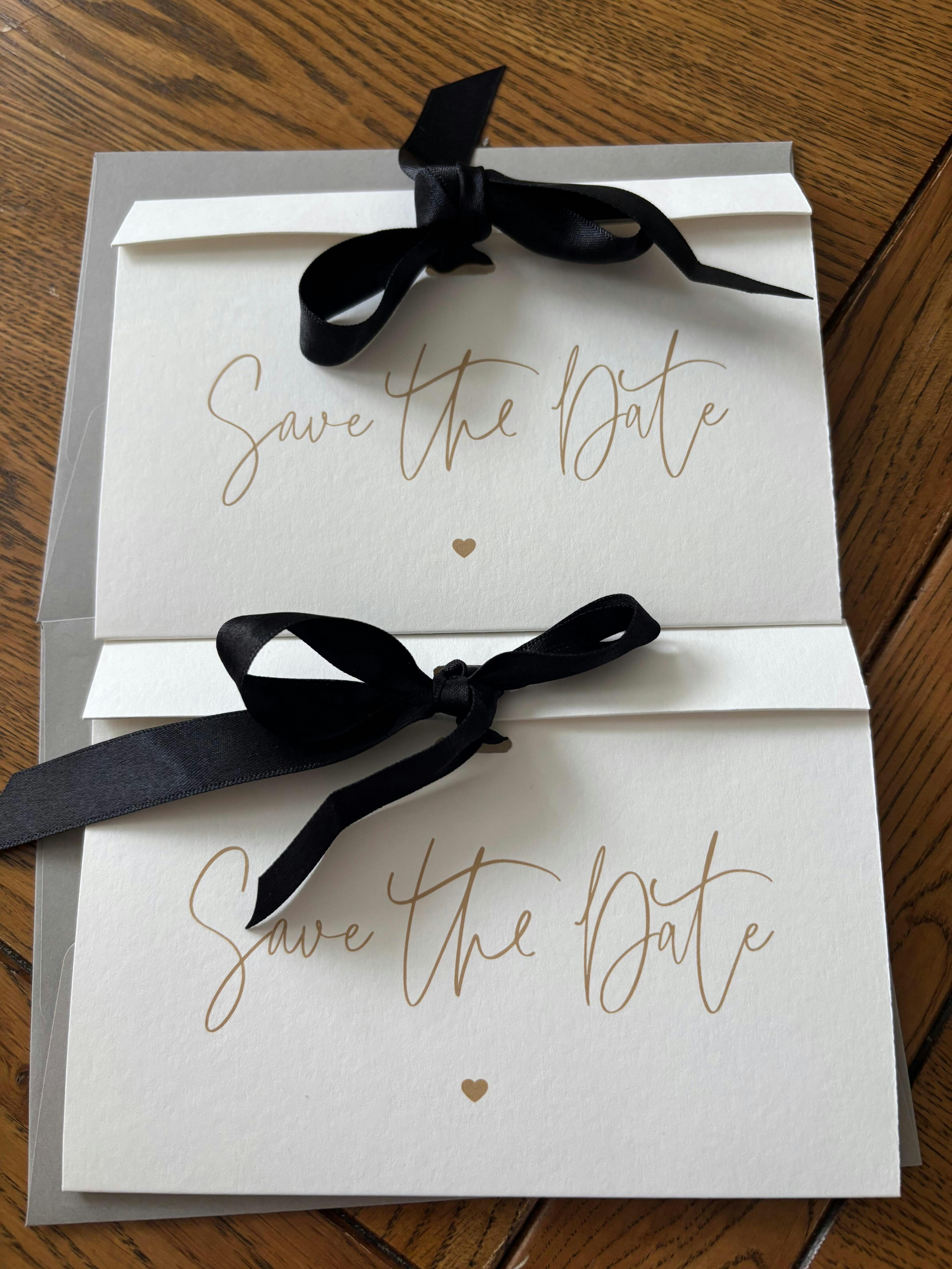 Delight your friends and family with a beautifully unexpected pregnancy reveal card. At first glance, this card looks just like a classic wedding invitation, with the words "Save The Date" on the front. But when your loved one unties the satin ribbon and opens it up, they’ll be greeted with a cherished black and white scan photo and your own personalised message — a heartfelt surprise they’ll never forget. Whether it's a pregnancy announcement for grandparents, siblings or friends, this stylish and unique card makes the moment even more special.
