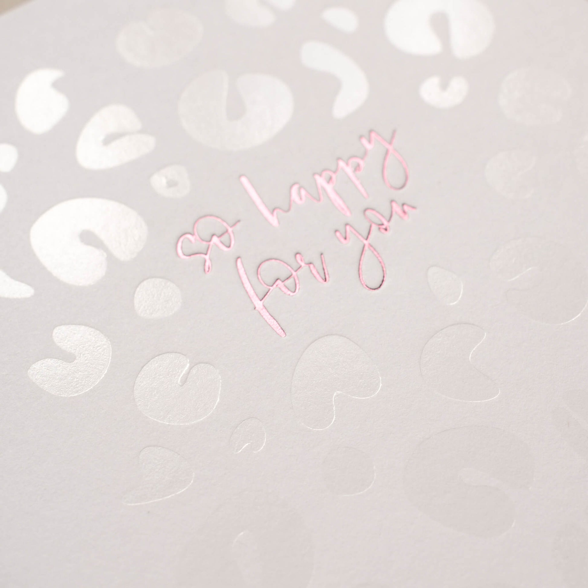 This luxury card features the words 'so happy for you' in a stunning calligraphy style, printed in pink foil and surrounded by an abstract leopard print pattern, making this a gorgeous card for any special occasion, including a baby shower, engagement or new job.
