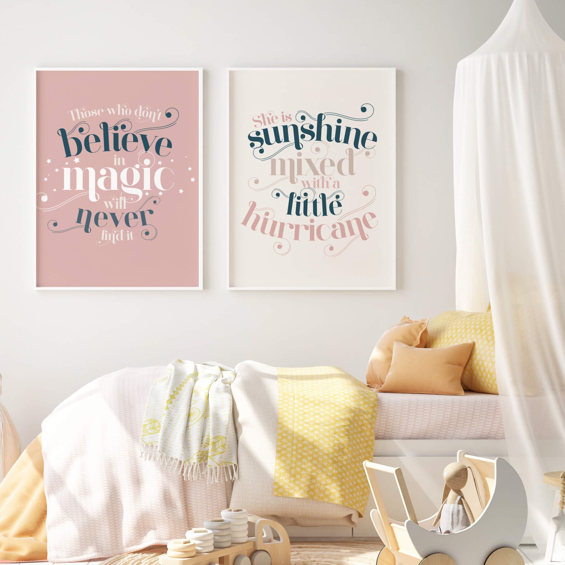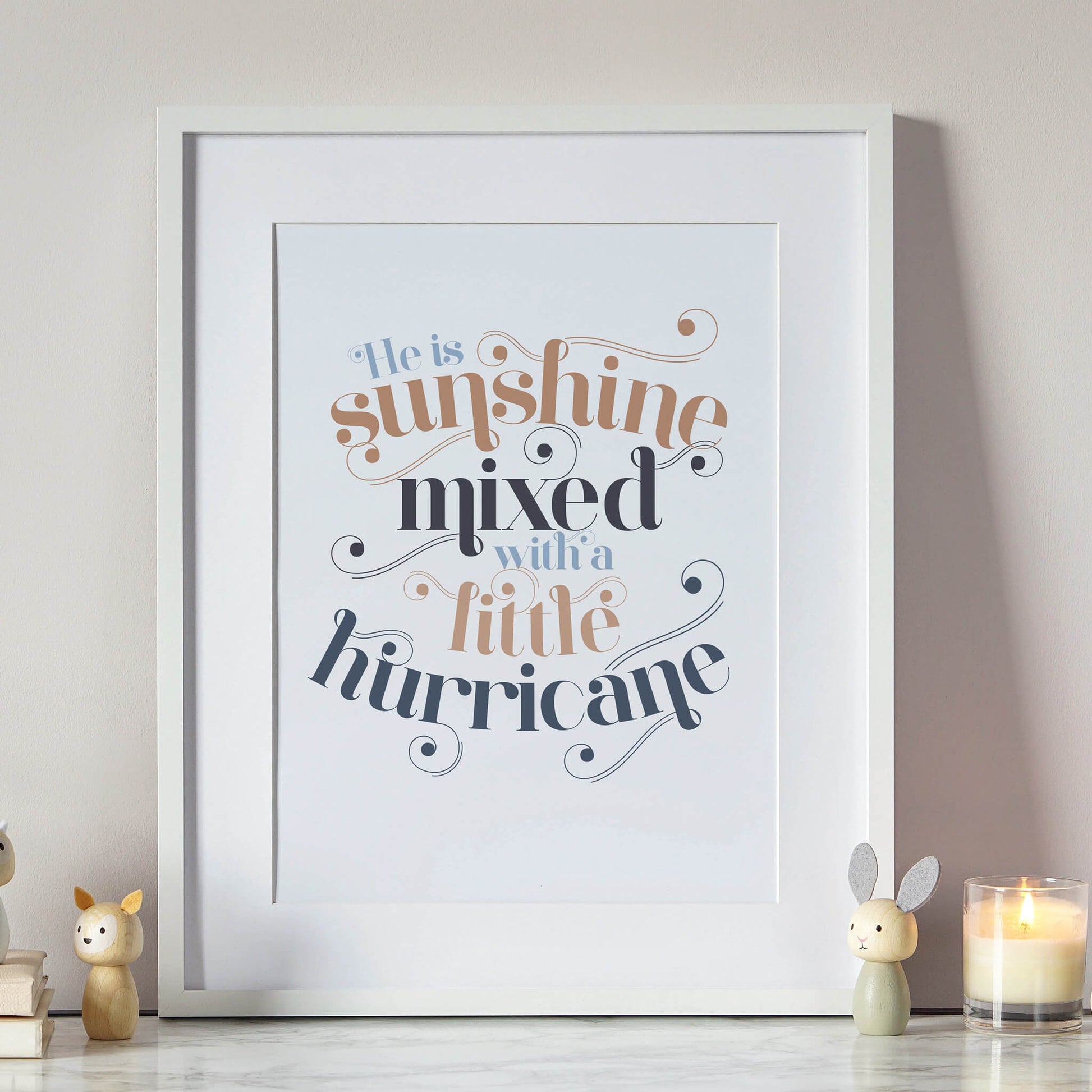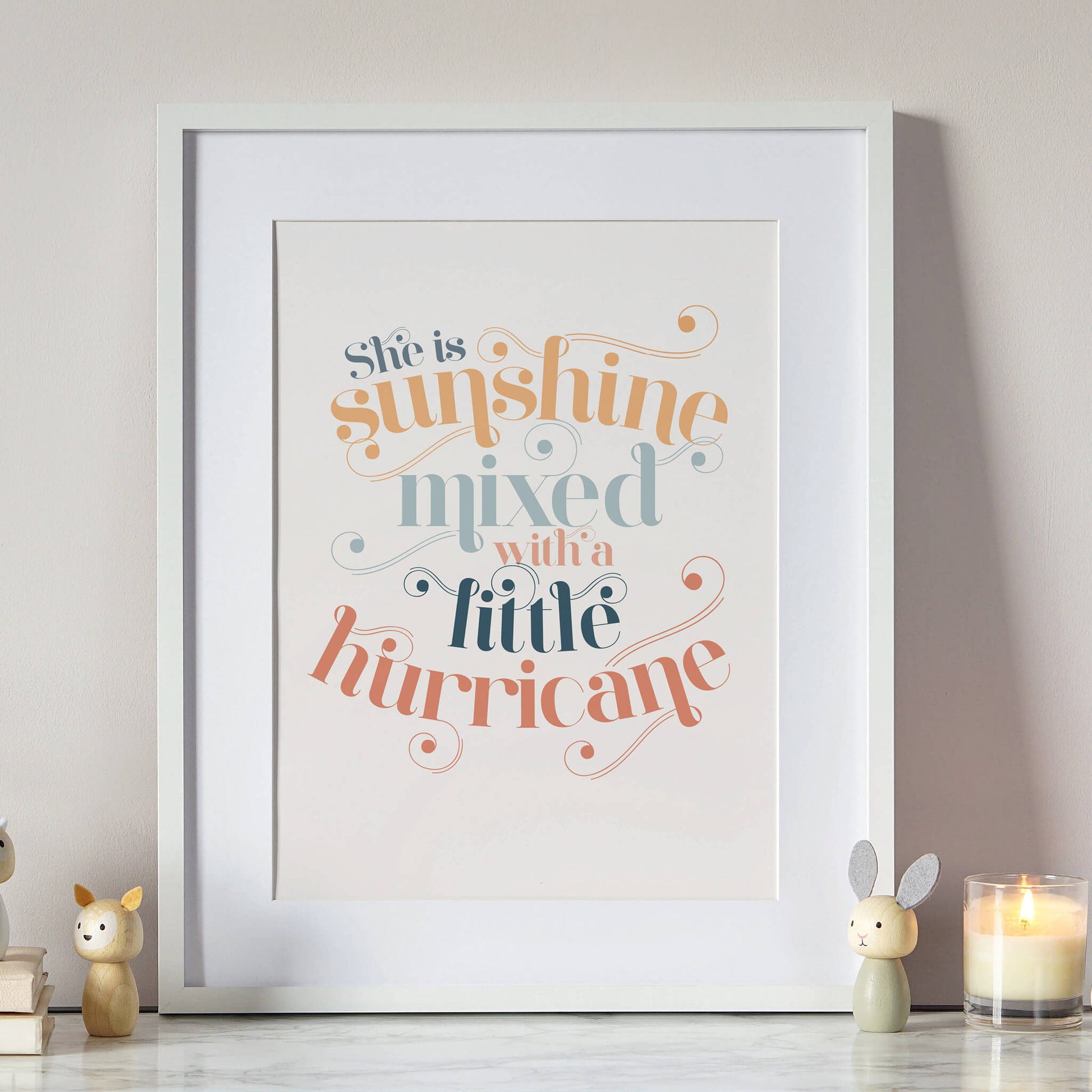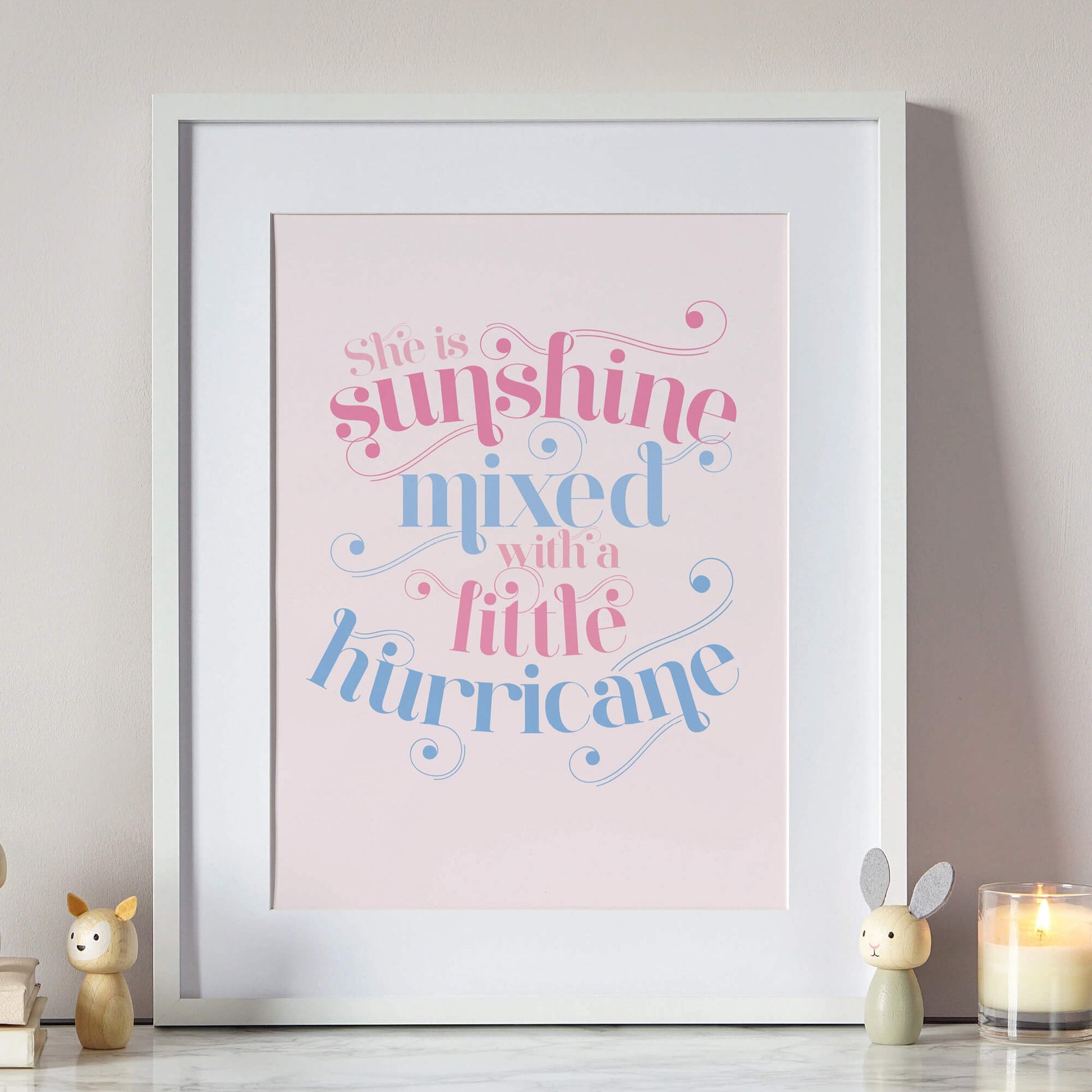 This modern nursery print or children’s bedroom print features the phrase ‘She is sunshine mixed with a little hurricane’ elegantly designed in a selection of beautiful, muted colour palettes. If you have a little boy who is ‘Sunshine mixed with a little hurricane’ it can also be changed to ‘he’, just include a note on your order.