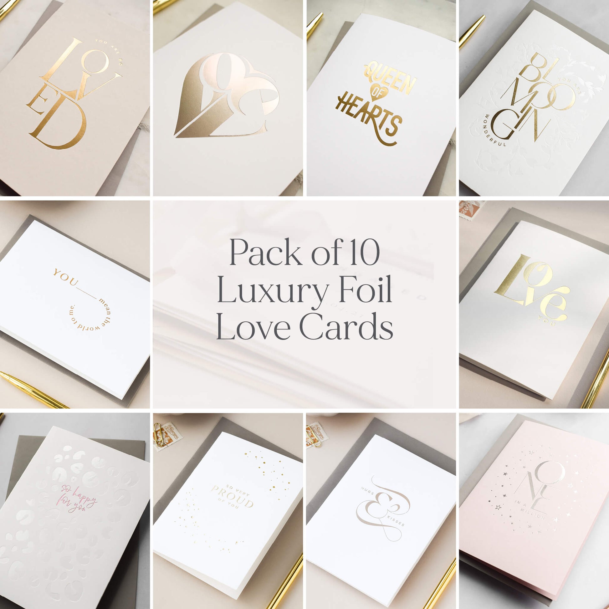 Be prepared for any unexpected special occasions and be ready to send your love to friends or family with this pack of ten greetings cards, all printed in foil onto luxurious heavyweight card. This luxury card bundle contains the following foil greeting cards: