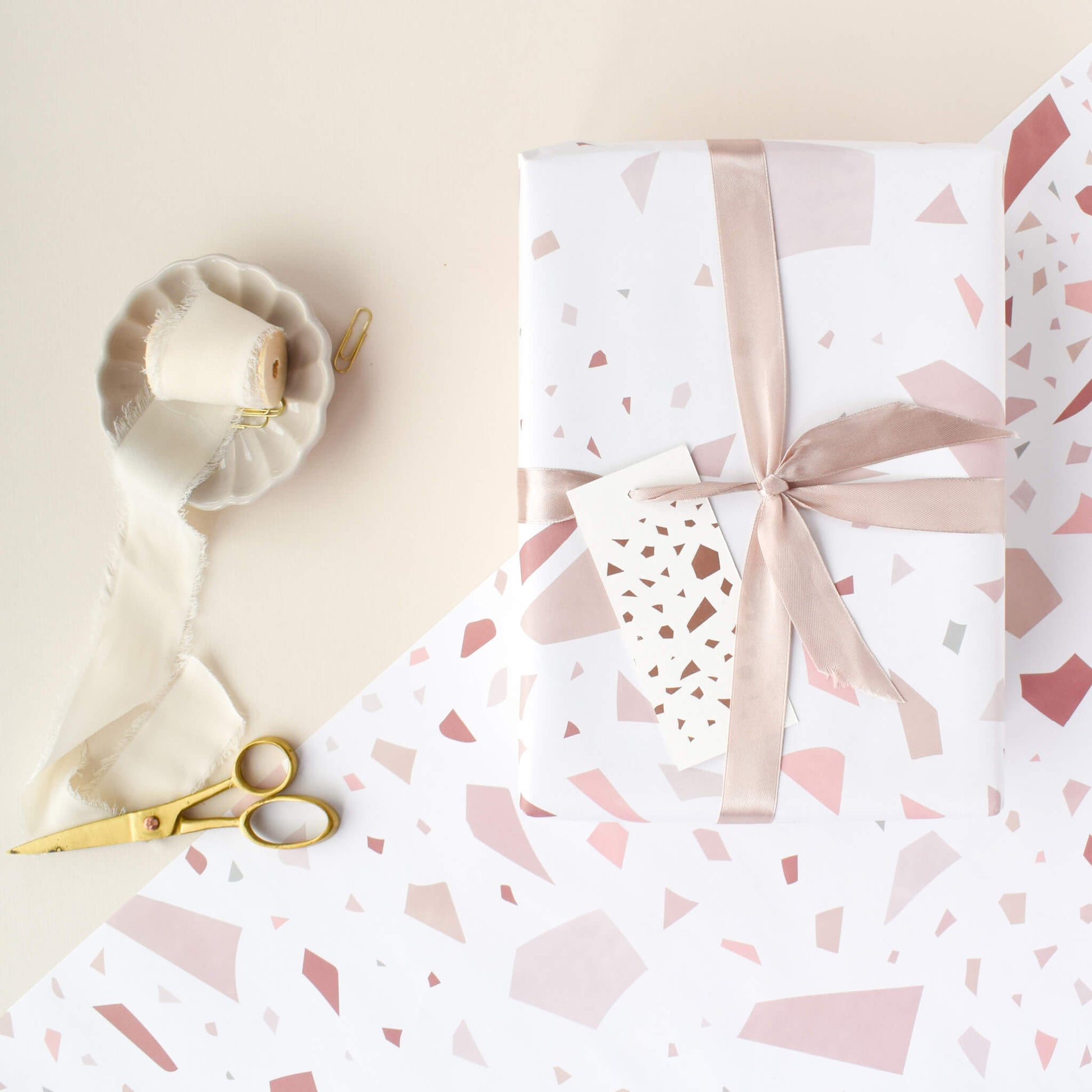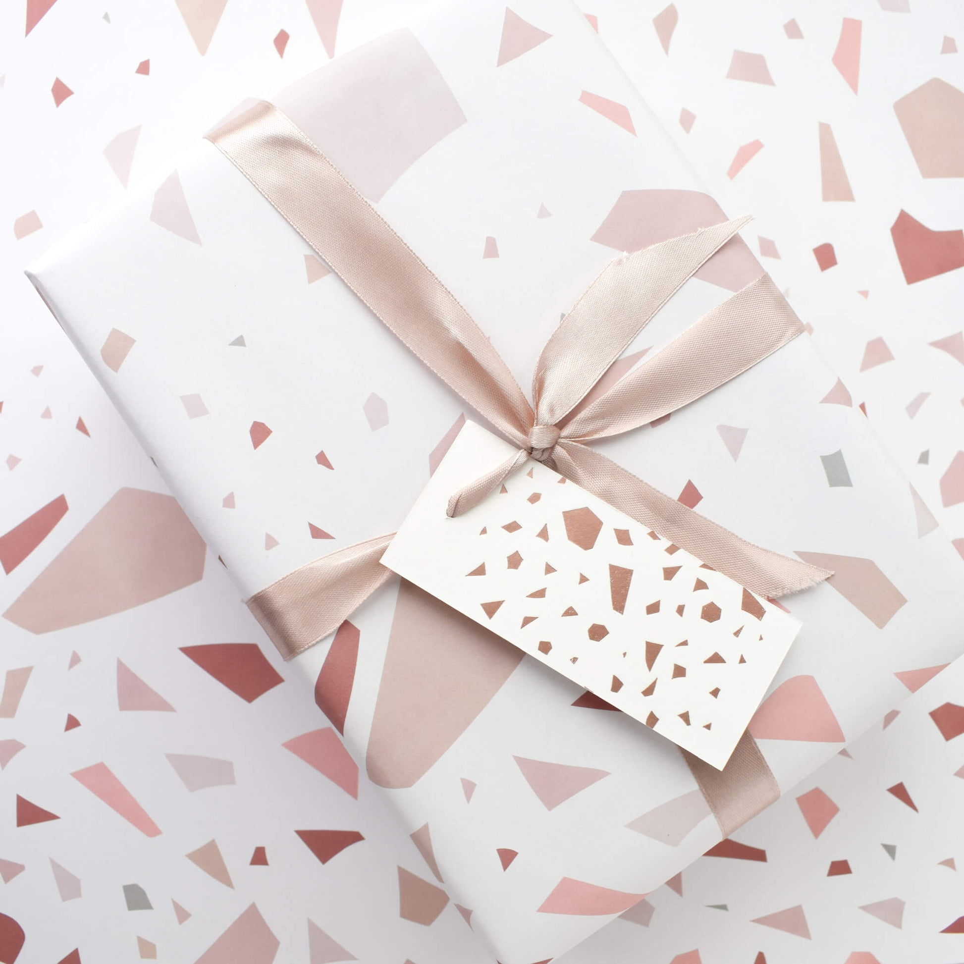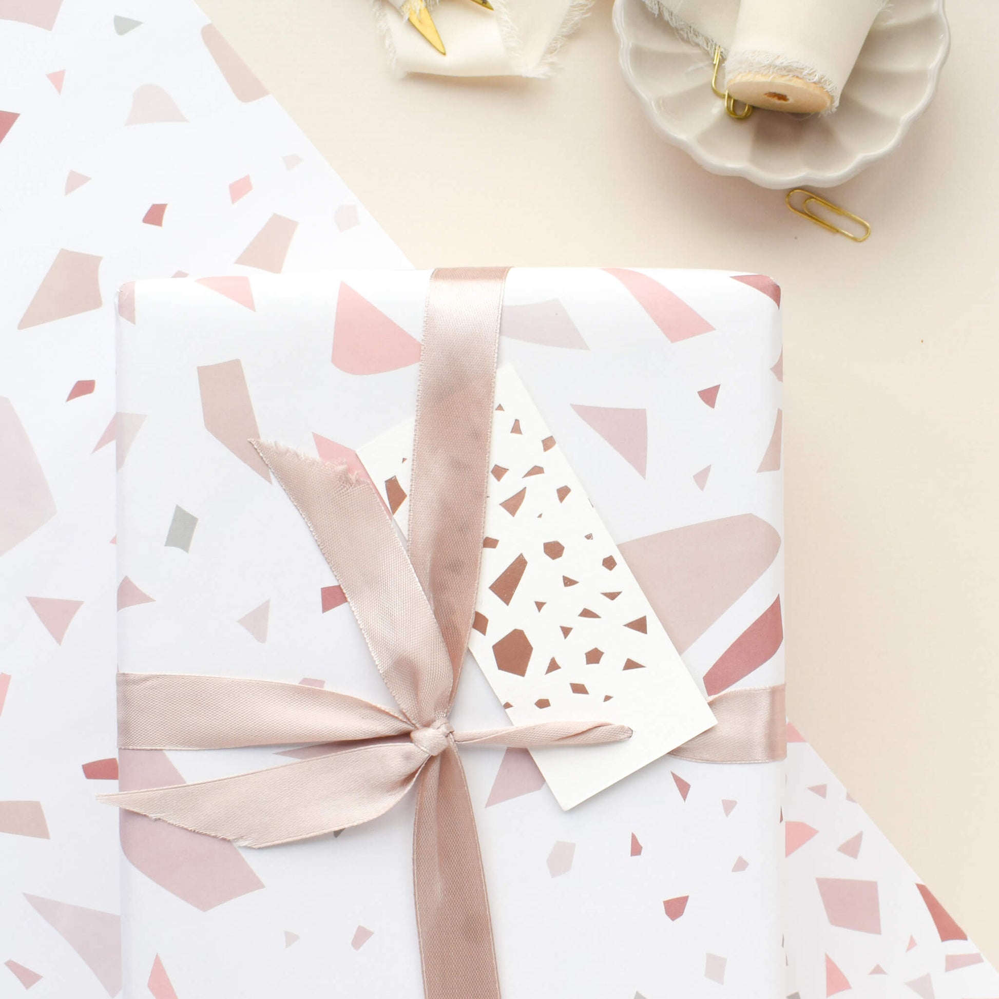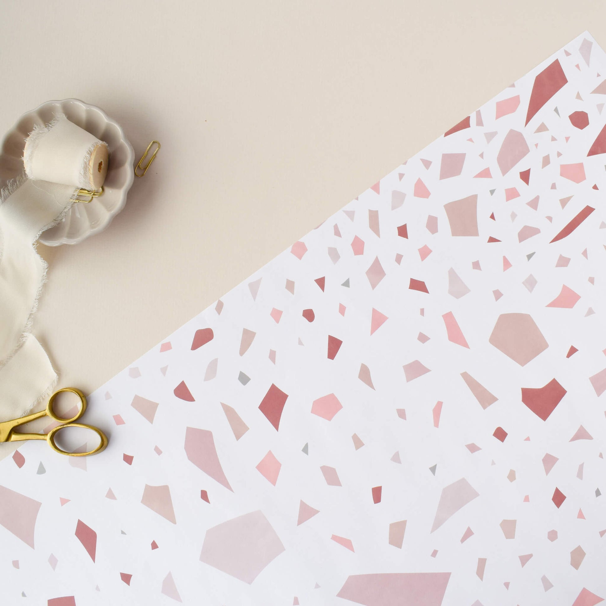 Two sheets of luxury gift wrap featuring a beautiful terrazzo print in a warm rust and pink colour palette. This wrapping paper is printed on thick premium matte paper which can be re-used or recycled.