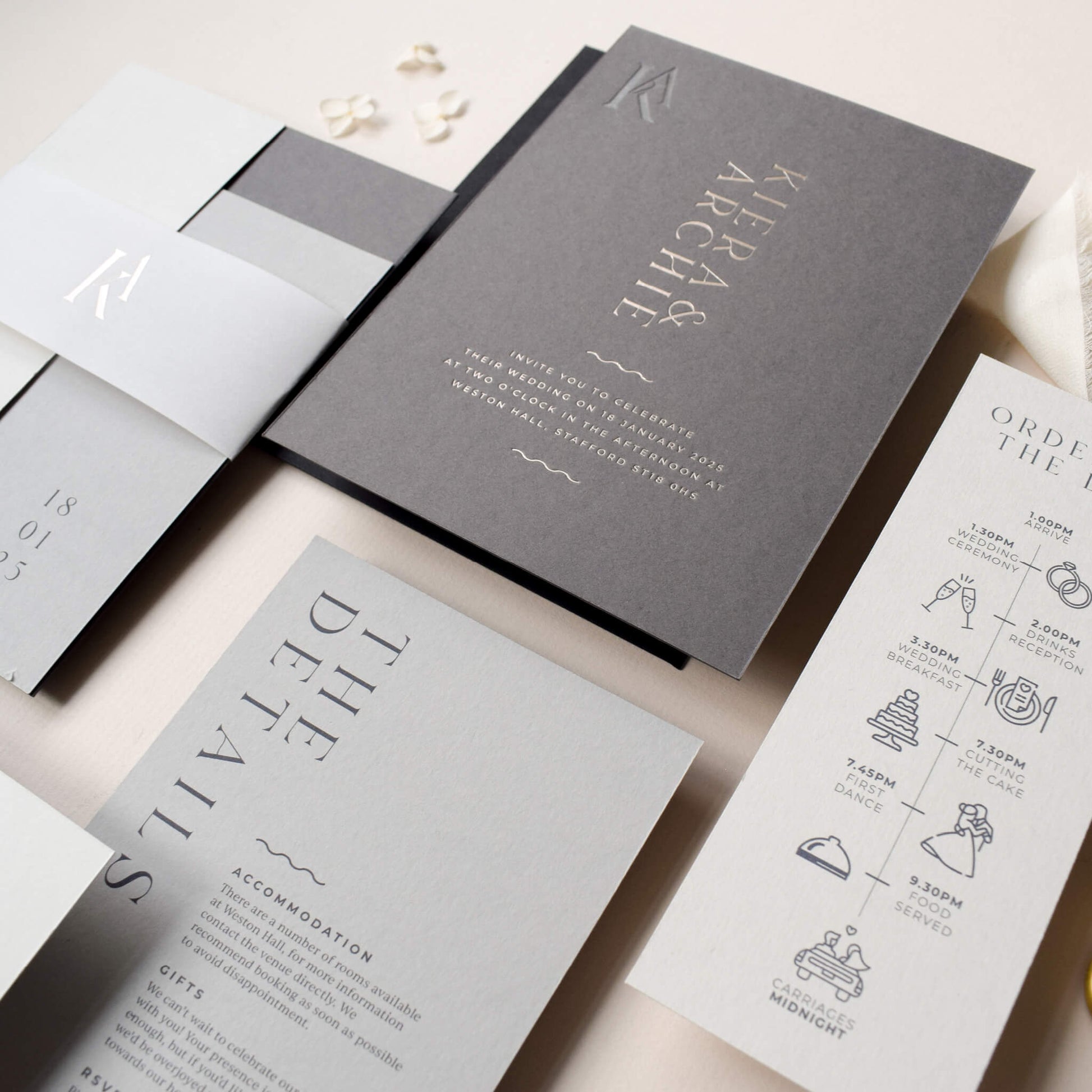 My semi-custom wedding stationery collections have been created to give you a design to base your invitations on, if you wish you can change various elements to make them unique and to reflect your personality and style. As well as changing the wording you are also able to change the colour of the paper, foil, print, envelopes and include various additional elements to enhance your stationery.