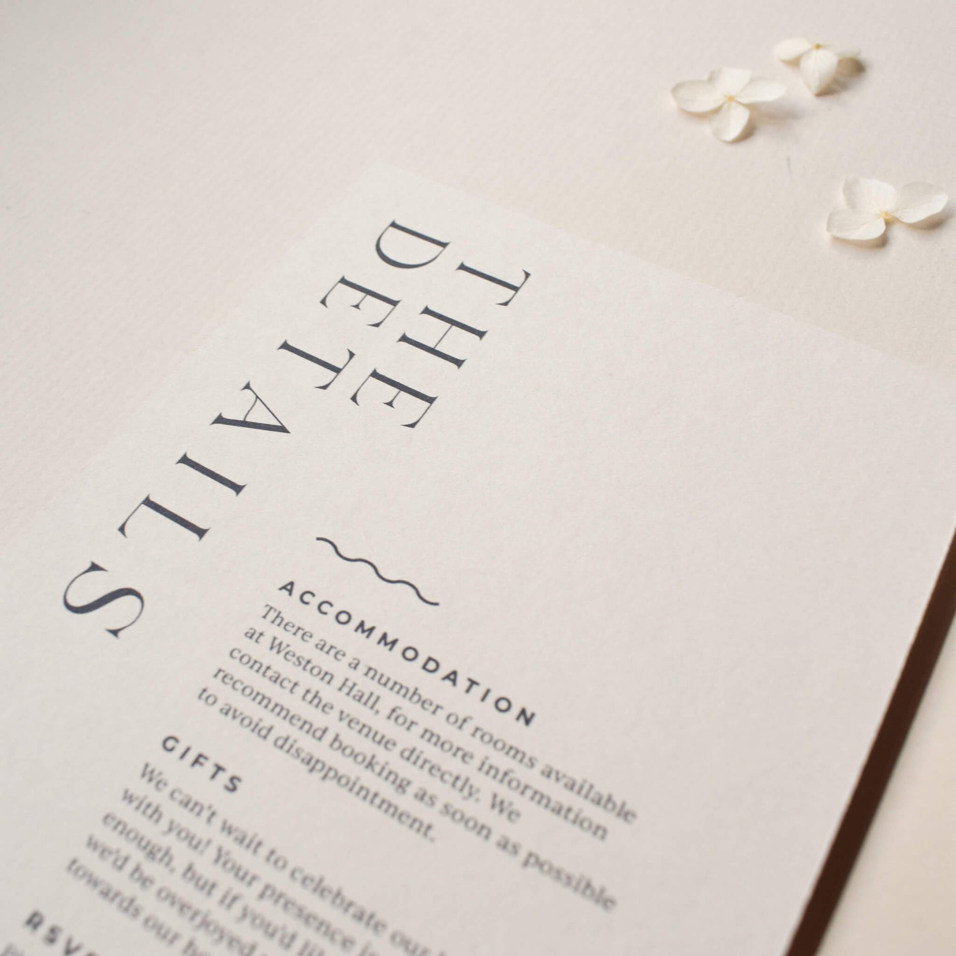 This double-sided A6 card from the Aliferous Collection offers ample space to convey all essential details for your guests. On one side, crucial information is elegantly presented, ensuring clarity and sophistication. On the reverse your wedding date is displayed with refined elegance. Embracing modern convenience, the Aliferous suite allows for personalisation, offering the option to include a QR code, website address or any other information you would like to include.