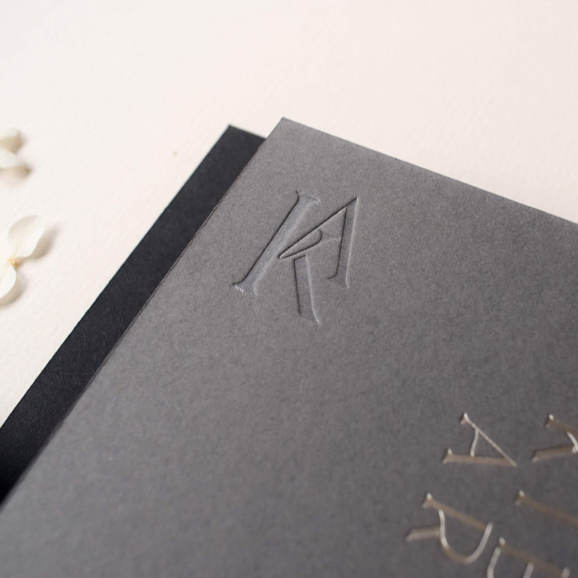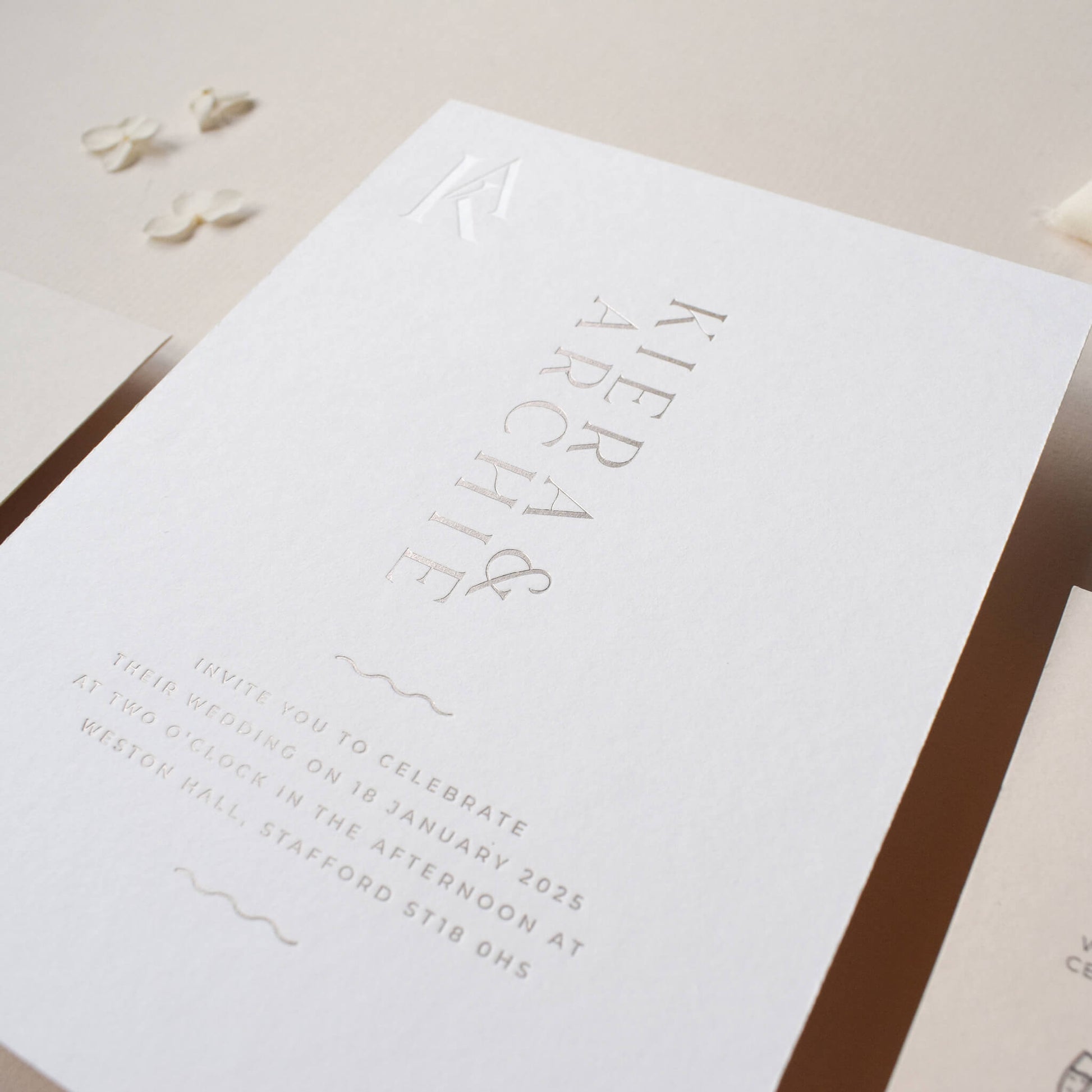 The enchanting Aliferous wedding stationery invitation, where minimalism meets timeless elegance. Your names take centre stage, delicately crafted in bespoke typography and printed in hot foil for a touch of opulence and luxury. Beneath, wedding details are presented with utmost simplicity, framed by gentle wavy lines, exuding a sense of modern refinement. A bespoke monogram graces the top corner, adding a personal touch to this clean and sophisticated ensemble. With its classic heart and contemporary flair, the Aliferous wedding stationery suite captures the essence of romance and refinement, making it the perfect choice for couples seeking understated yet exquisite wedding stationery.