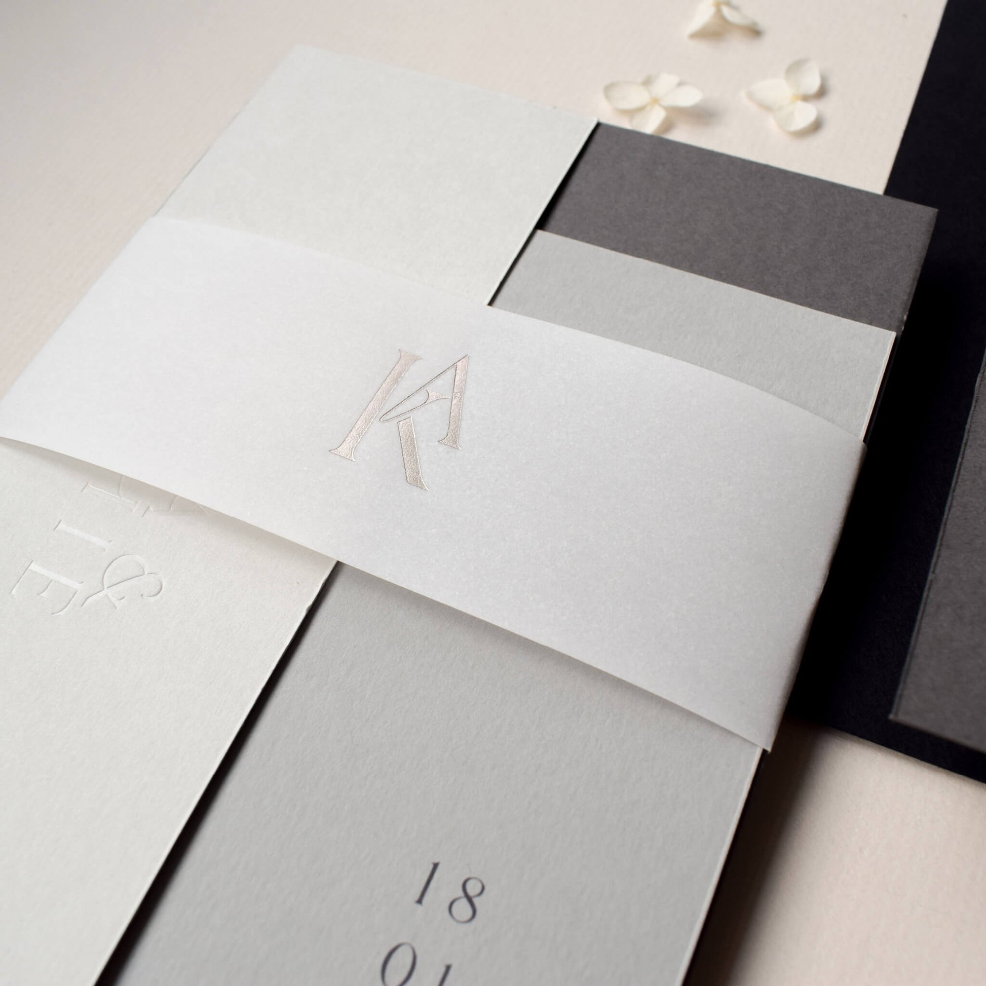 Elevate your wedding stationery suite with the perfect finishing touch: a captivating vellum band that encapsulates the essence of simplicity and elegance. This enchanting addition features your bespoke monogram, delicately printed in hot foil, adding a touch of luxury and personalisation to your invitations. Designed to collate your stationery suite effortlessly, the vellum band keeps each component neatly compiled, allowing your guests to unveil the layers of your invitation suite. With this exquisite detail, the Aliferous collection ensures that your wedding stationery not only reflects your style but also creates an unforgettable impression, setting the tone for a celebration filled with love, beauty, and cherished memories.