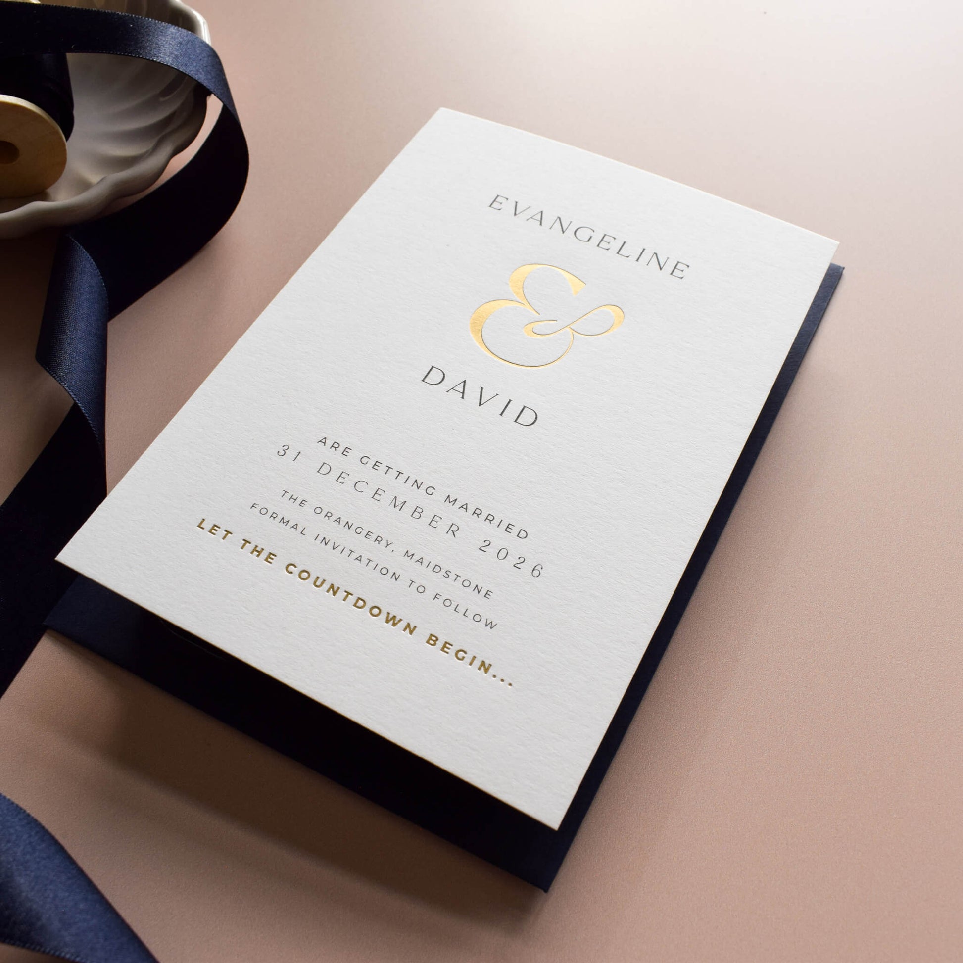 Ordering a Save the Date sample allows you to experience the design, paper quality and foil finish before placing your full personalised wedding stationery order. Seeing your stationery in person is the best way to appreciate the premium materials and subtle detail of the hot foil printing.