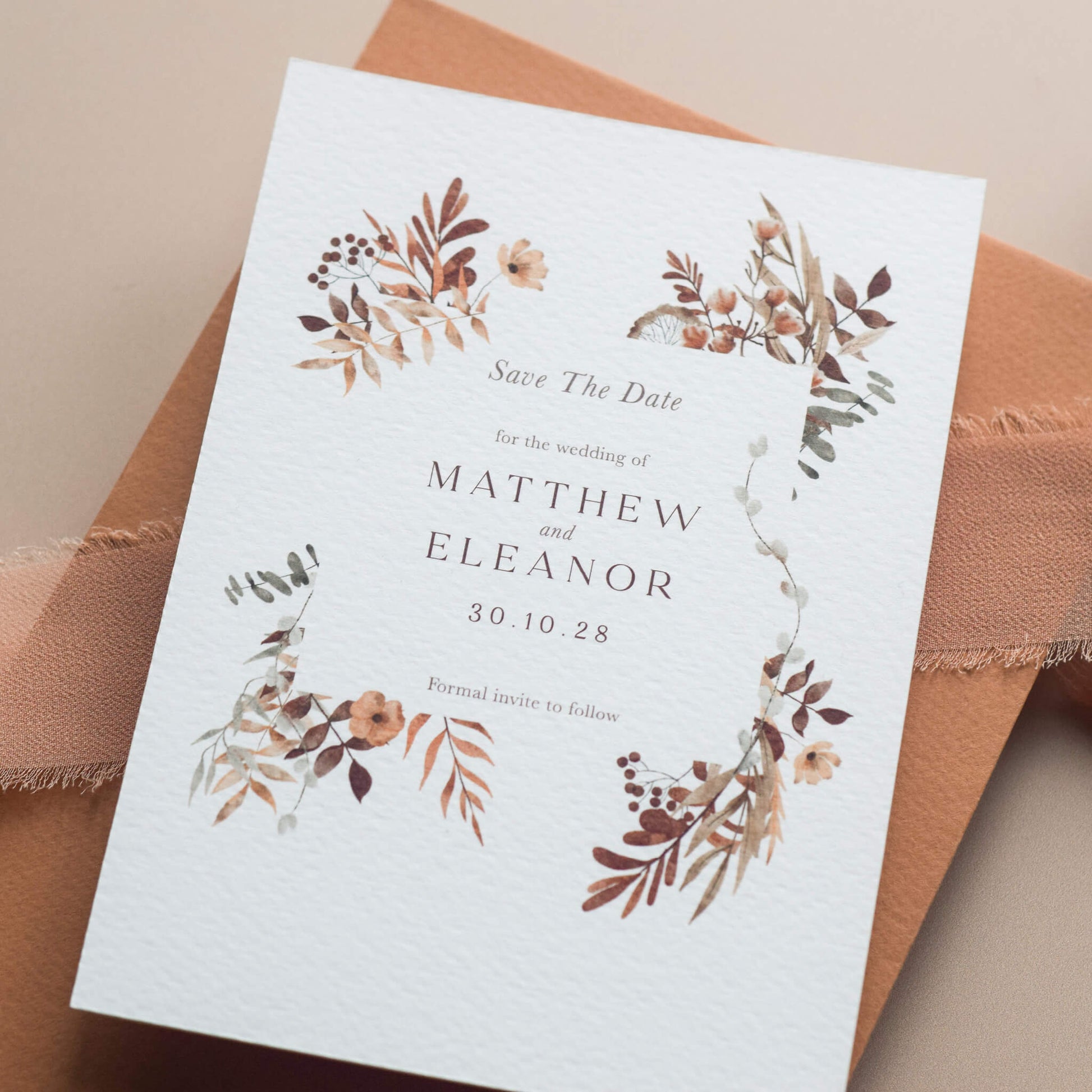 Each element feels natural and thoughtfully balanced, combining painterly detail with clean, timeless design.This save the date card is sized A6 (105mm x 148mm) and is printed onto smooth, tactile paper.