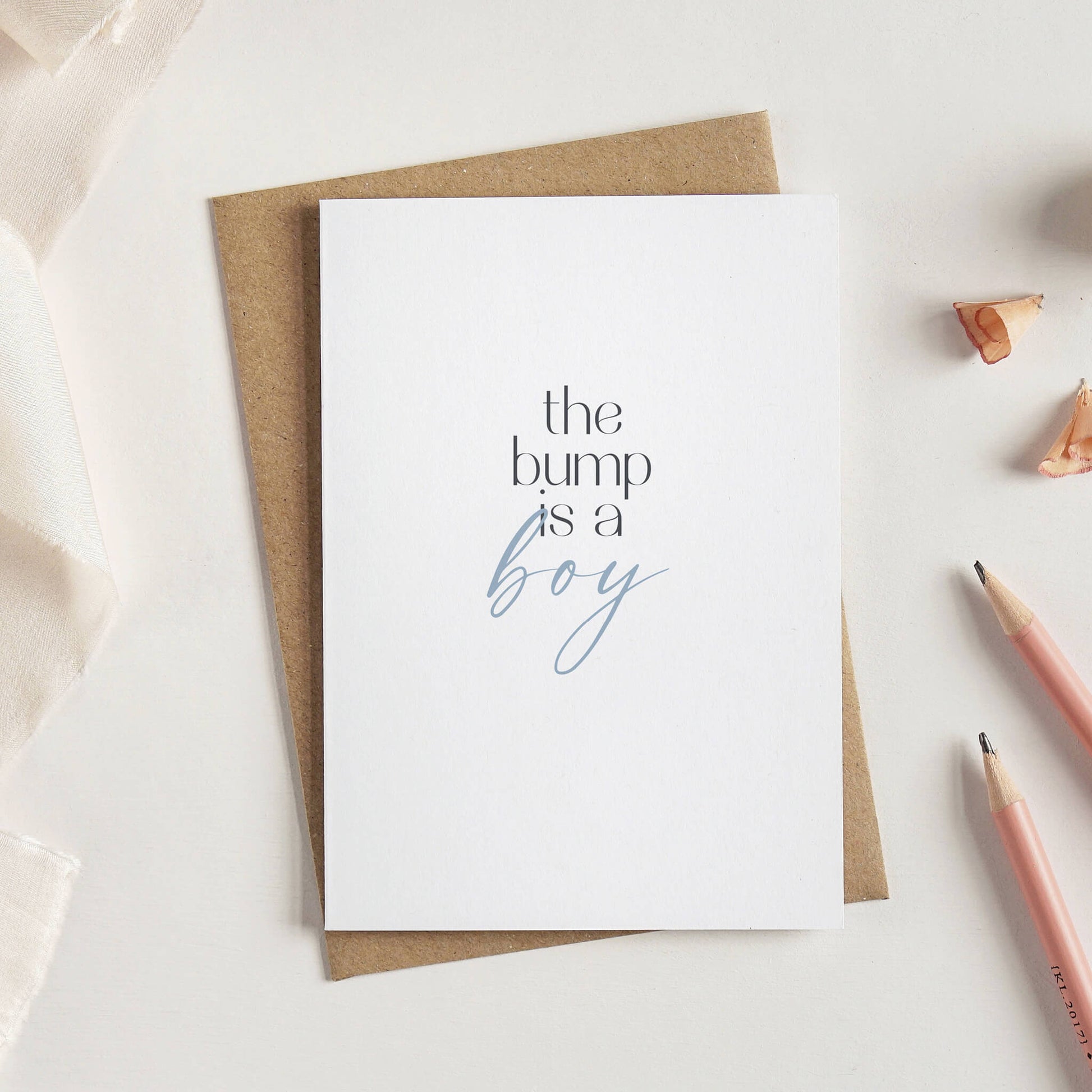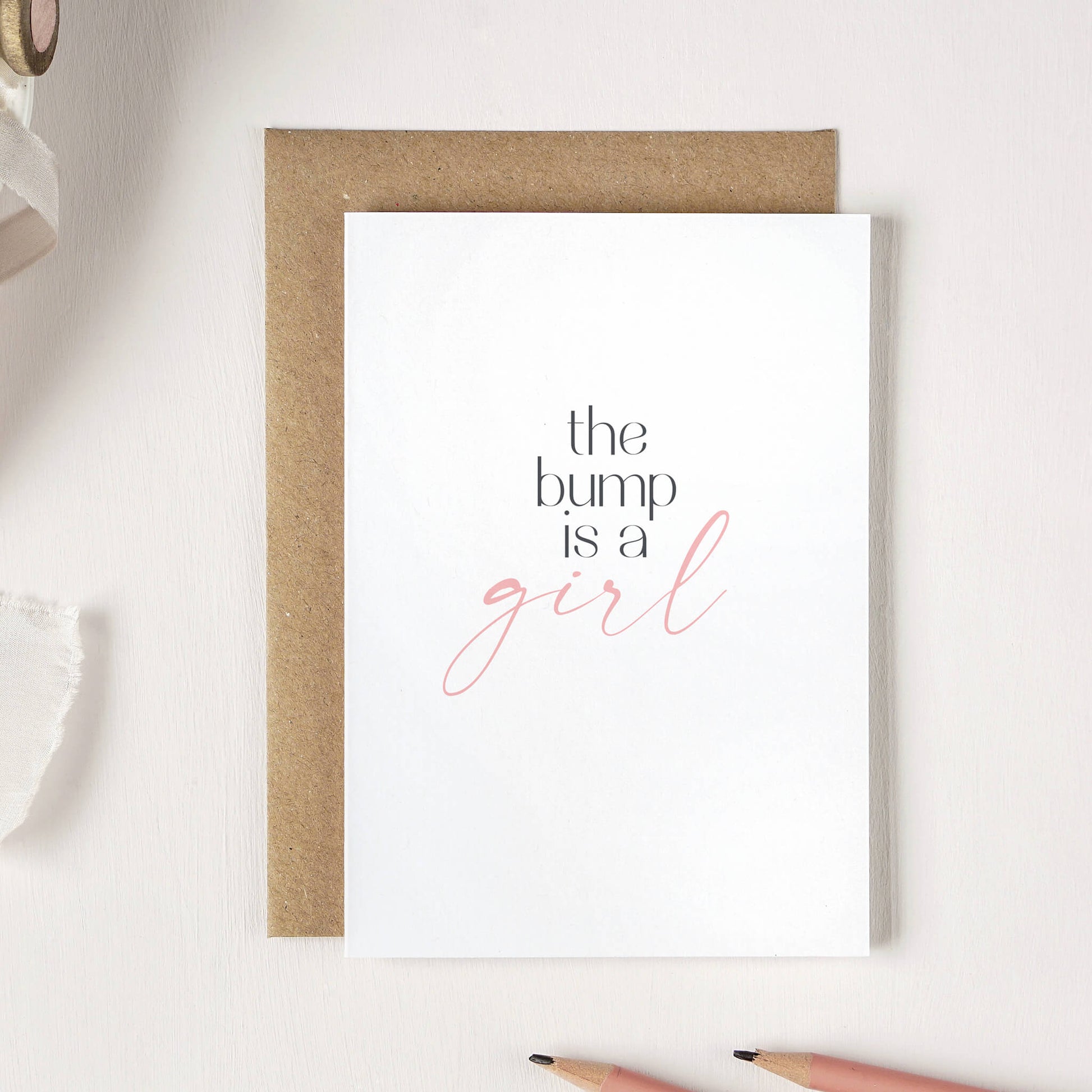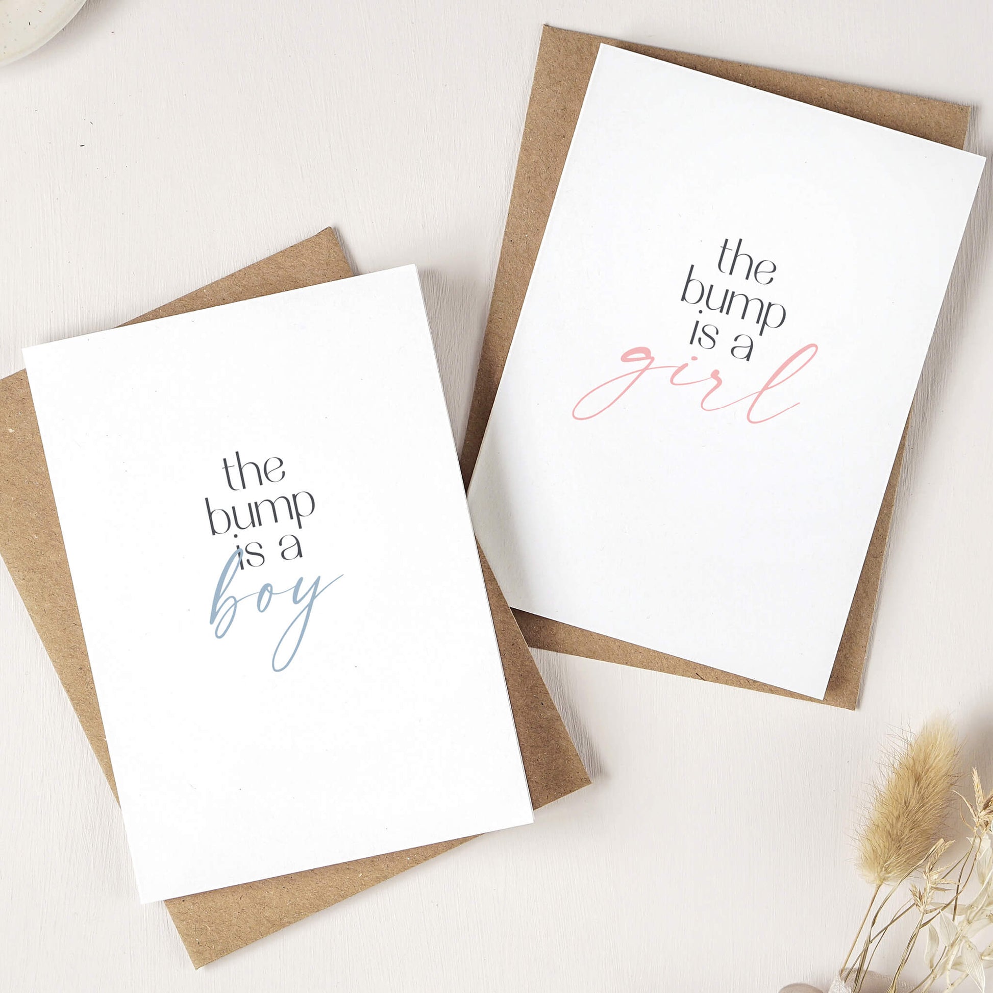 My ‘The bump is a girl / boy’ card is a lovely card to send to a friend who has just found out the gender of her baby. However, it is most often bought as a way to reveal the gender of a baby to friends and family.
