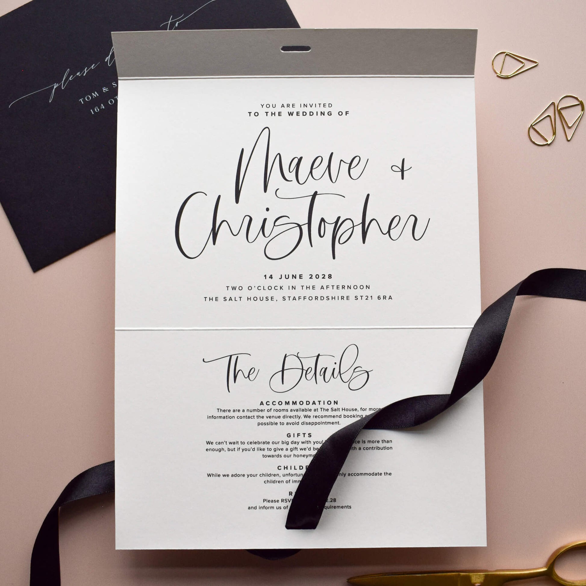 The Cadence Wedding Invitation is a romantic and expressive design, combining flowing modern calligraphy with clean, contemporary typography. Finished with an elegant ribbon tie, this invitation feels both joyful and refined, offering a beautiful sense of ceremony from the very first moment.