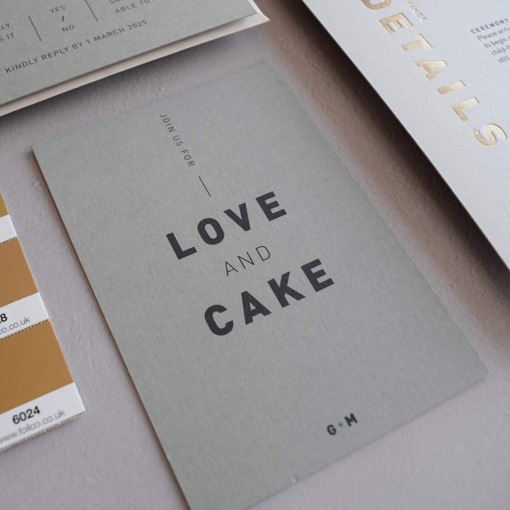 The captivating Elysian RSVP Card is sized A7 (105mm x 74mm) and crafted on premium heavyweight paper, this card promises to leave a lasting impression. Your guests will find RSVP details thoughtfully provided on one side, while the reverse elegantly showcases the phrase 'Join us for love and cake.' Should you desire, this text can be personalised to make it uniquely yours, truly reflecting your wedding style.
