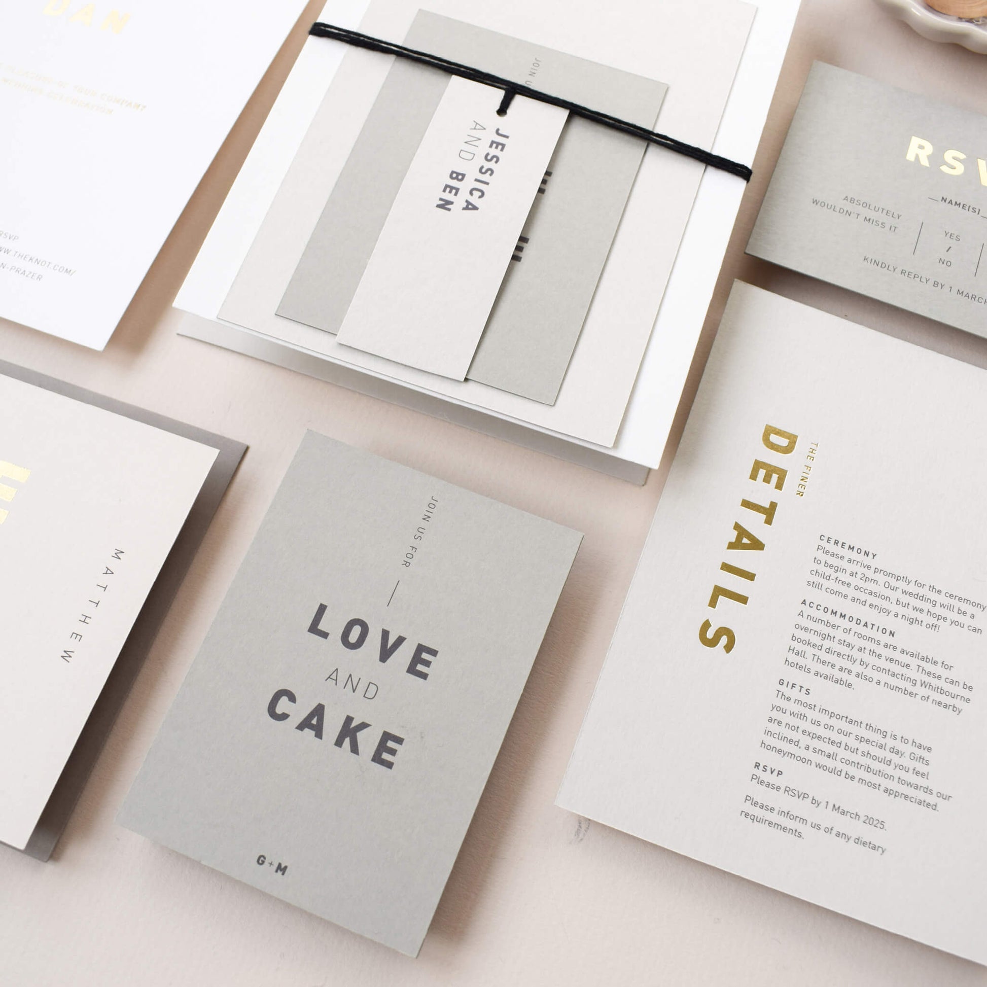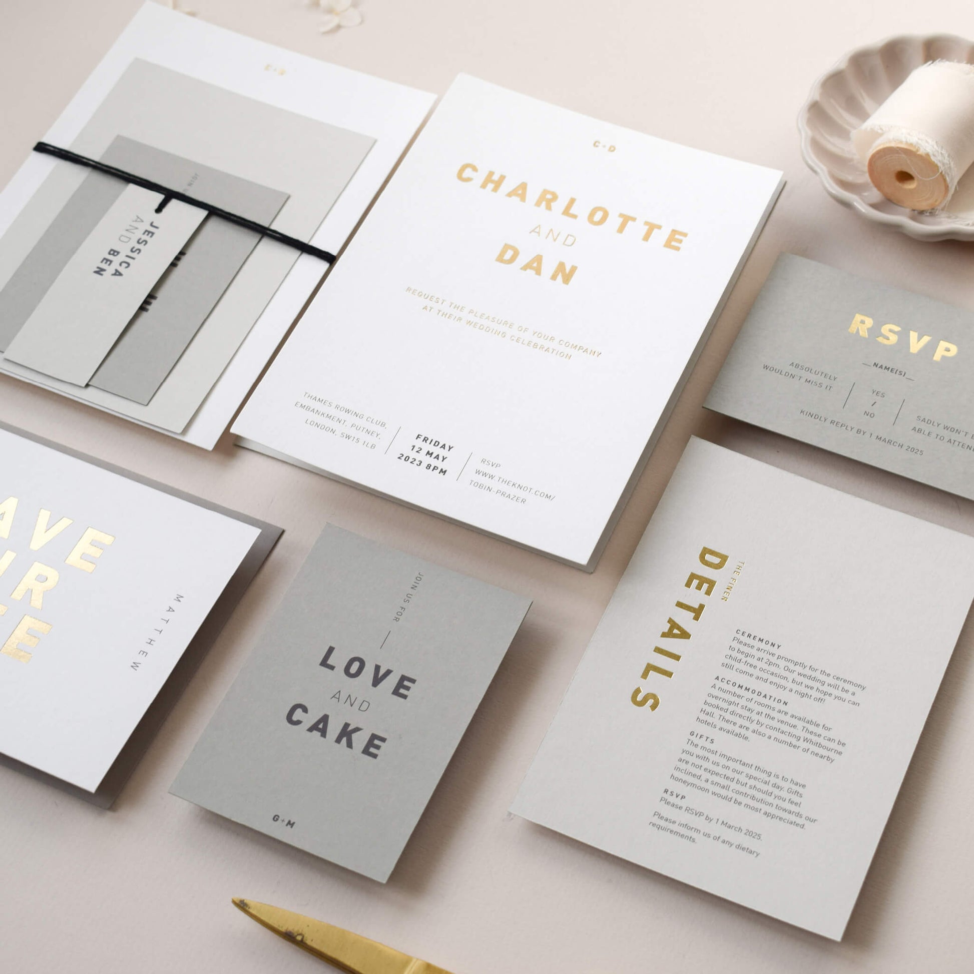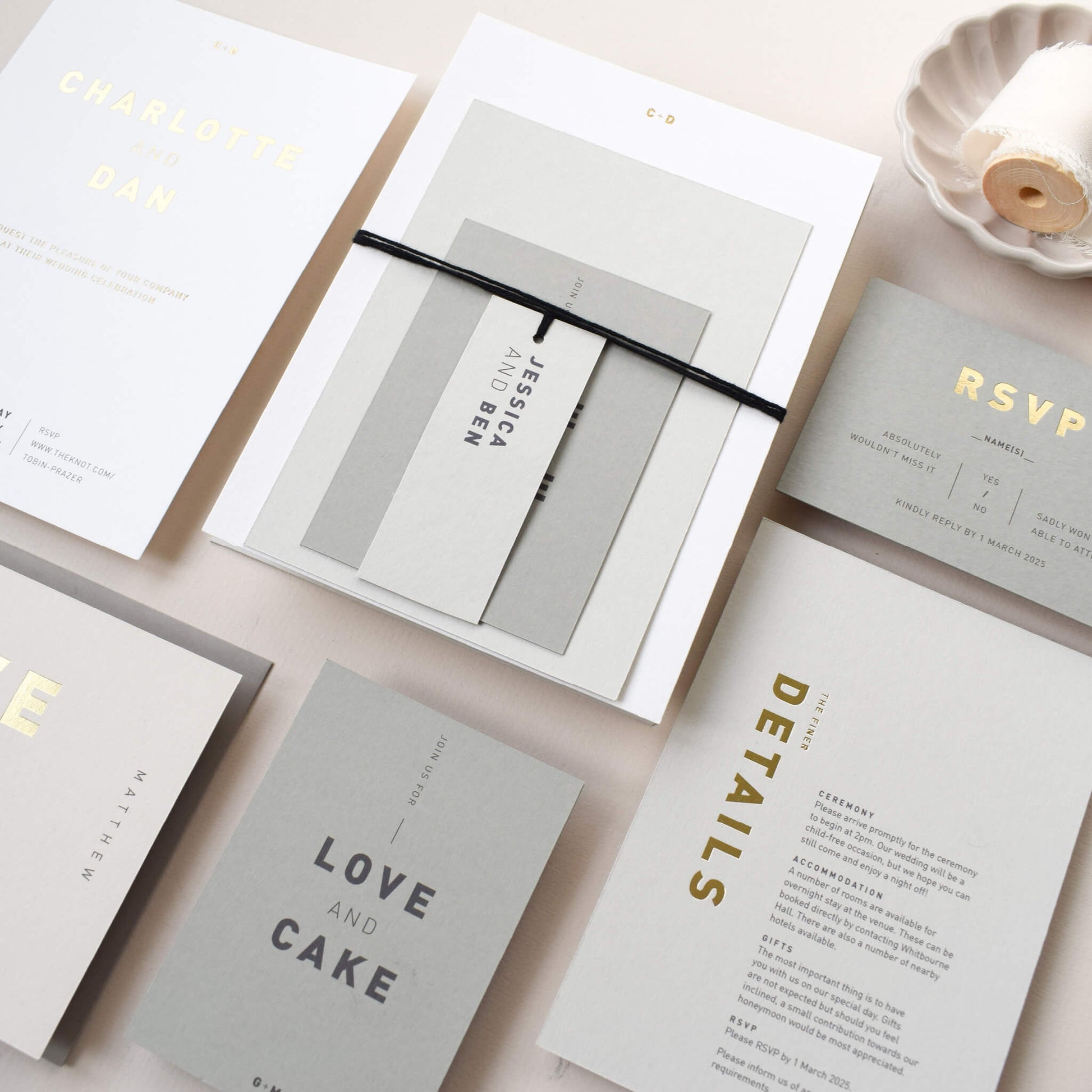 My semi-custom wedding stationery collections have been created to give you a design to base your invitations on, if you wish you can change various elements to make them unique and to reflect your personality and style. As well as changing the wording you are also able to change the colour of the paper, foil, print, envelopes and include various additional elements to enhance your stationery.