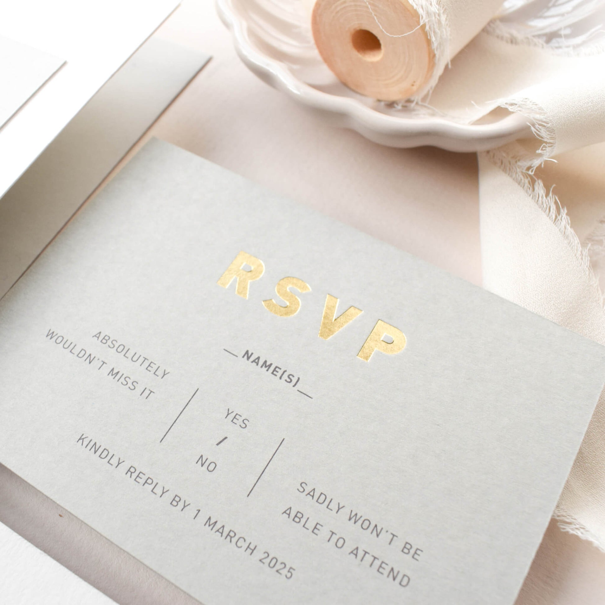 For a touch of opulence, hot foil detailing has been incorporated, with 'RSVP' beautifully debossed and printed in gold foil, as illustrated in the images. The luxurious hot foil printing method involves creating a metal plate of the design, resulting in a mesmerizing shine and a delightful tactile indentation that exudes unparalleled elegance.