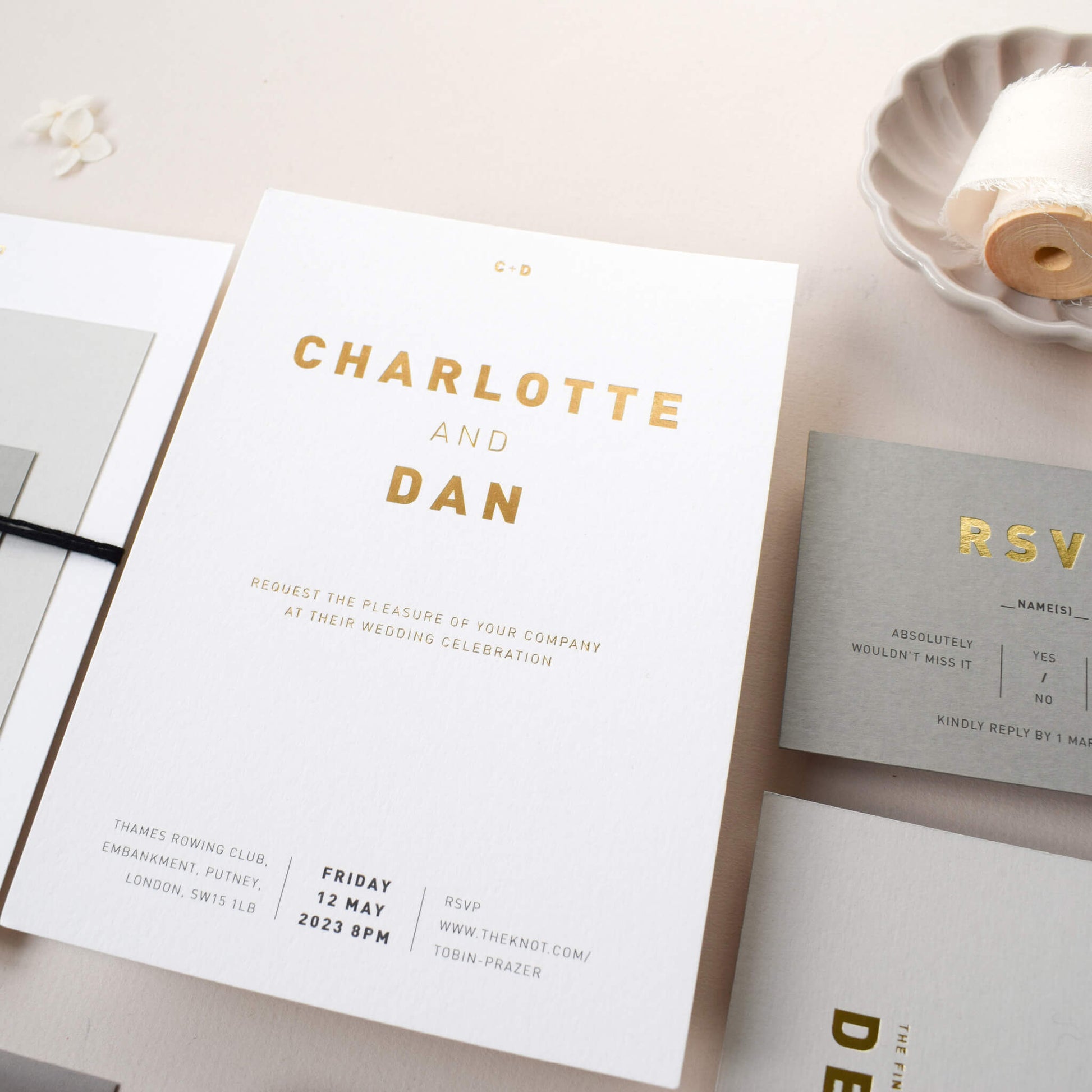 5x7, digital print and hot foil (gold) on natural white card, with an almond envelope.