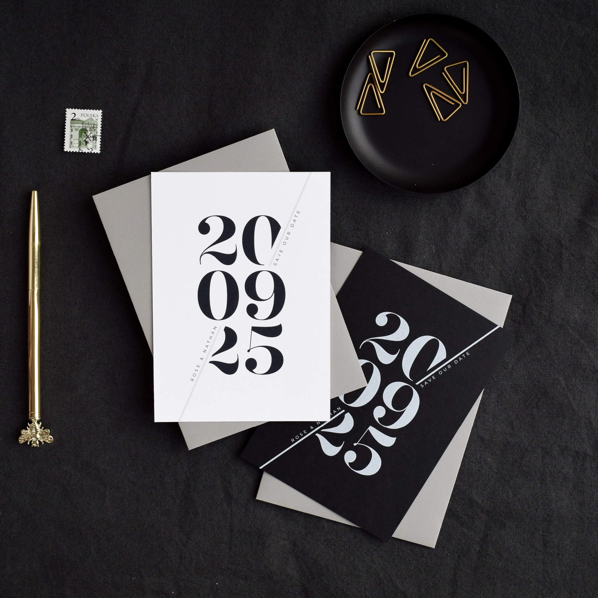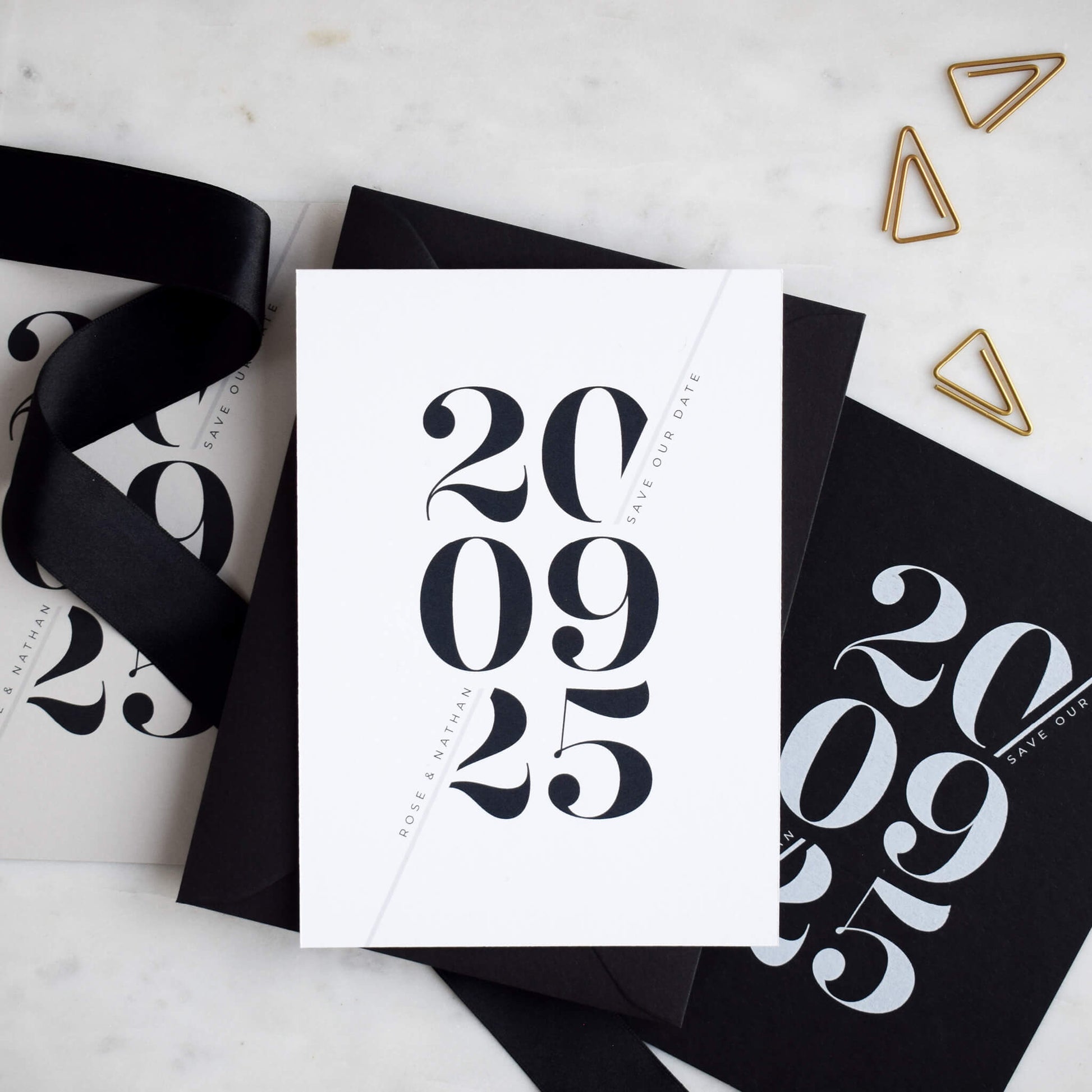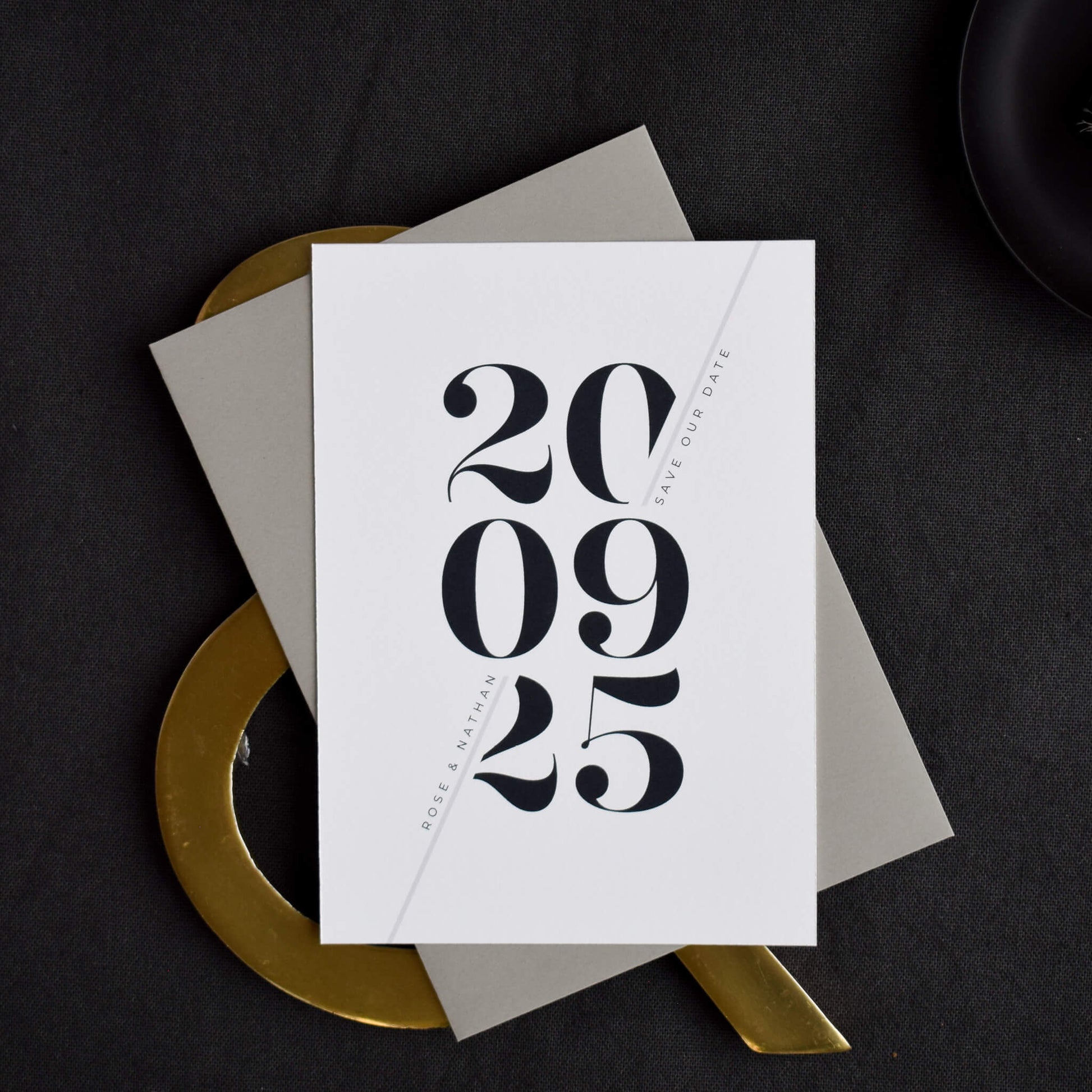 The striking Equinox Save the Date is a captivating display of bold and modern design. Measuring A6 (105mm x 148mm), this save the date card is meticulously printed on premium heavyweight tactile paper, promising a luxurious tactile experience.