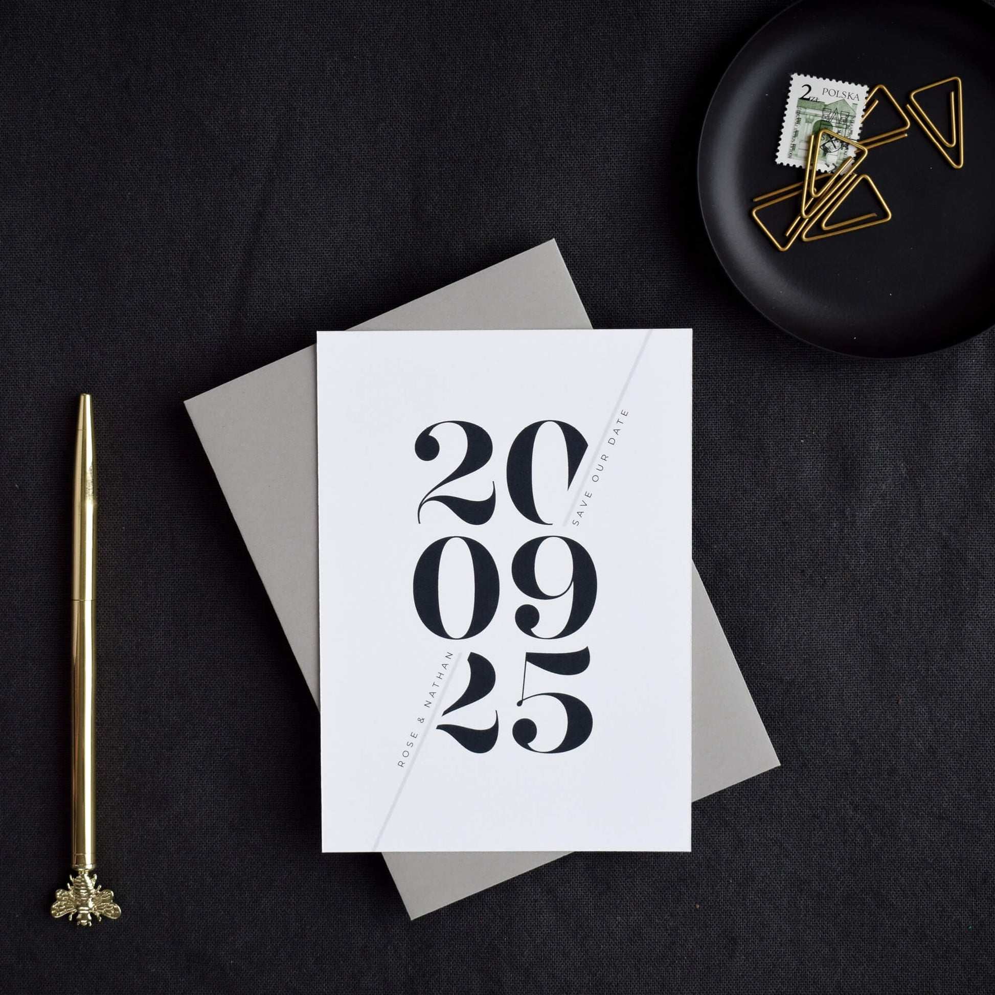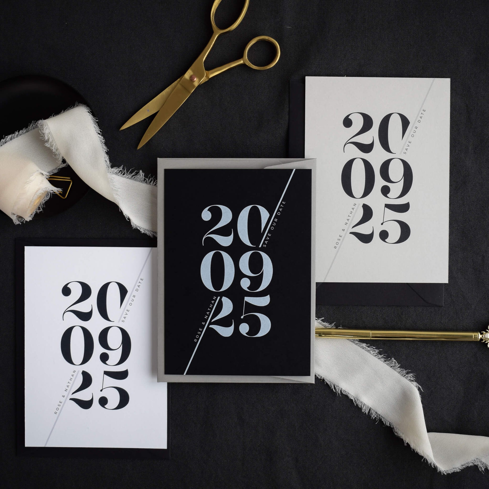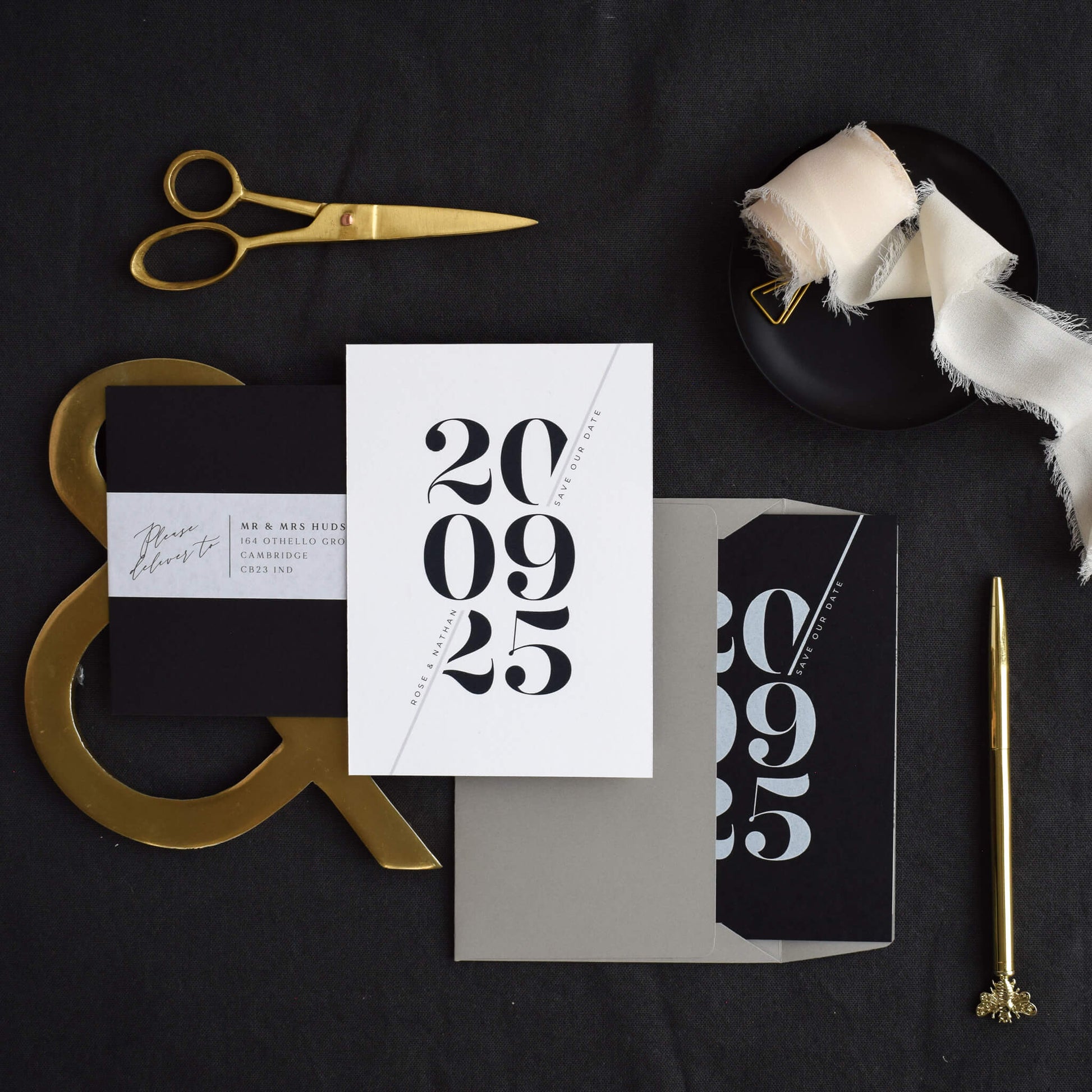 The striking Equinox Save the Date is a captivating display of bold and modern design. Measuring A6 (105mm x 148mm), this save the date card is meticulously printed on premium heavyweight tactile paper, promising a luxurious tactile experience.