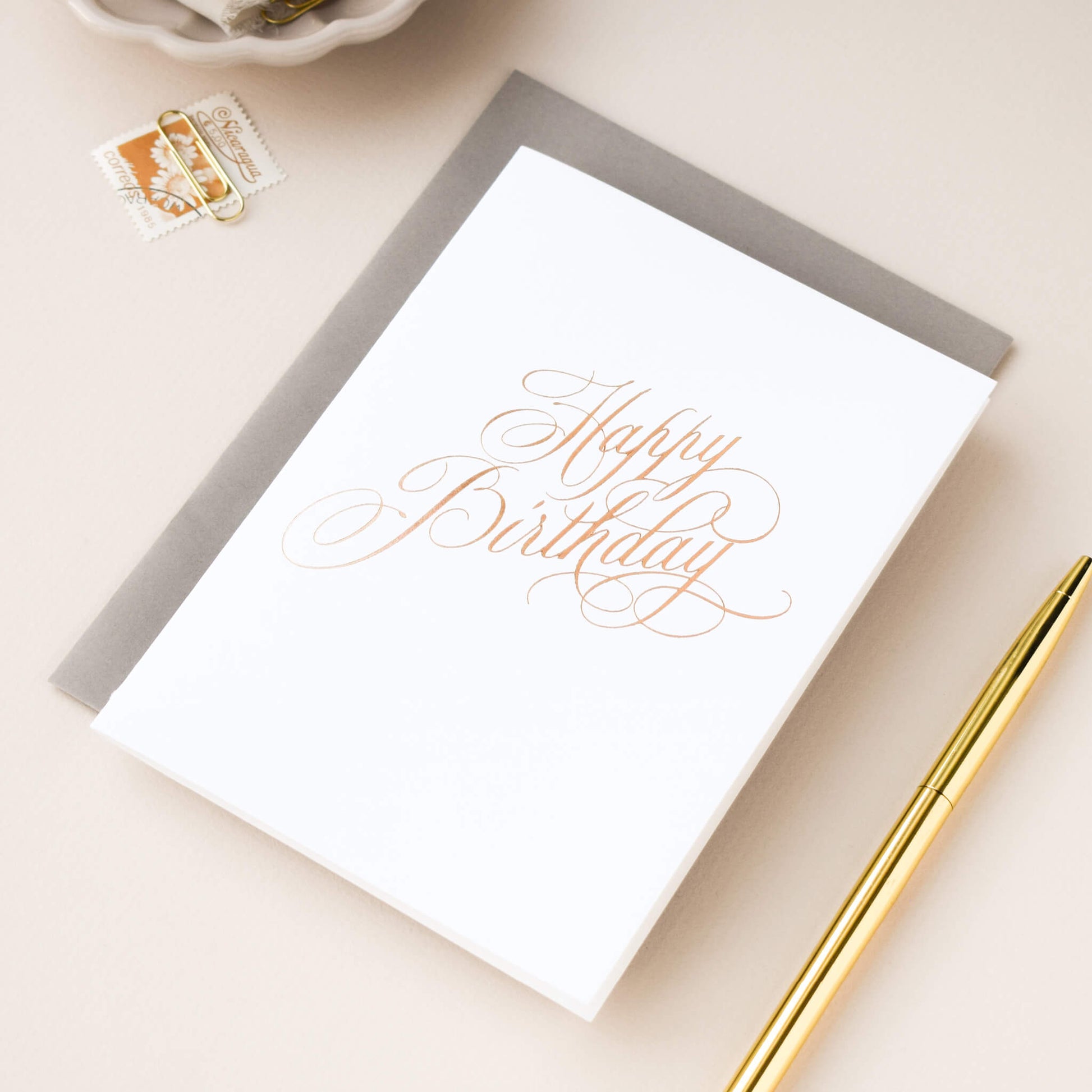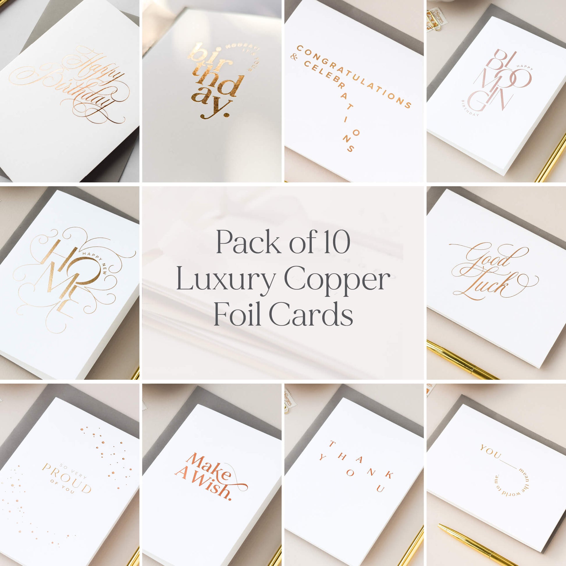 This luxury copper foil card bundle contains the following copper foil birthday cards: Calligraphy Happy Birthday, Make A Wish, Hooray It’s Your Birthday, Happy Blooming Birthday, Congratulations and Celebrations, Good Luck, New Home, So Very Proud Of You, You Mean The World and Thank You.