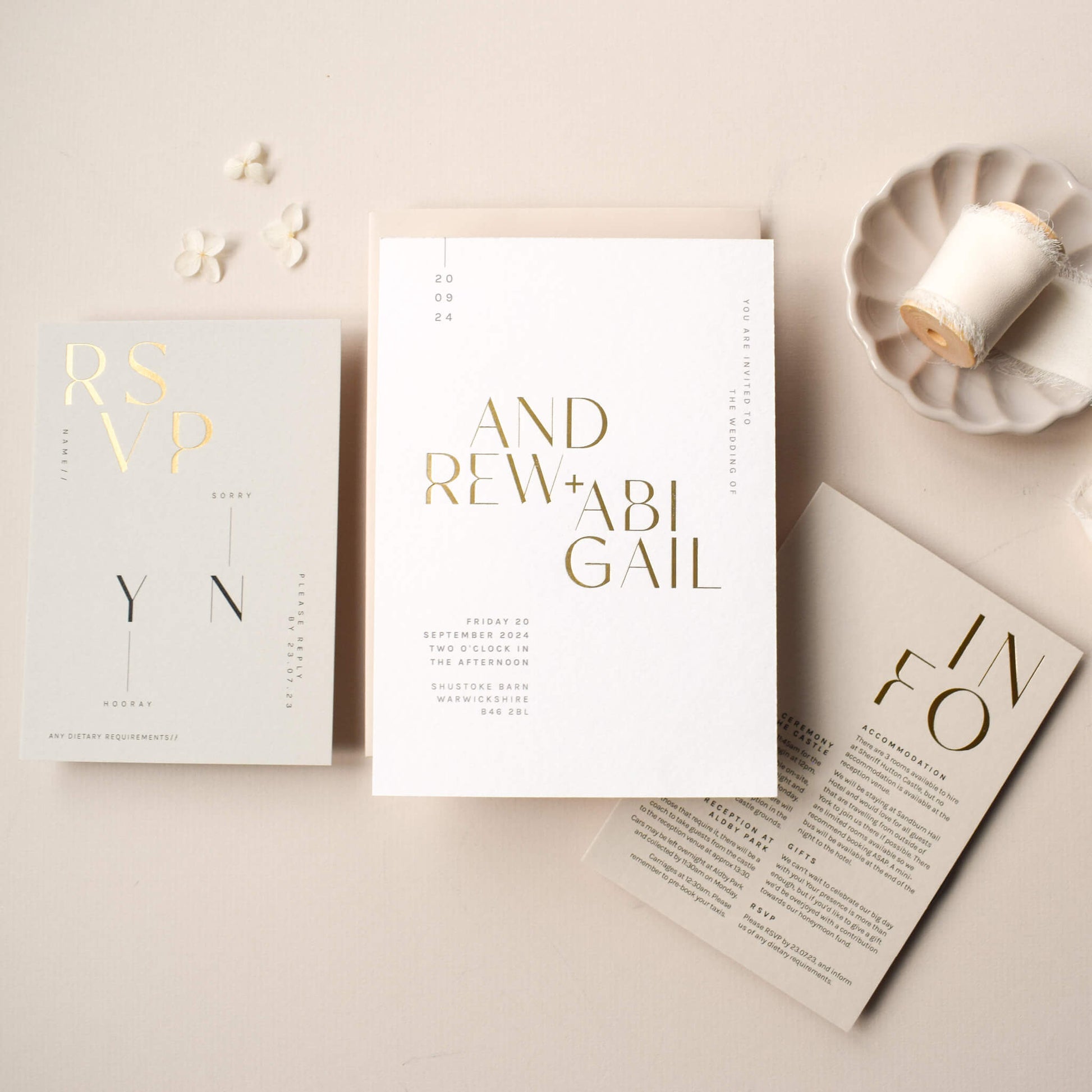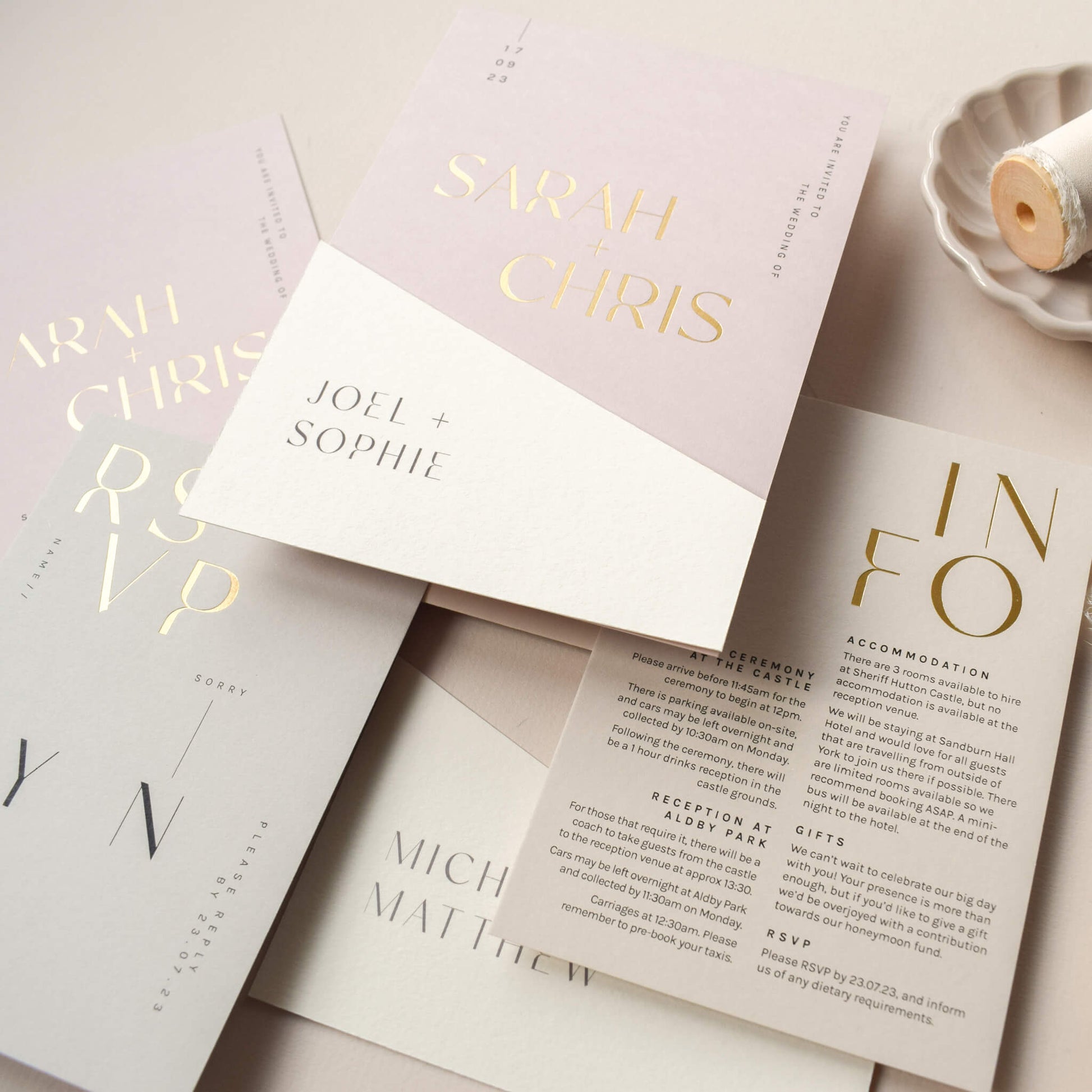 My semi-custom wedding stationery collections have been created to give you a design to base your invitations on, if you wish you can change various elements to make them unique and to reflect your personality and style. As well as changing the wording you are also able to change the colour of the paper, foil, print, envelopes and include various additional elements to enhance your stationery.