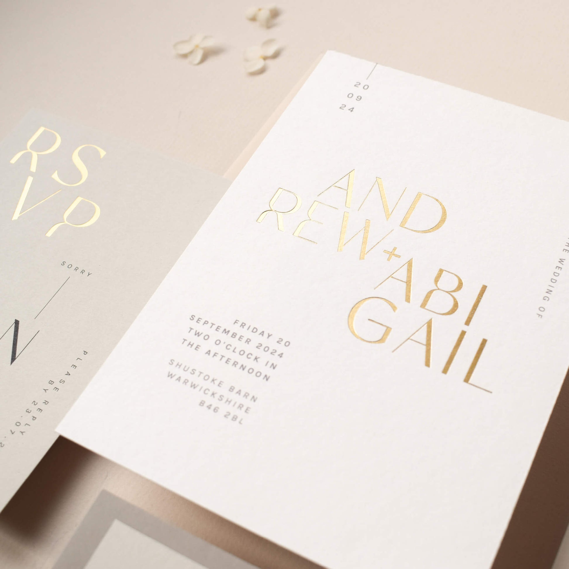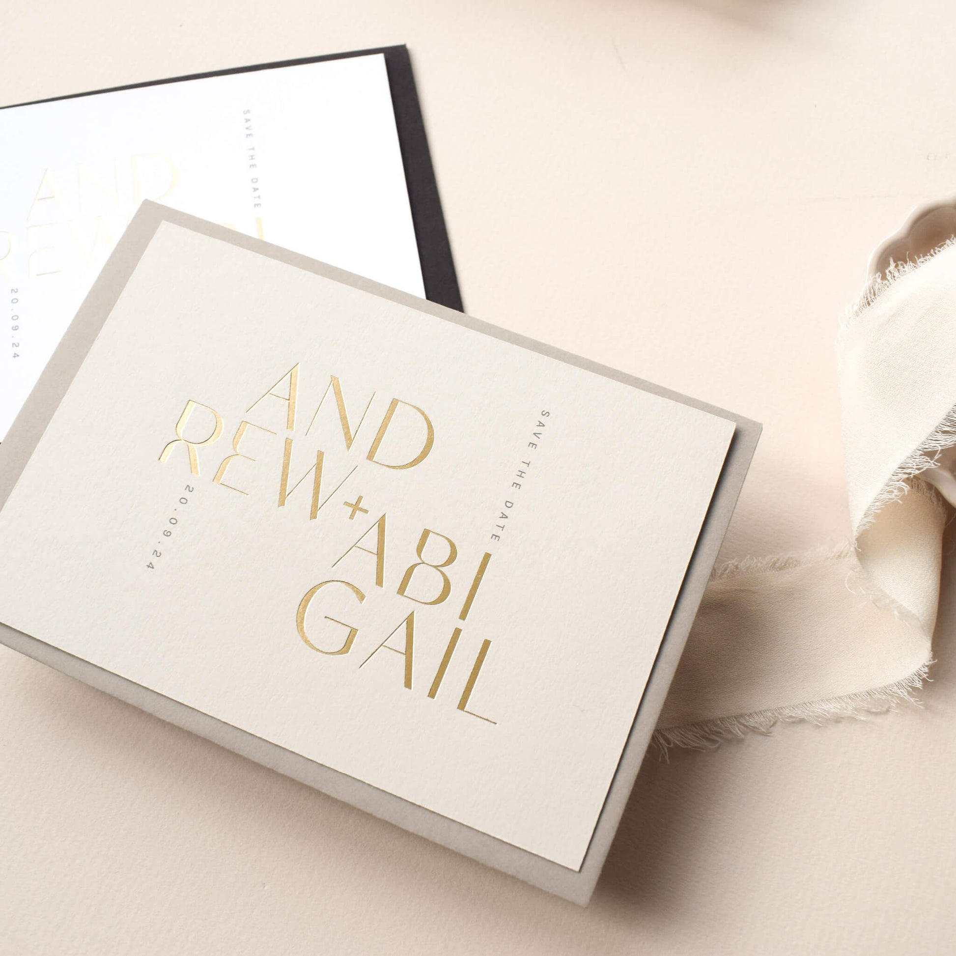 For a truly sumptuous invitation, your names will be beautifully printed in hot foil, as showcased in the images. This exquisite printing method involves creating a metal plate of the design, resulting in a mesmerising shine that dances on the surface of the paper, leaving behind a wonderfully tactile indentation that feels truly magical.