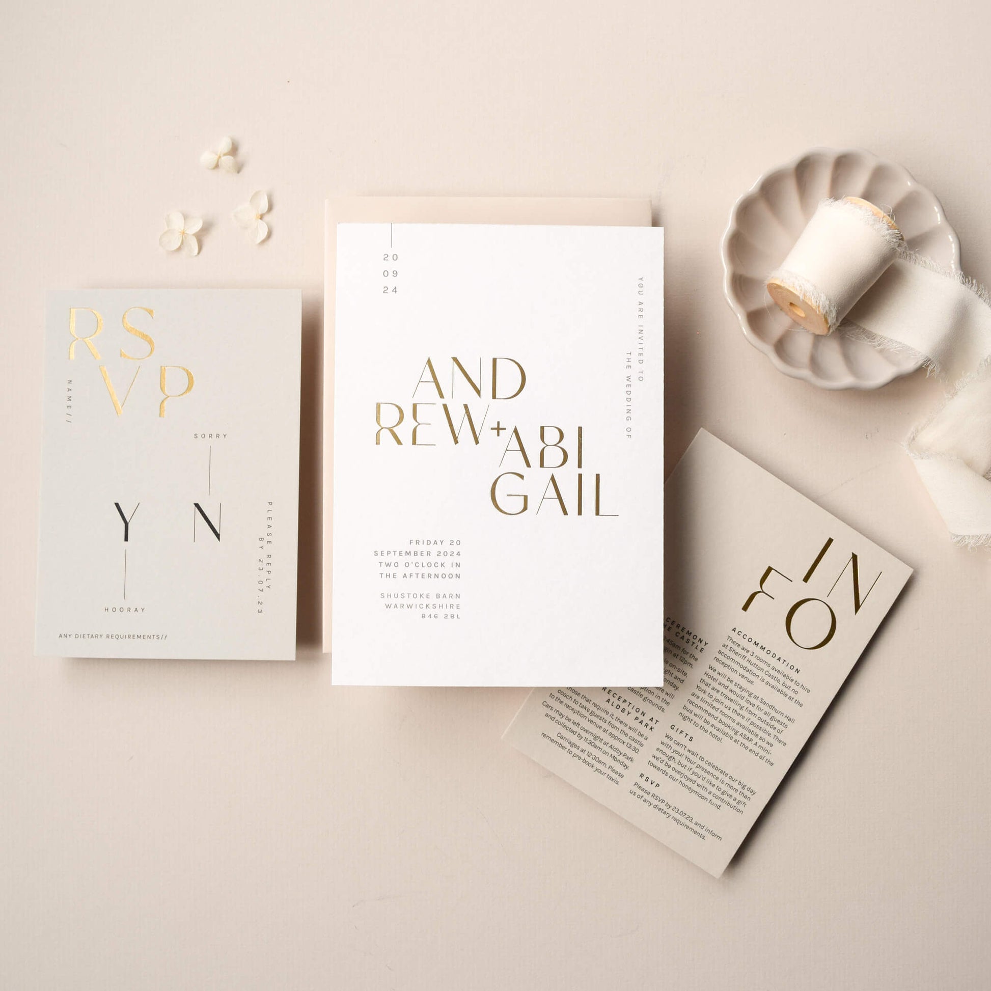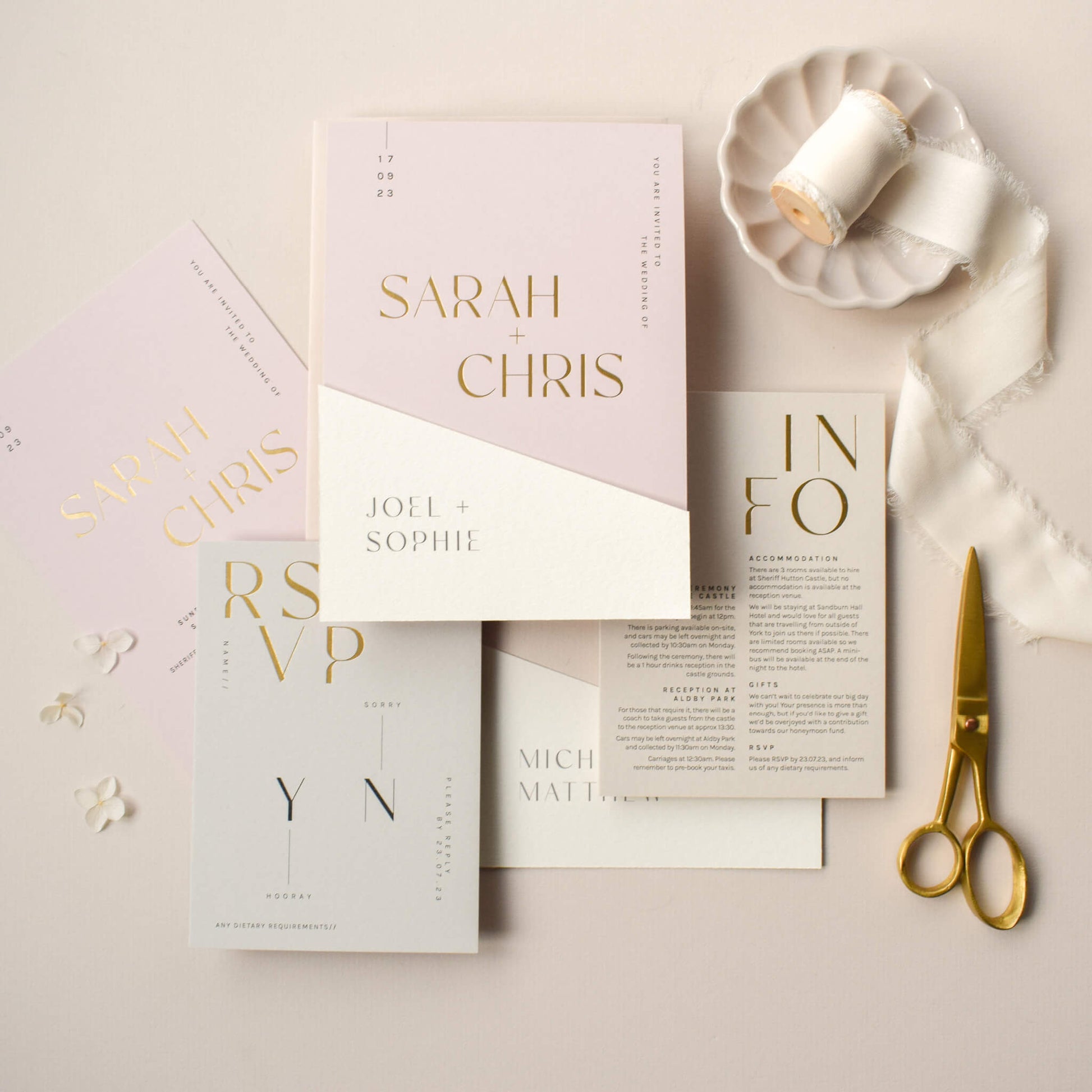 My semi-custom wedding stationery collections have been created to give you a design to base your invitations on, if you wish you can change various elements to make them unique and to reflect your personality and style. As well as changing the wording you are also able to change the colour of the paper, foil, print, envelopes and include various additional elements to enhance your stationery.