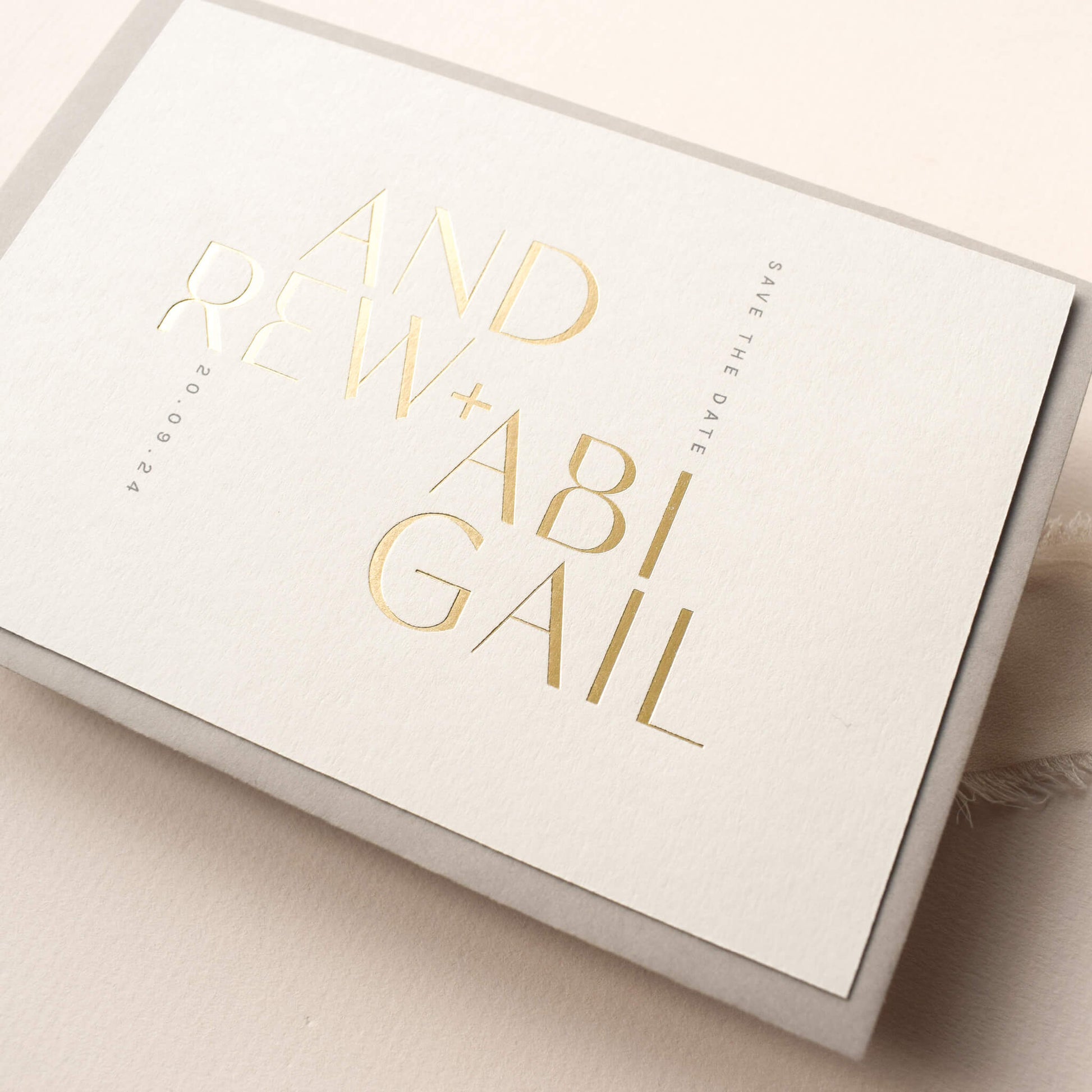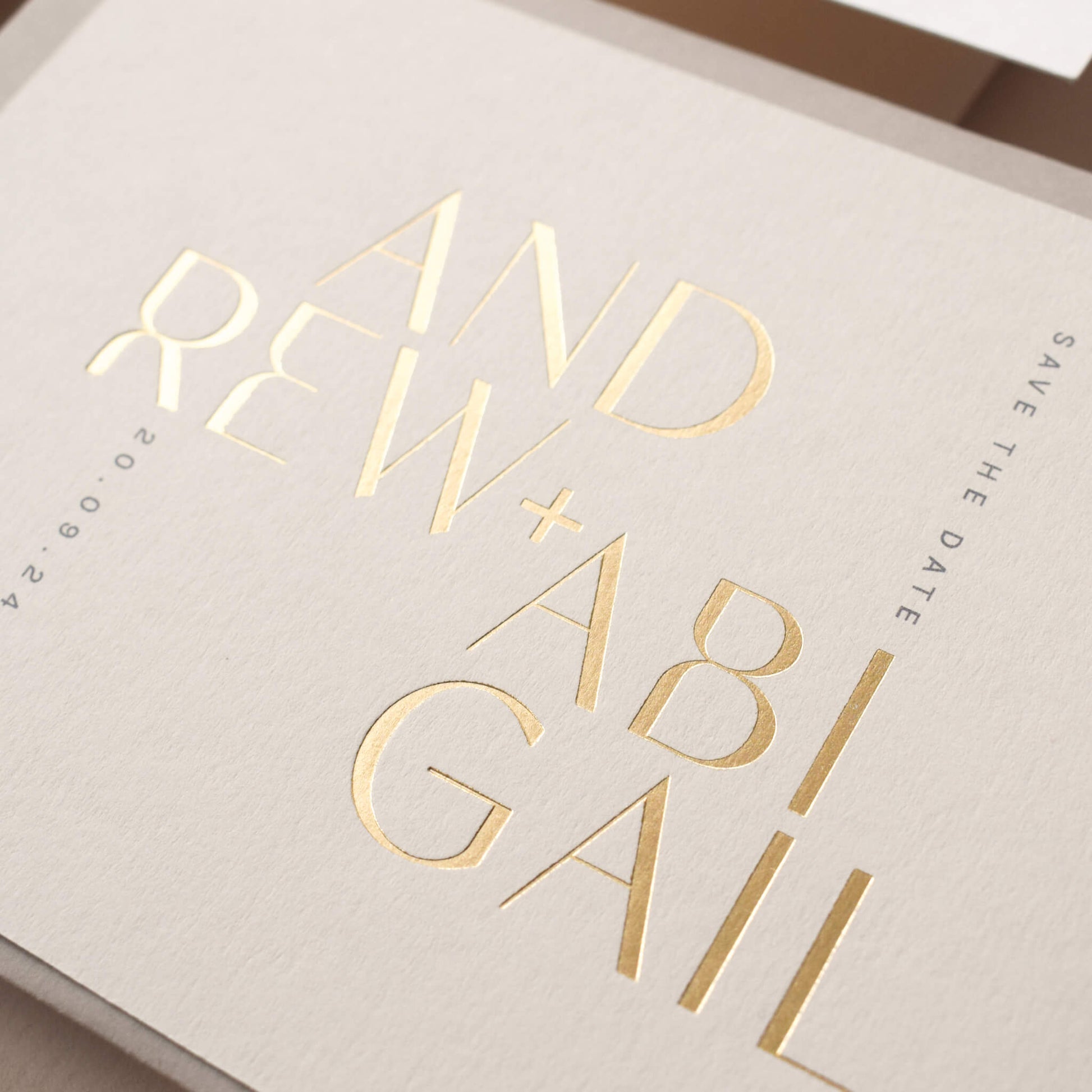 The Reverie Save The Date Card is available in three beautiful colours - white, pale grey, or mist, each offering a distinct charm. Personalise your card with the names printed in gold foil for a regal shine or opt for the subtle allure of transparent foil.