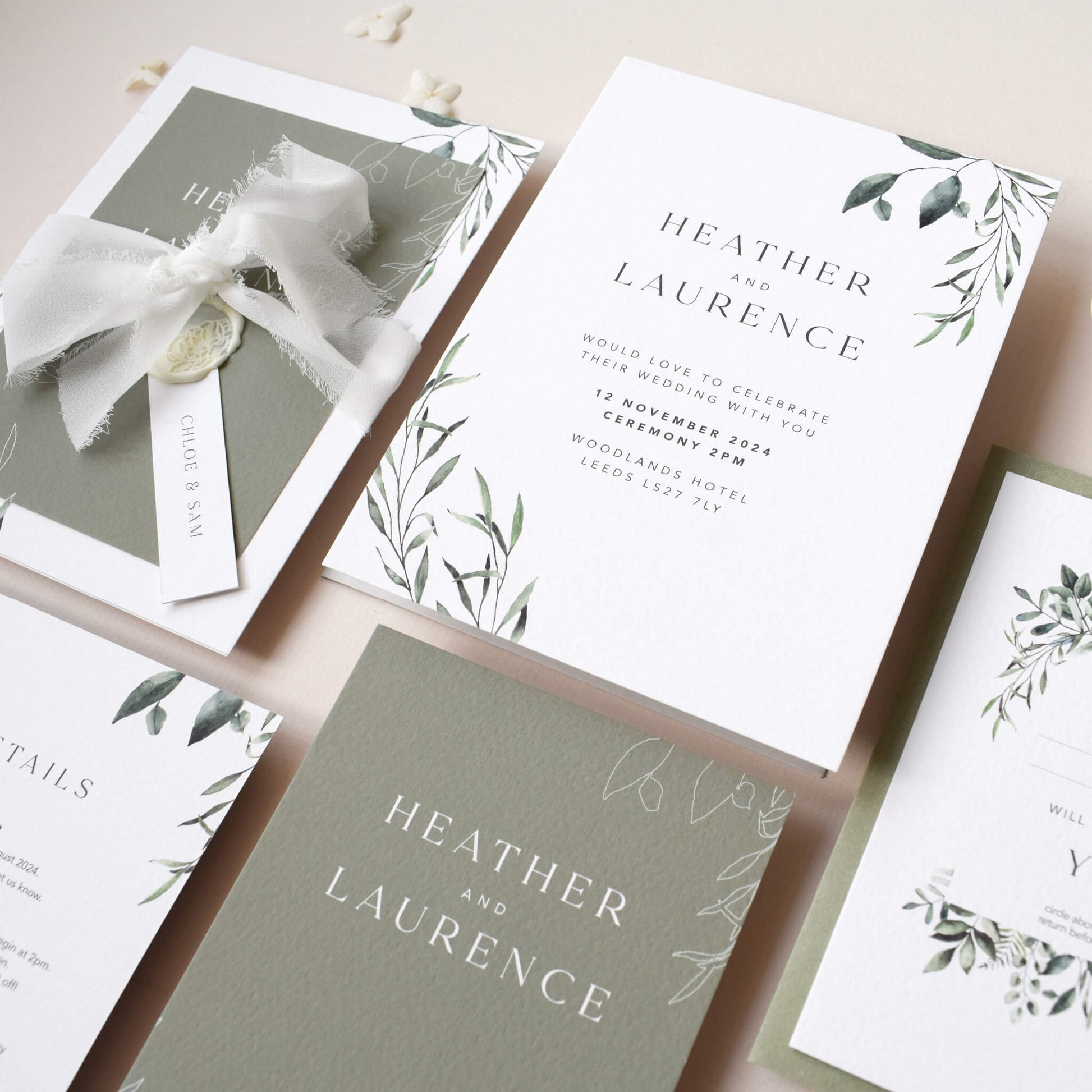 Each Verdant Invitation is thoughtfully accompanied by a choice of a dove grey envelope or a sage green envelope, reflecting the timeless charm of your special day.