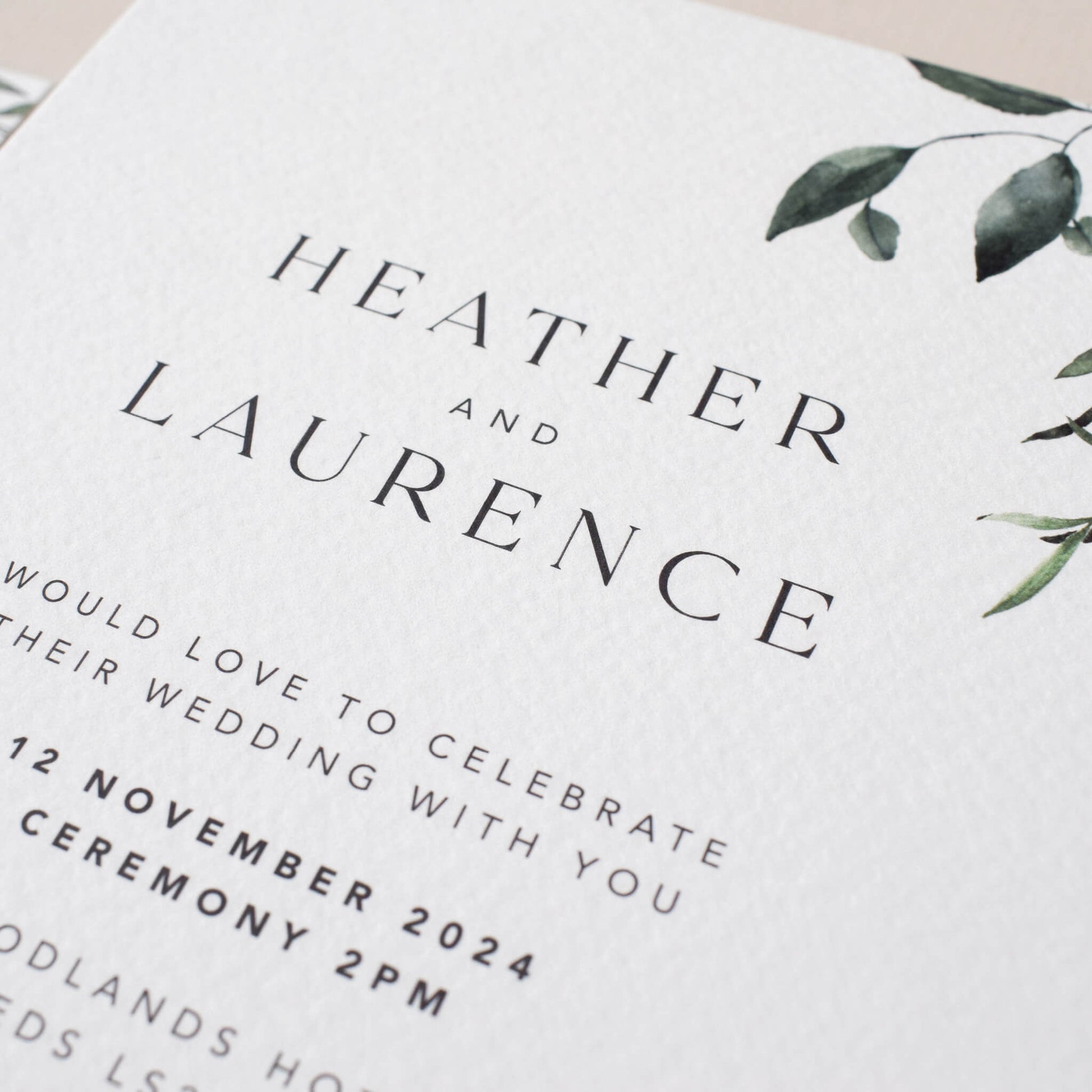 The captivating Verdant Invitation features a graceful blend of elegant typography framed by delicate watercolour leaves. Measuring 5x7, this invitation is meticulously printed on soft, tactile white paper, promising a delightful touch and feel that adds to its allure.