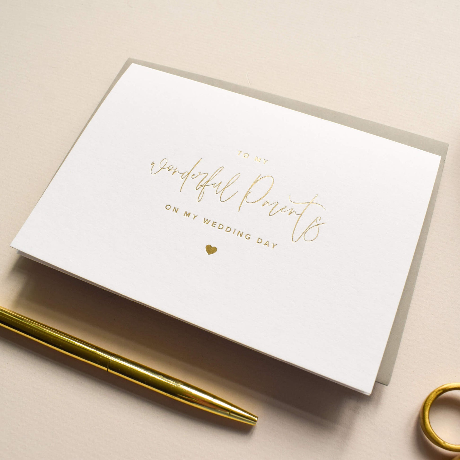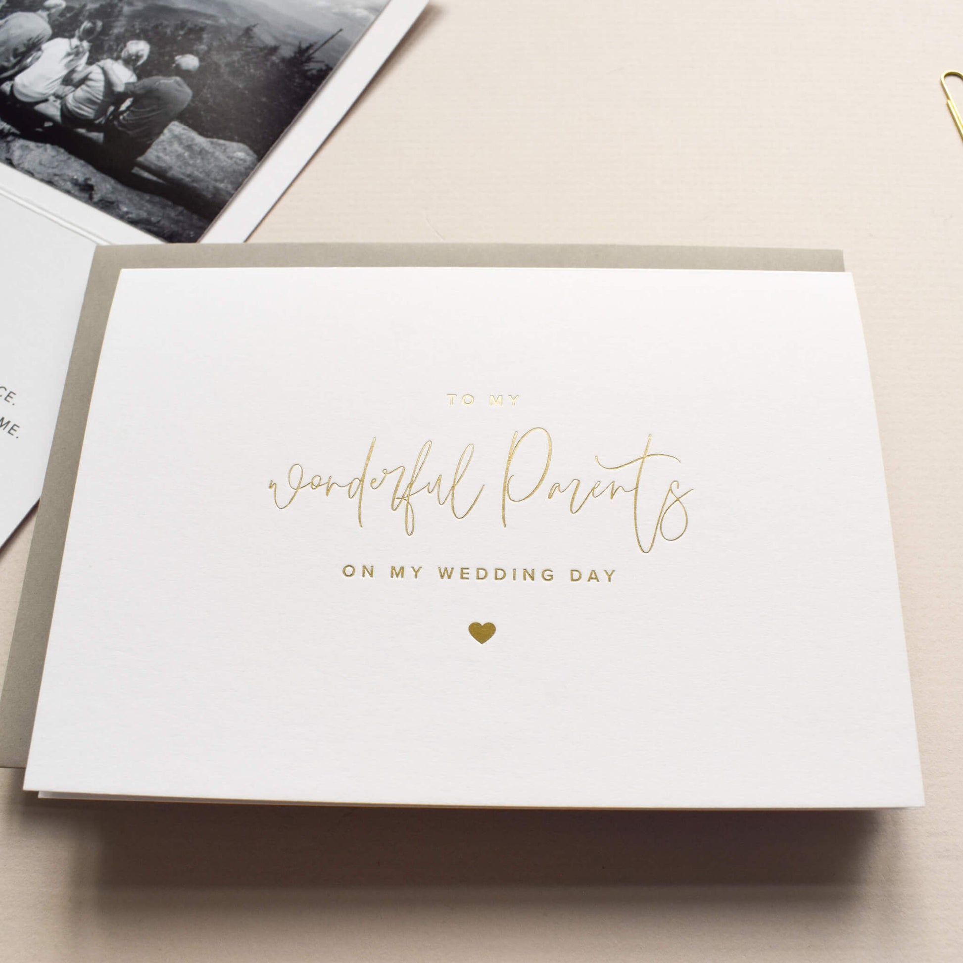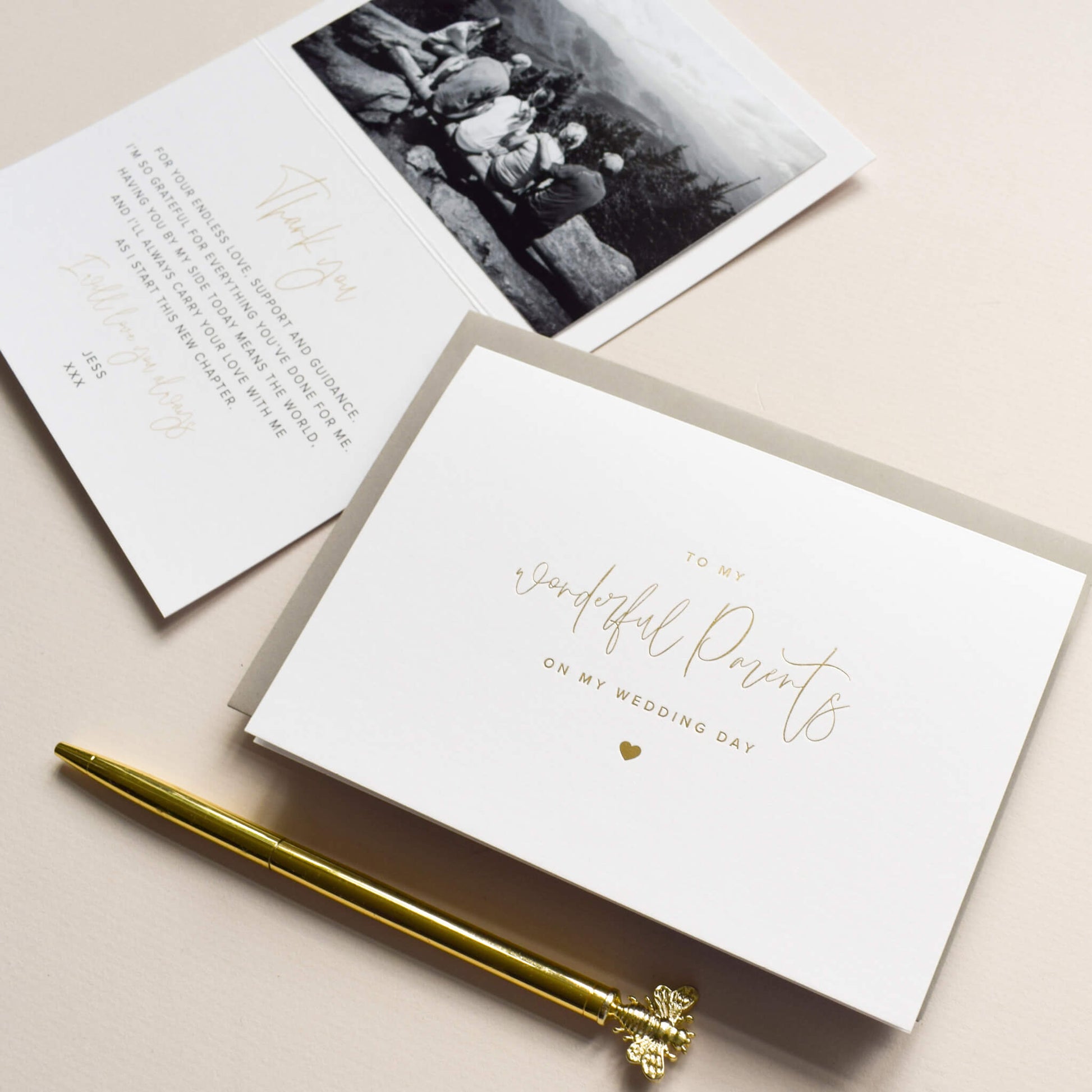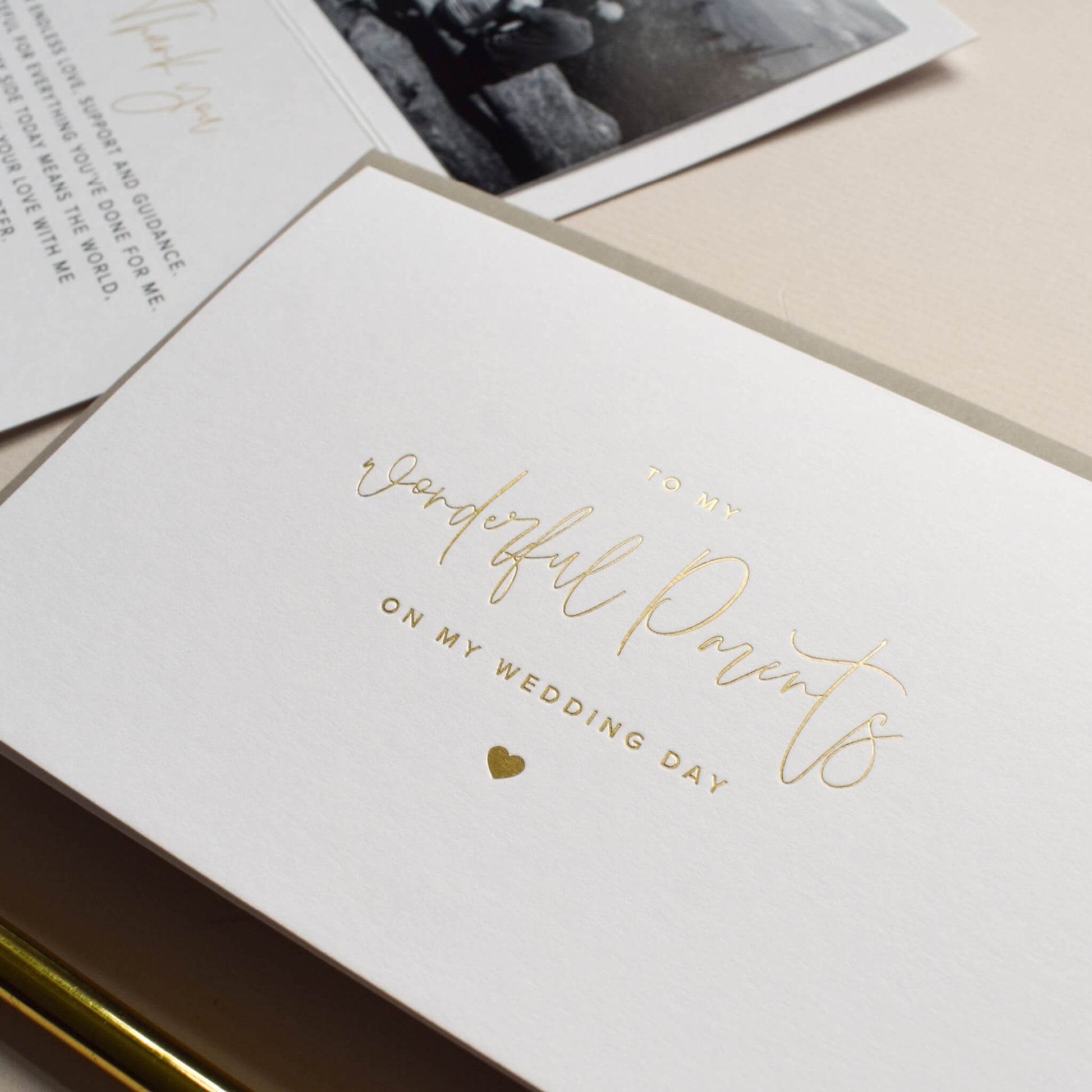 Add a heartfelt touch to your wedding day with this luxury gold foil card, designed especially for parents. The front reads “To my wonderful parents on my wedding day” in shimmering gold foil, creating an elegant keepsake that captures the significance of the moment.