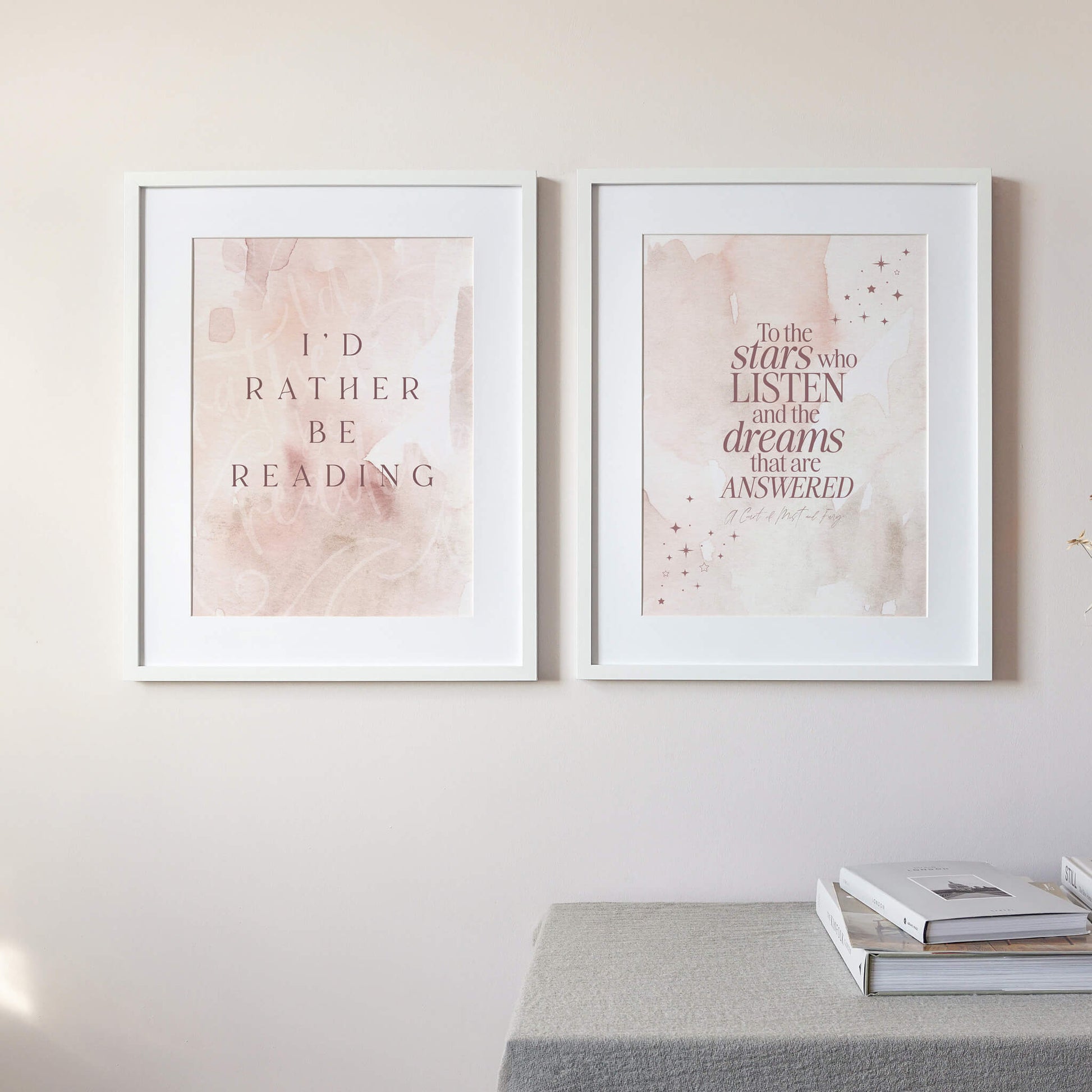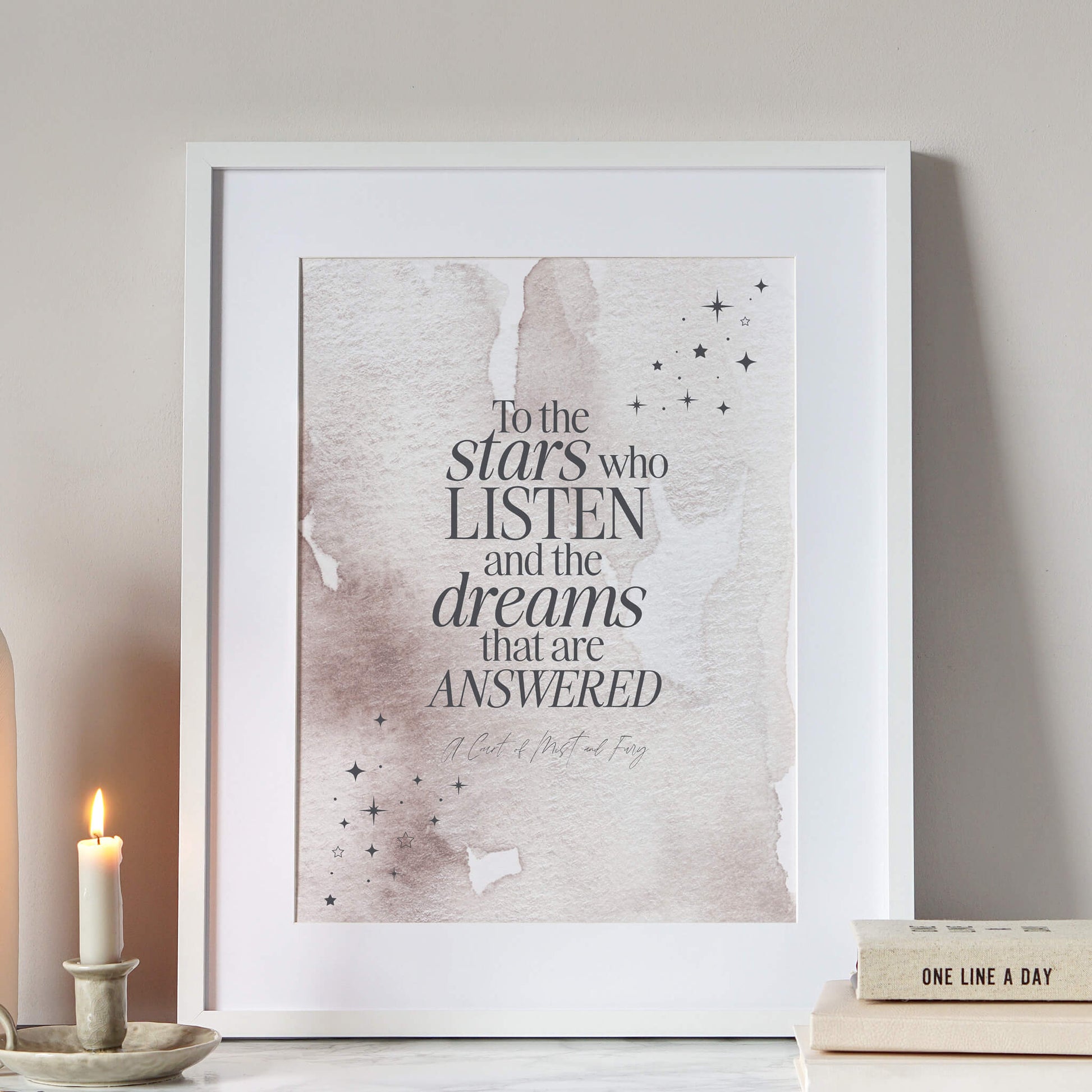 This dreamy, celestial print features the quote ‘To the stars who listen and the dreams that are answered’ from A Court of Mist and Fury. Elegant serif typography meets delicate stars that gather toward the text, creating a magical, ethereal feel. The italicised ‘stars’, ‘dreams’ and ‘answered’ bring gentle emphasis and flow.