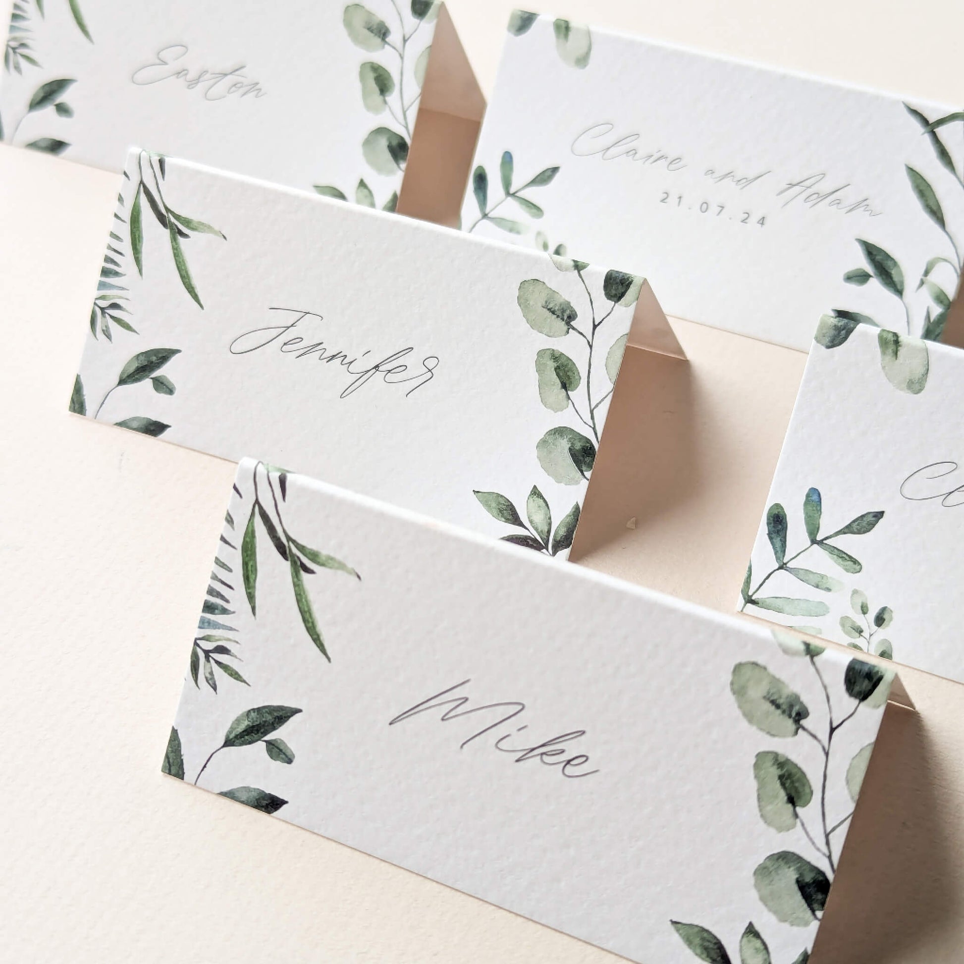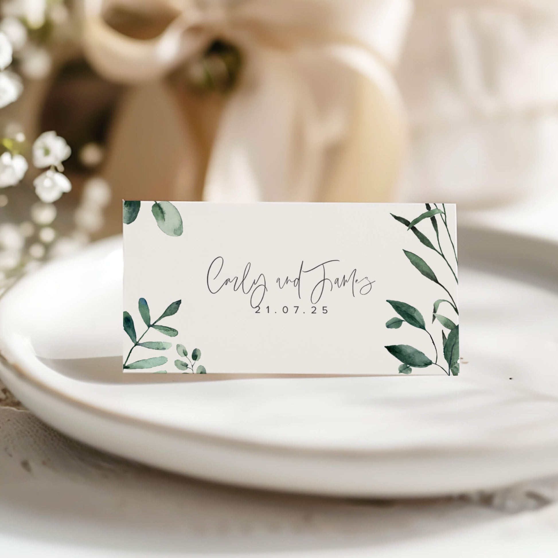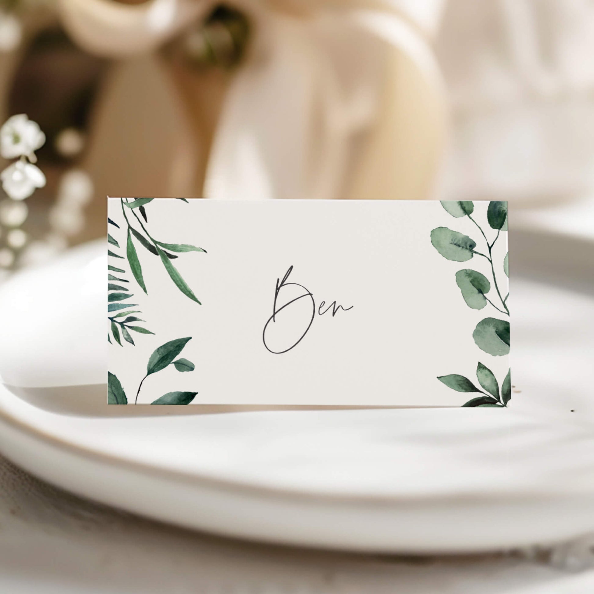 Enhance the elegance of your wedding reception with beautifully designed botanical Place Name cards, designed for modern, stylish weddings. Printed on premium heavyweight textured white paper, these folded name cards feature a beautifully simple leafy design, perfect for your refined, classic wedding aesthetic.