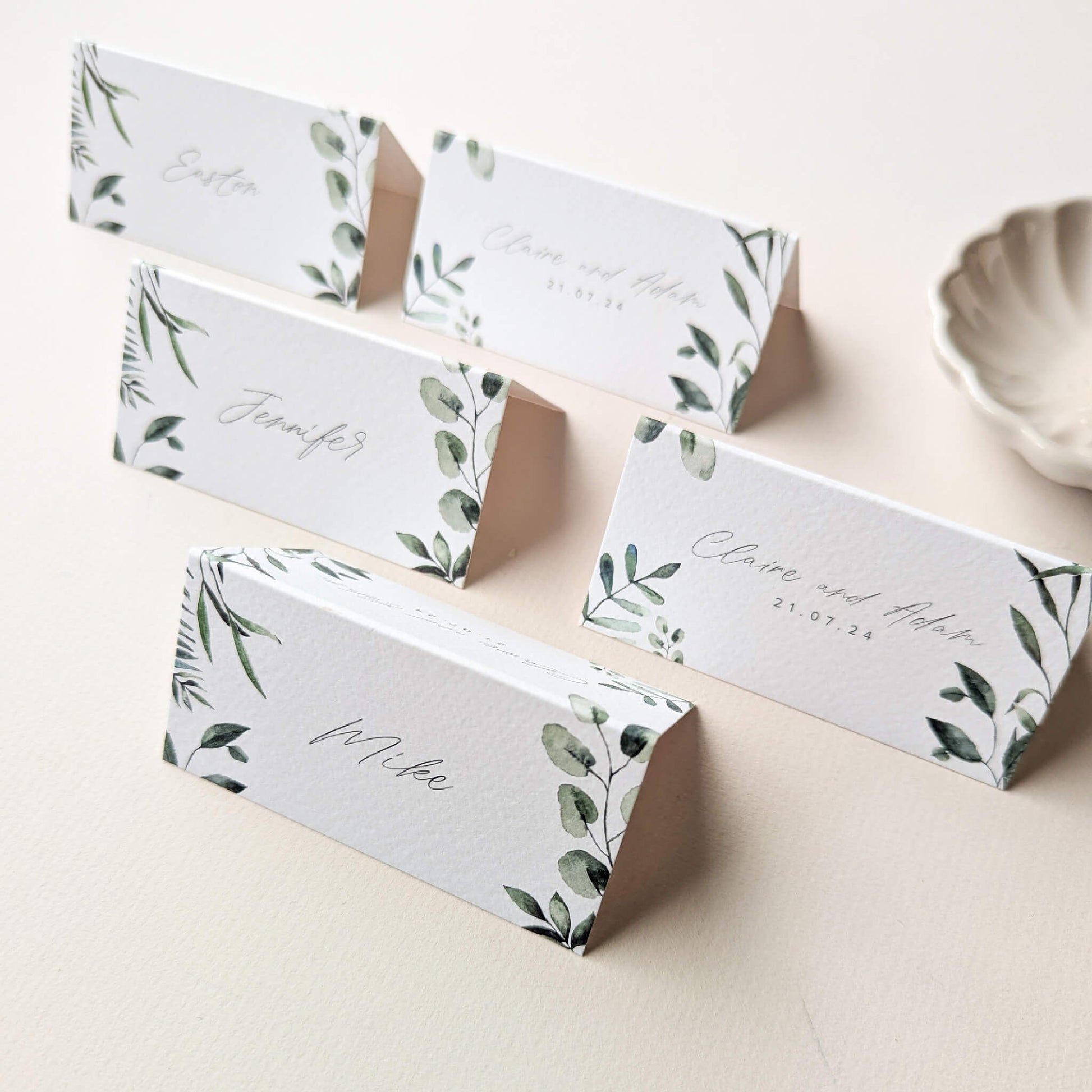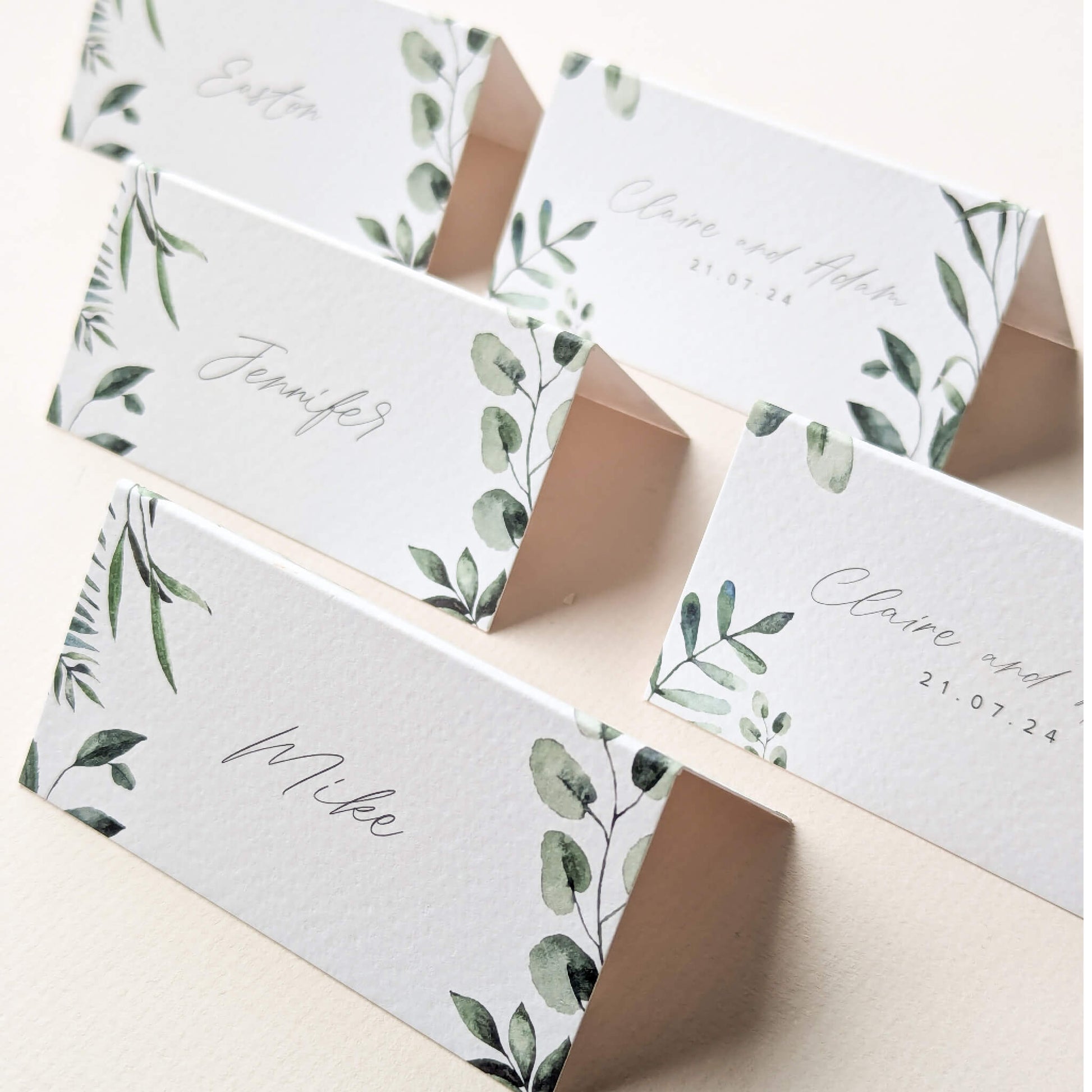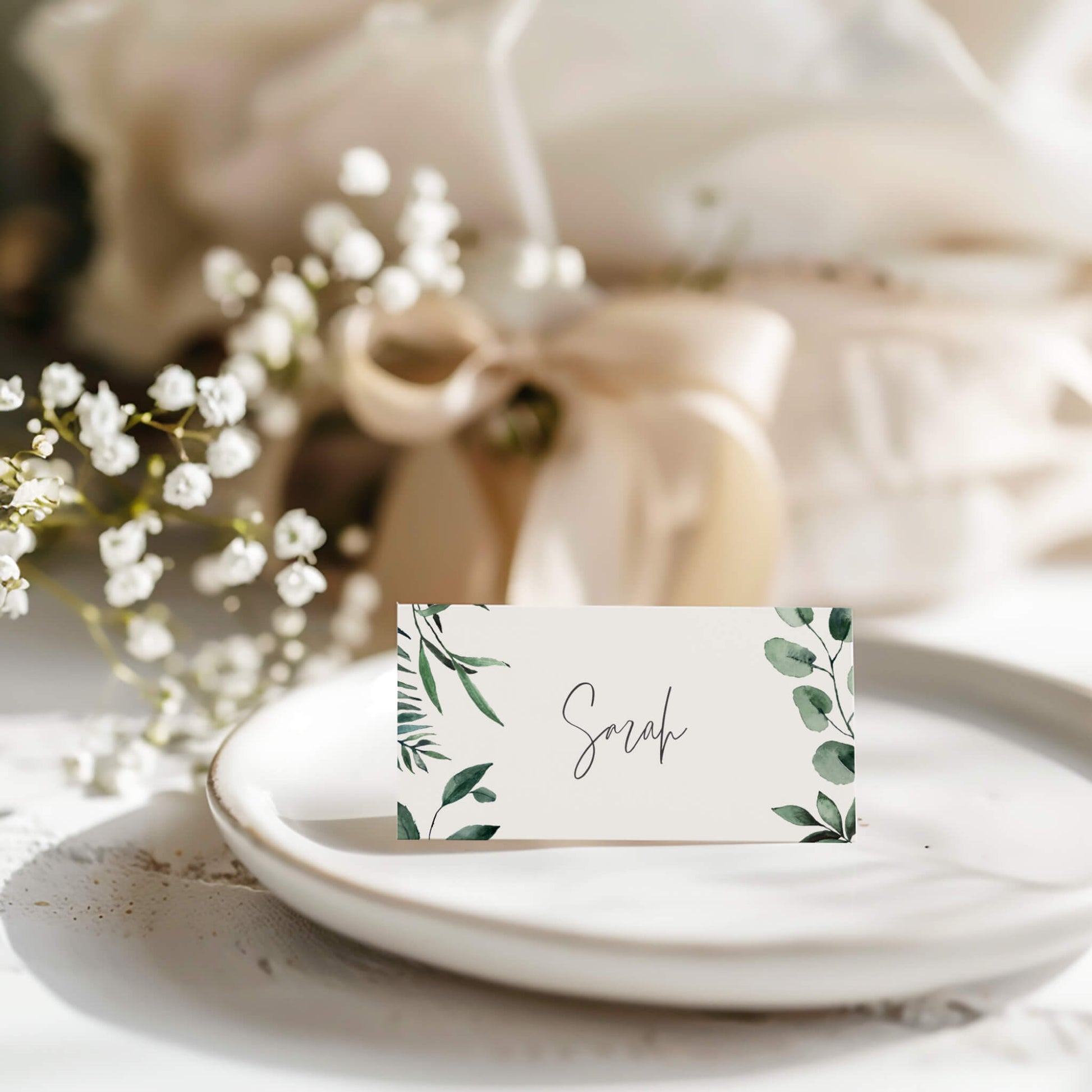 Enhance the elegance of your wedding reception with beautifully designed botanical Place Name cards, designed for modern, stylish weddings. Printed on premium heavyweight textured white paper, these folded name cards feature a beautifully simple leafy design, perfect for your refined, classic wedding aesthetic.