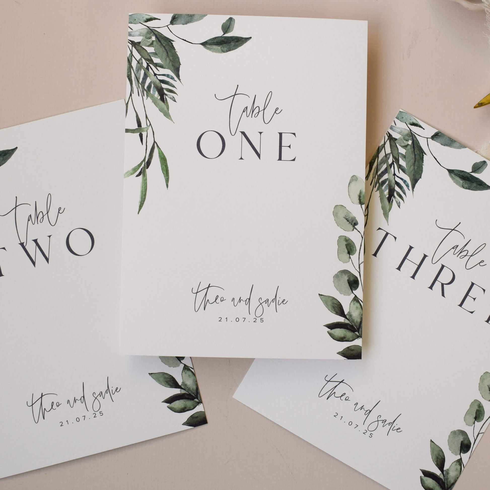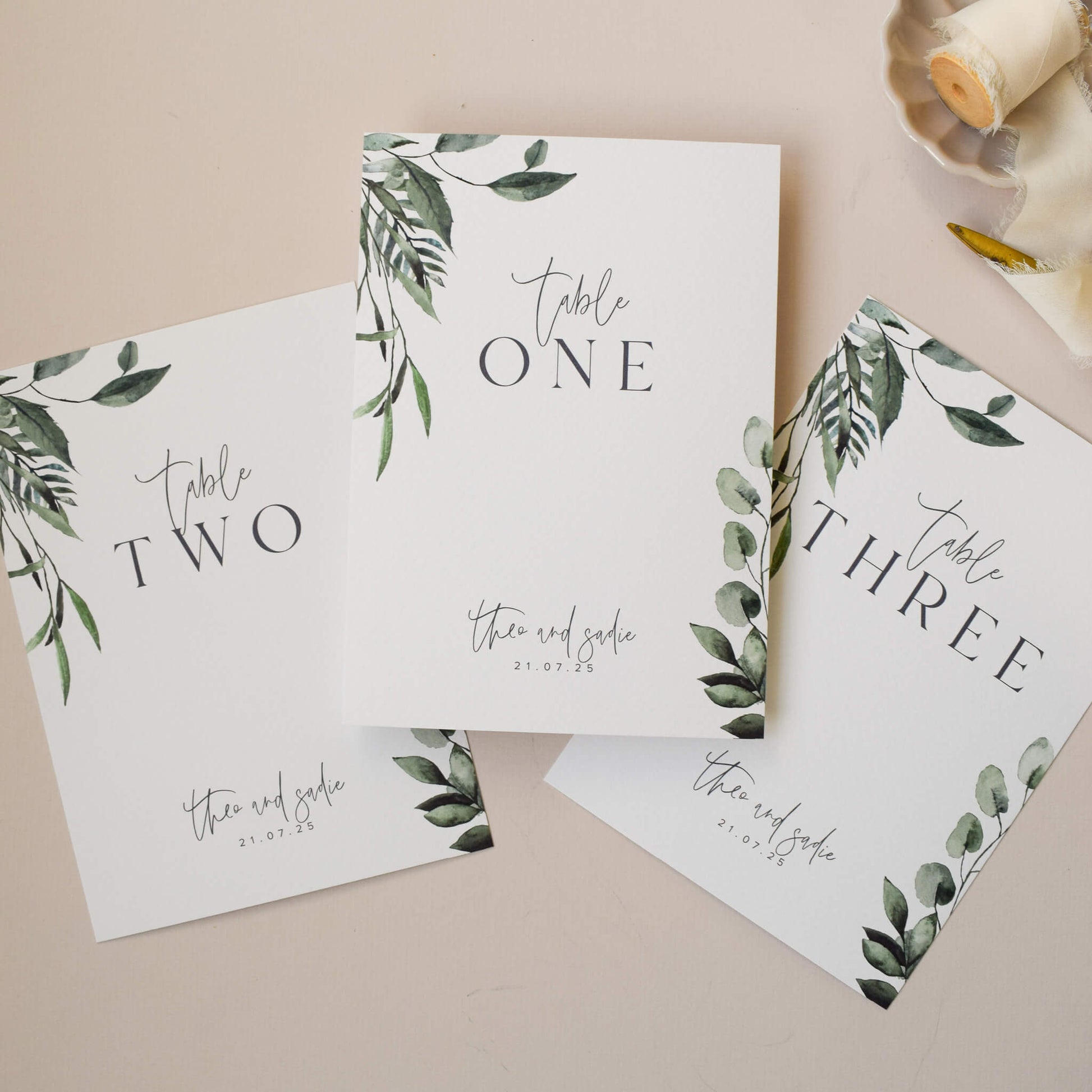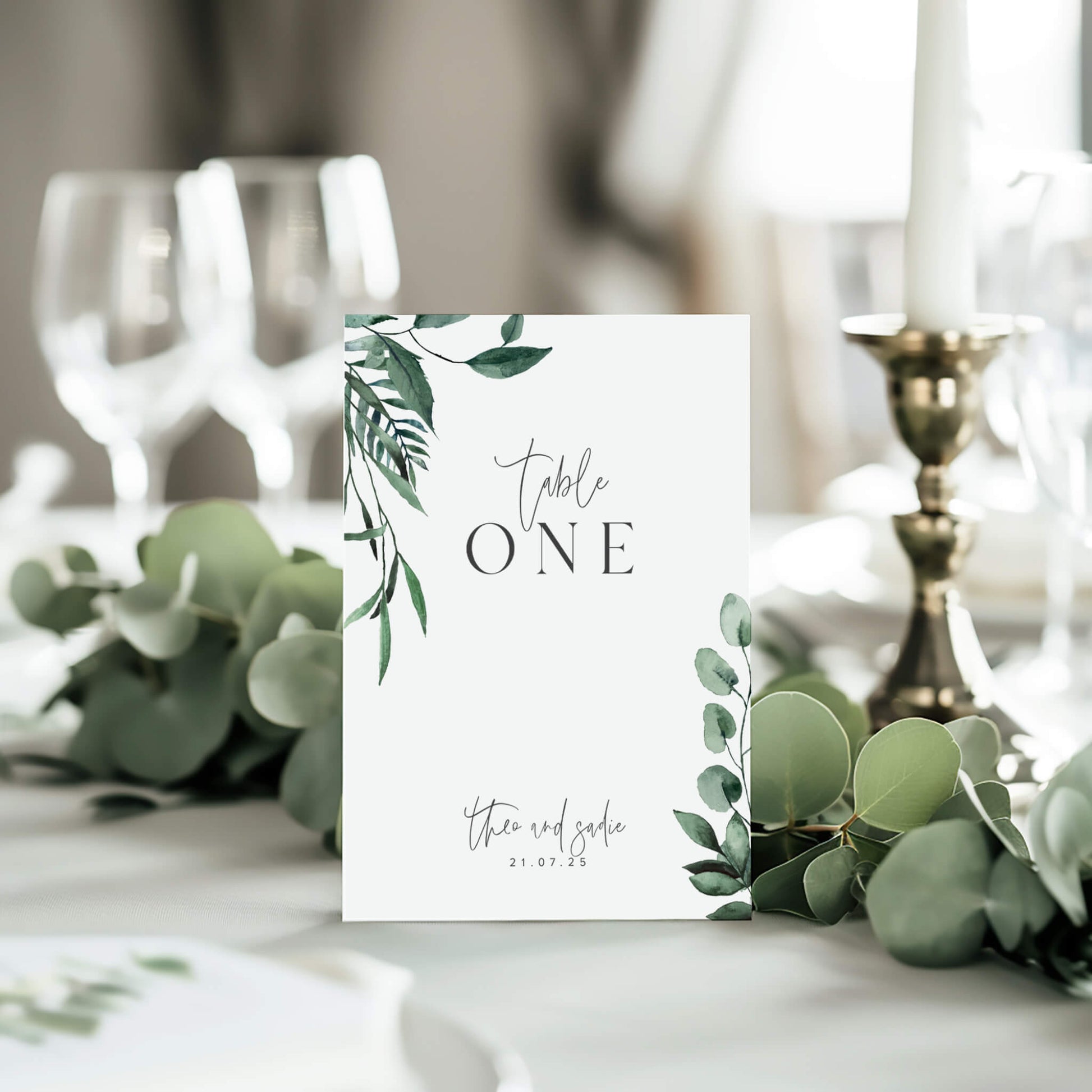 Enhance the elegance of your wedding reception with beautifully designed Wedding Table Numbers. Perfect for helping your guests to find their seats with style, these table numbers feature a minimalistic design complemented by delicate green leaf elements at the corners.
