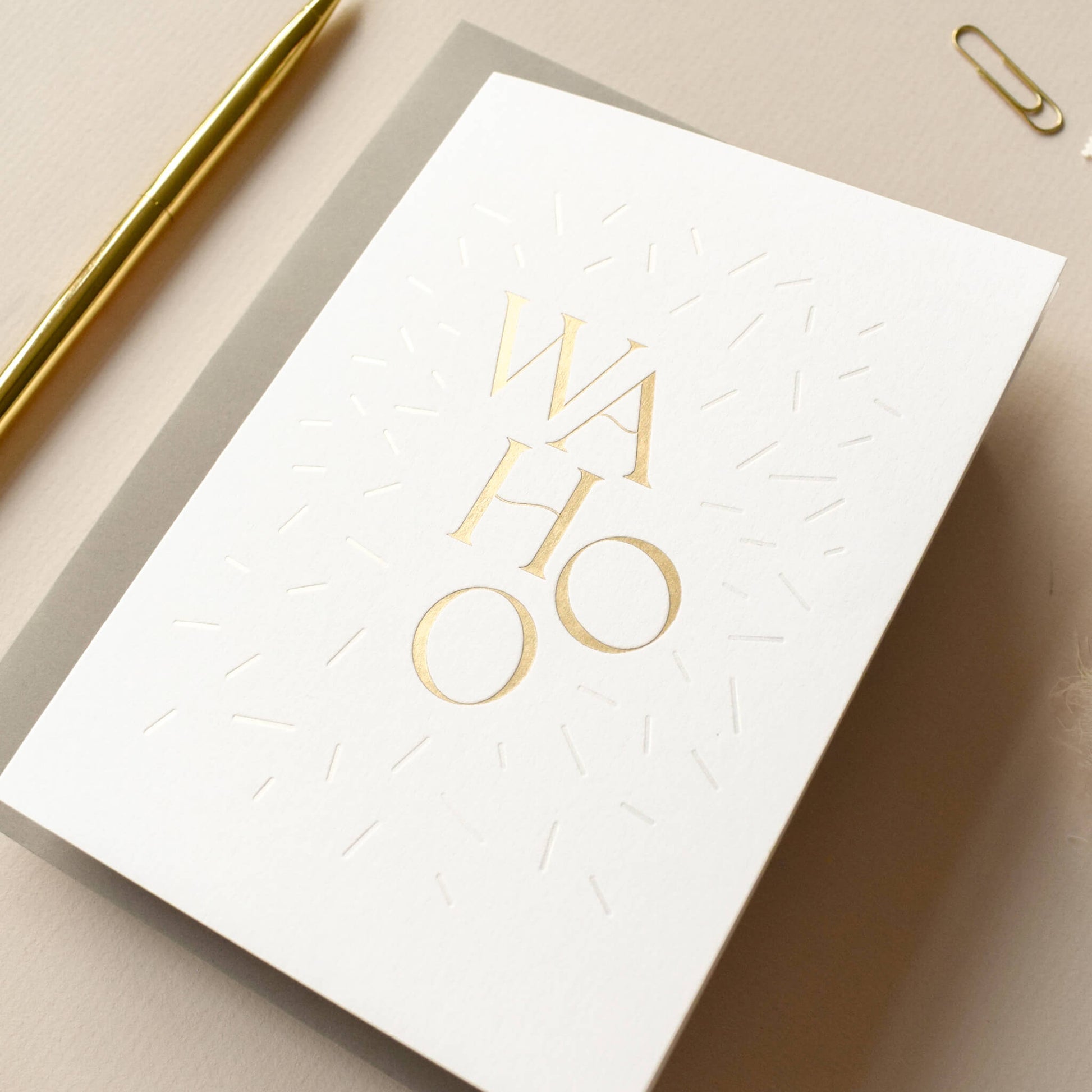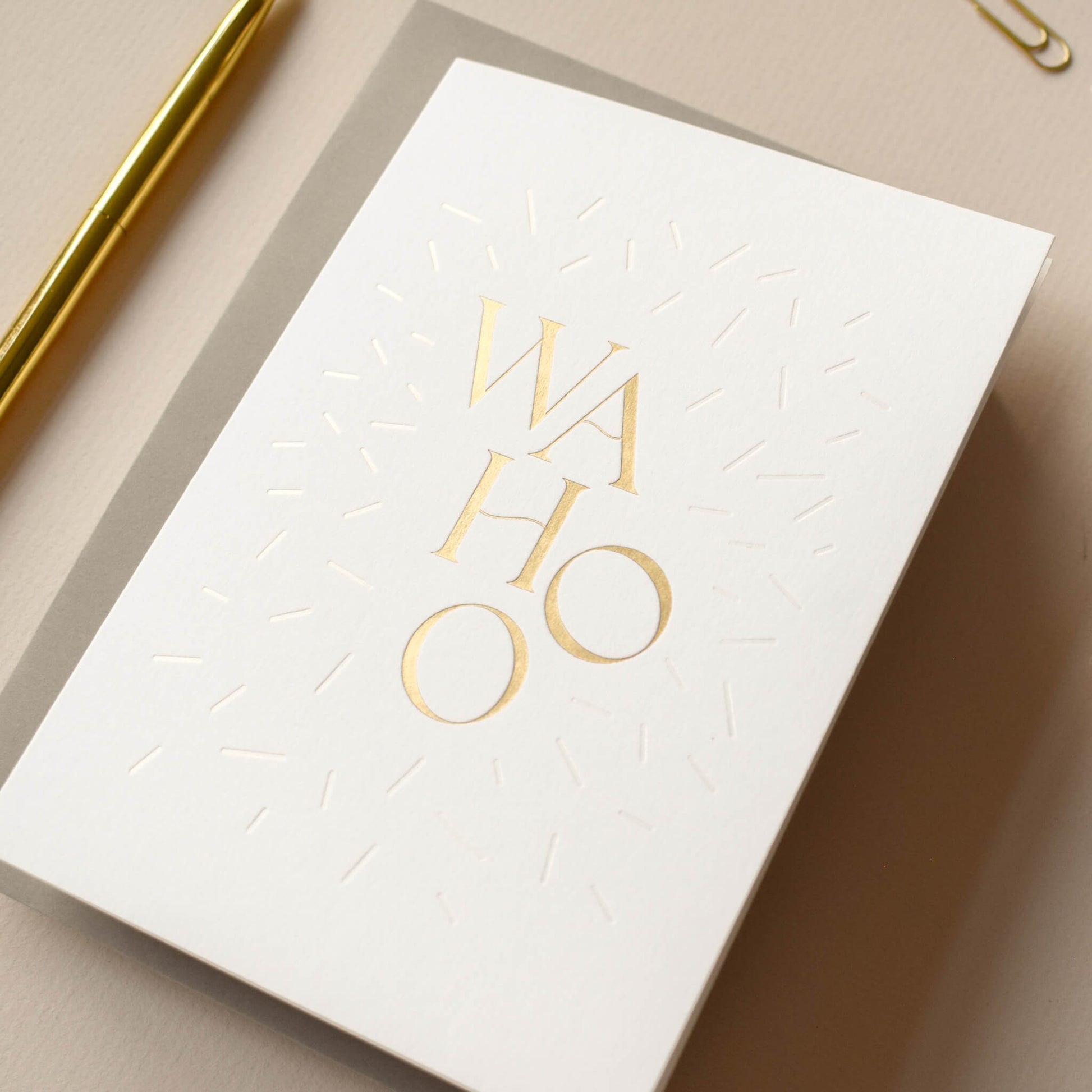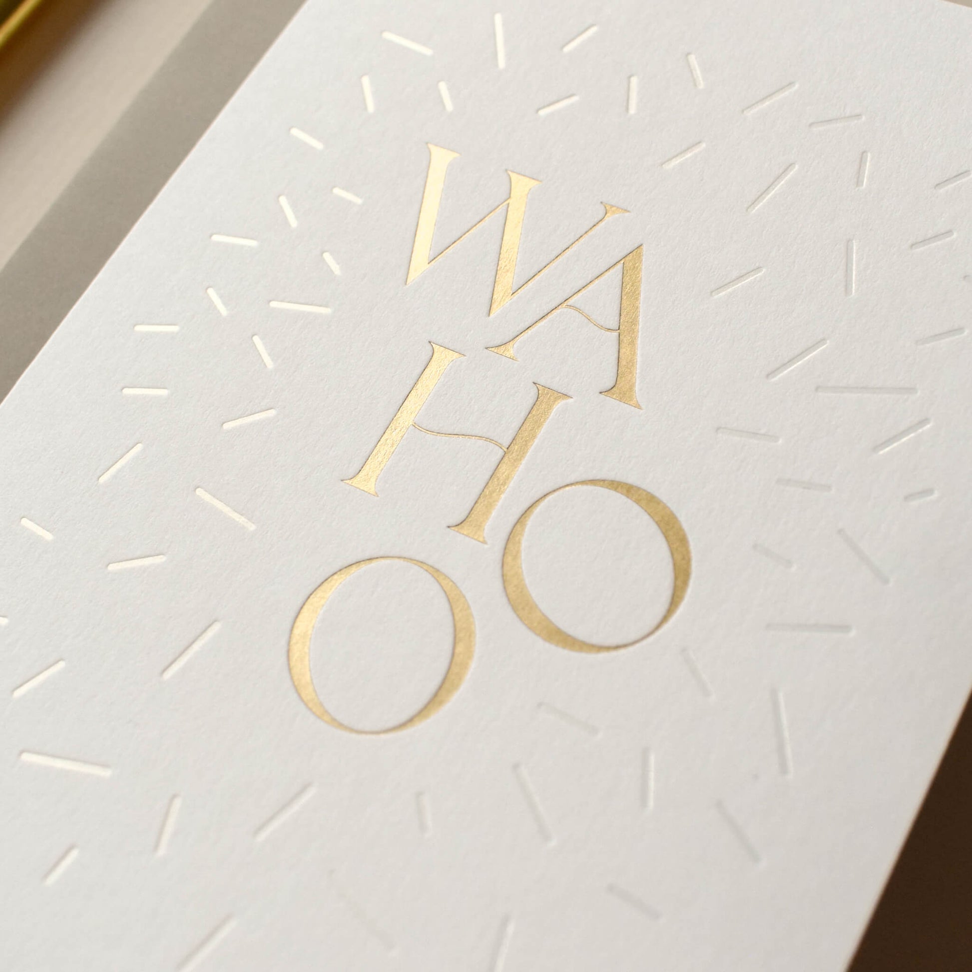 Celebrate in style with this joyful ‘Wahoo' card, the perfect card to spread some cheer, whether it's a birthday, new baby or wedding. Featuring bold gold foil lettering, surrounded by subtle, magical pearlescent confetti sprinkles, it’s a playful yet sophisticated choice for any occasion. Printed on crisp white card, it’s a fun, modern way to add sparkle to someone’s day.
