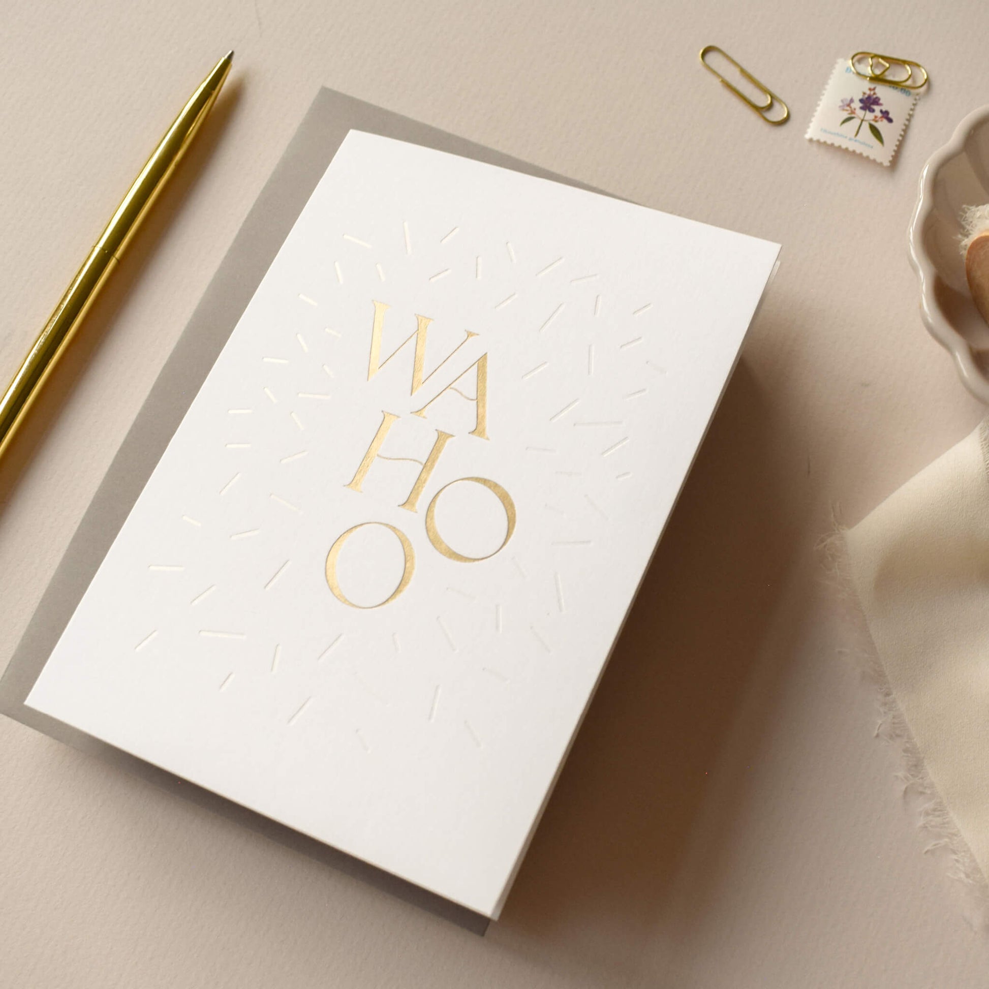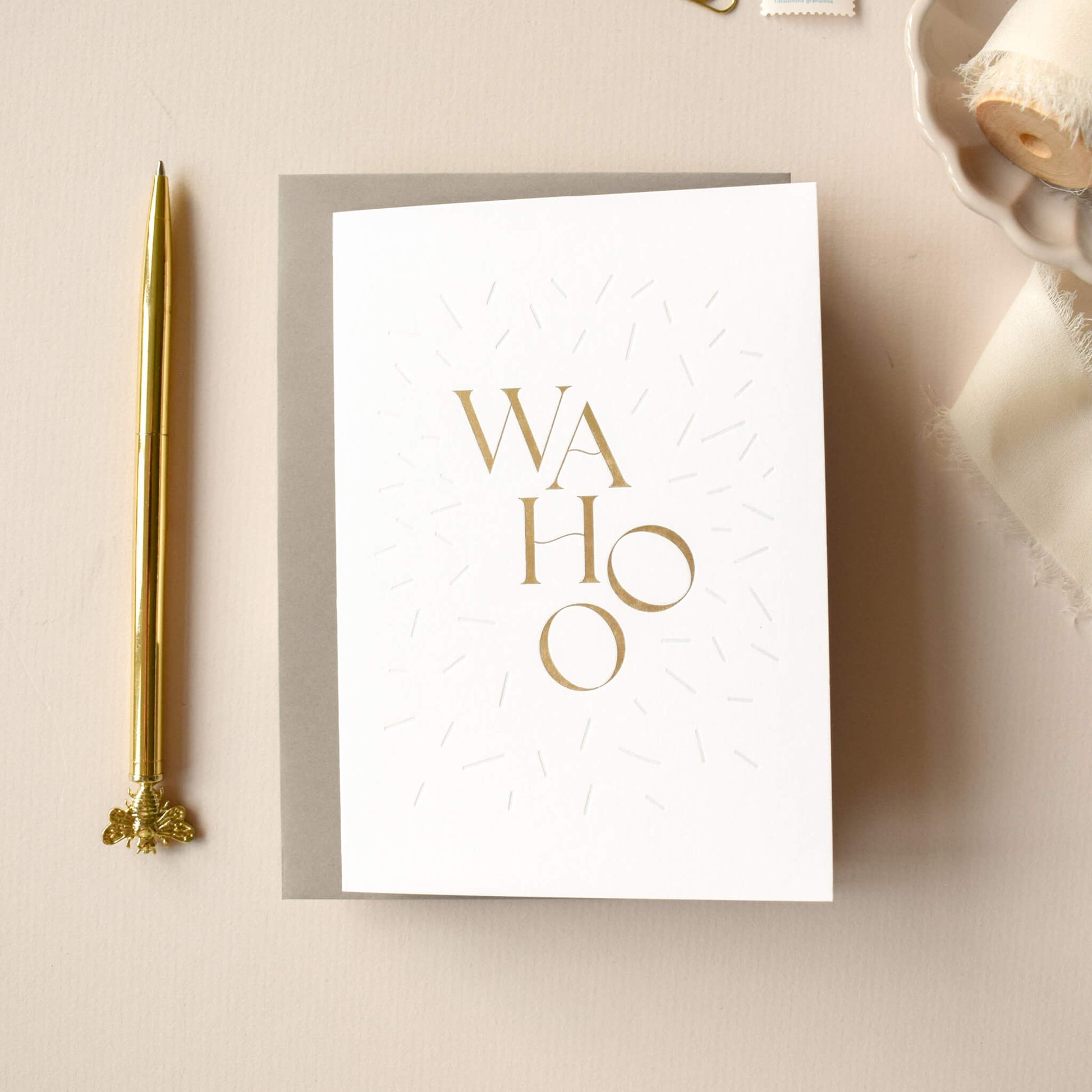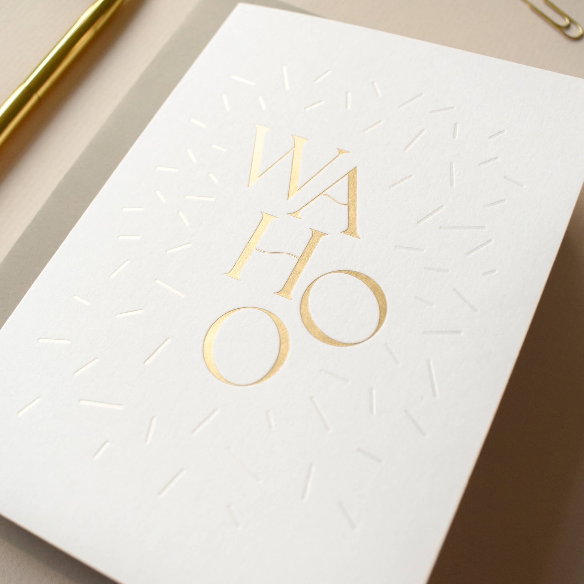 Celebrate in style with this joyful ‘Wahoo' card, the perfect card to spread some cheer, whether it's a birthday, new baby or wedding. Featuring bold gold foil lettering, surrounded by subtle, magical pearlescent confetti sprinkles, it’s a playful yet sophisticated choice for any occasion. Printed on crisp white card, it’s a fun, modern way to add sparkle to someone’s day.
