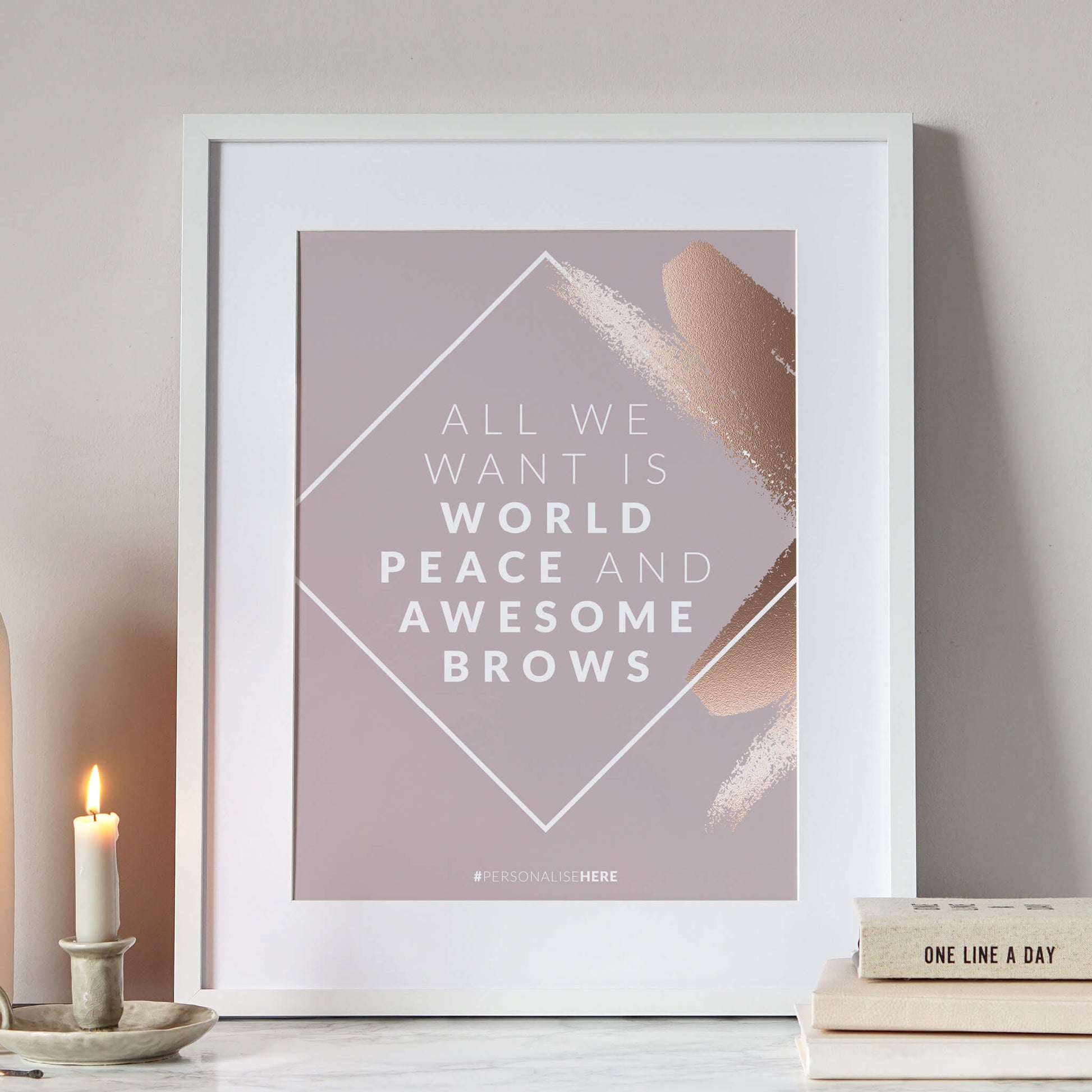 This warm grey and rose gold beauty salon print was designed as a set of prints to go in a beauty salon, but I loved them so much that I decided to include them on my website too. All of these beauty prints feature beauty and wellbeing related quotes or phrases, I will warn you now, brows are big here.
