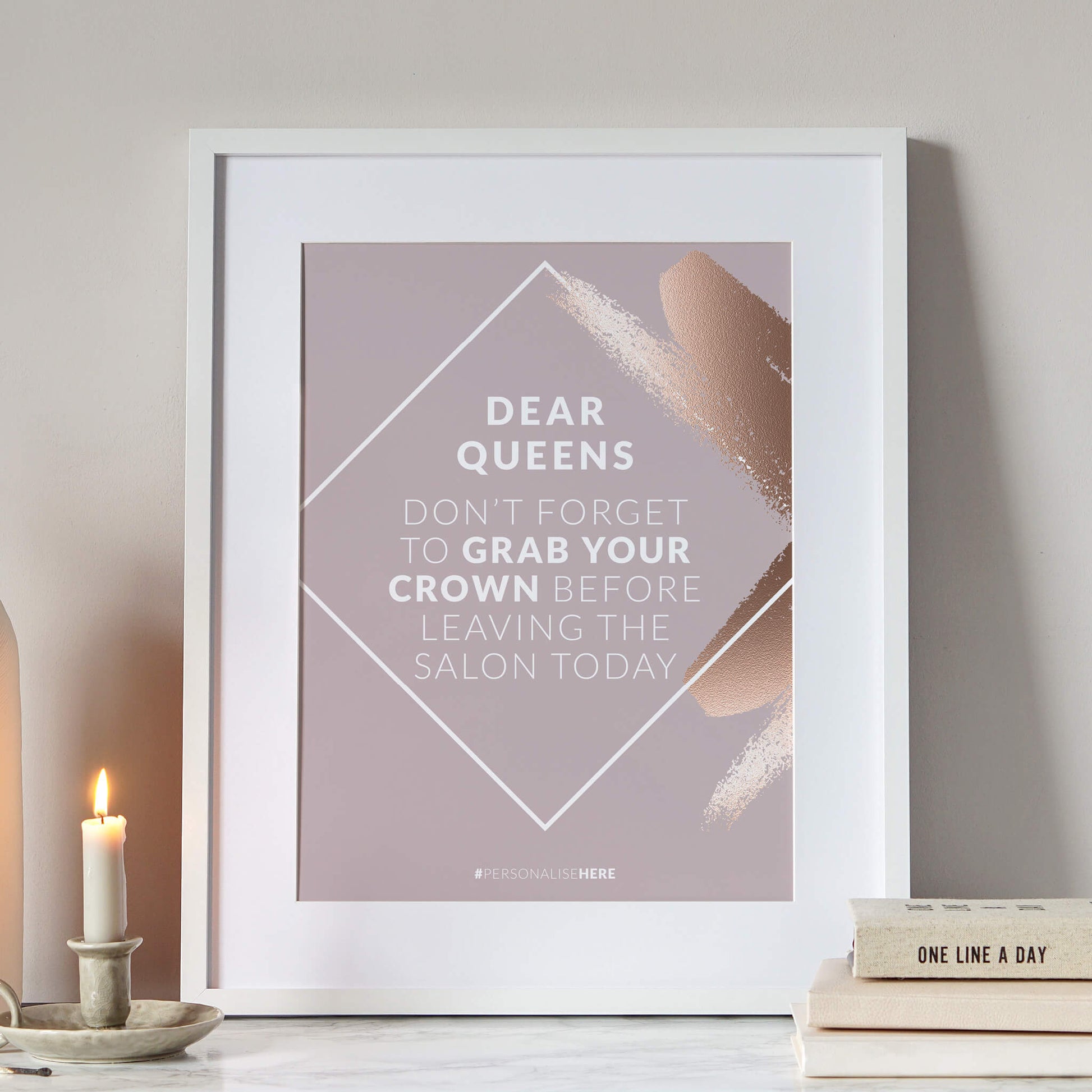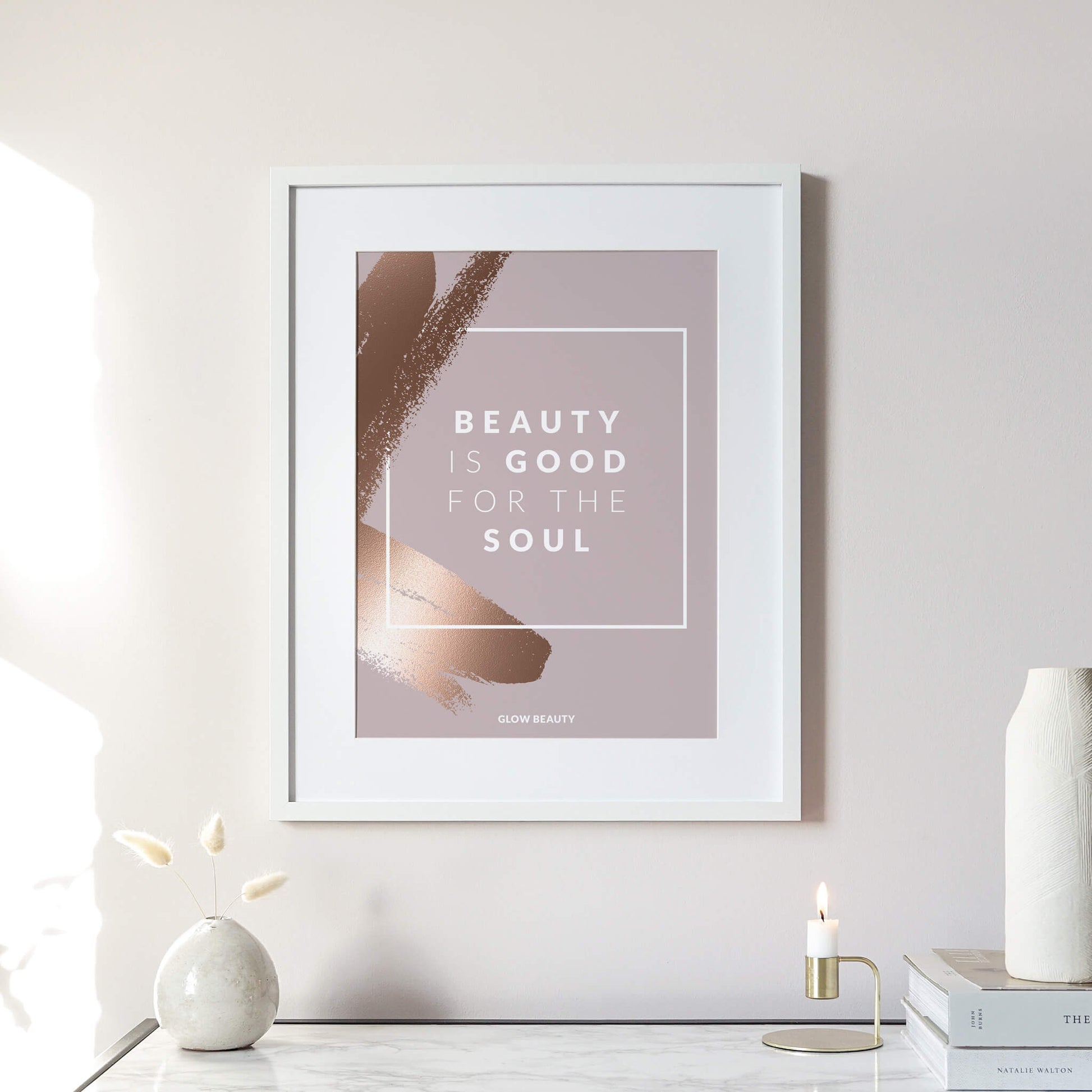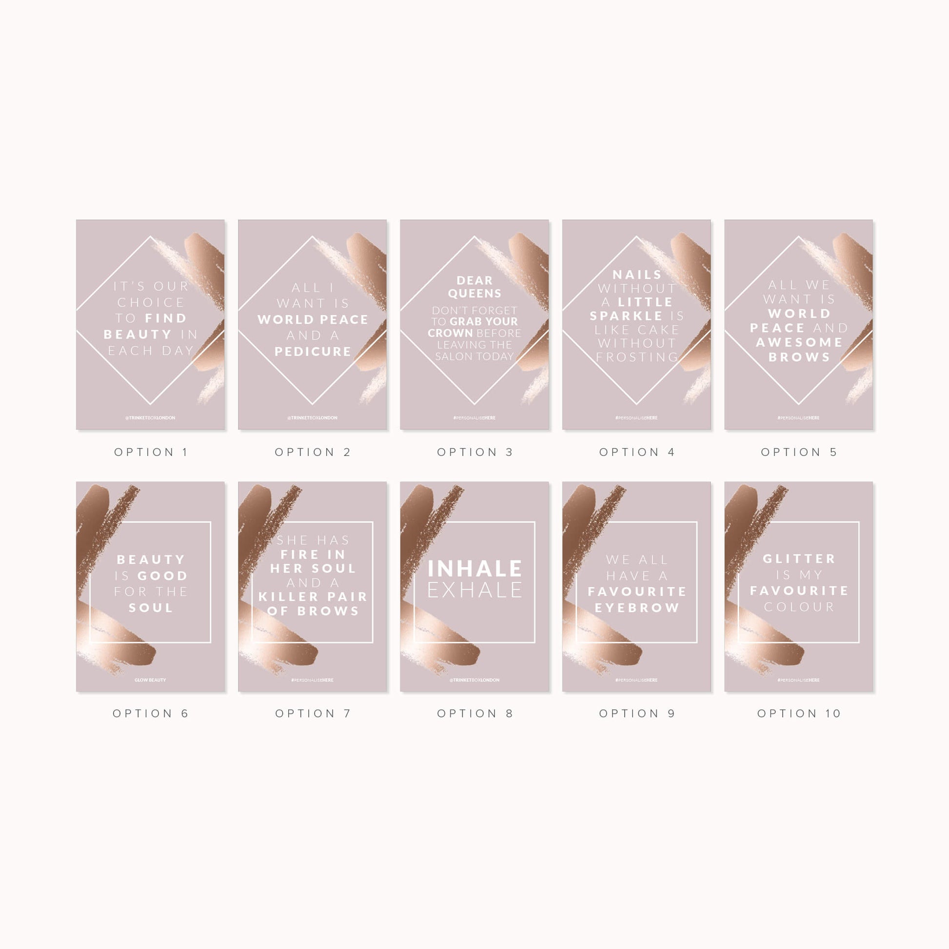 Each quote is framed within a diamond or a square shape and that shape is adorned with a beautiful rose gold coloured brush stroke. At the foot of each of my beauty prints there is space to add a hashtag, a social media handle or your name. Personalisation is completely optional, so If you don’t include any details I will leave that space blank, which looks lovely too. Not only do these prints look amazing in salons, but they also make exceptional prints for dressing rooms or bedrooms.