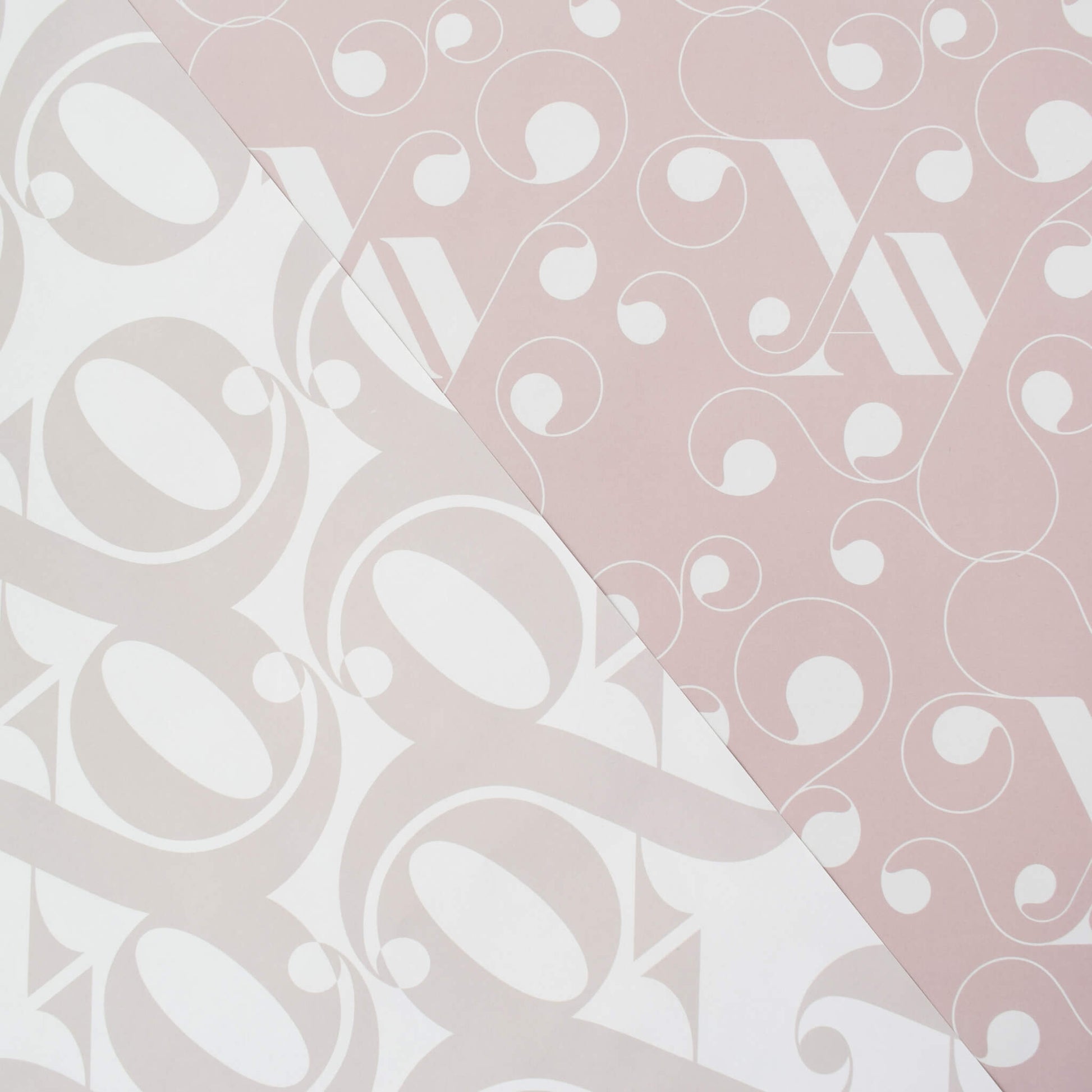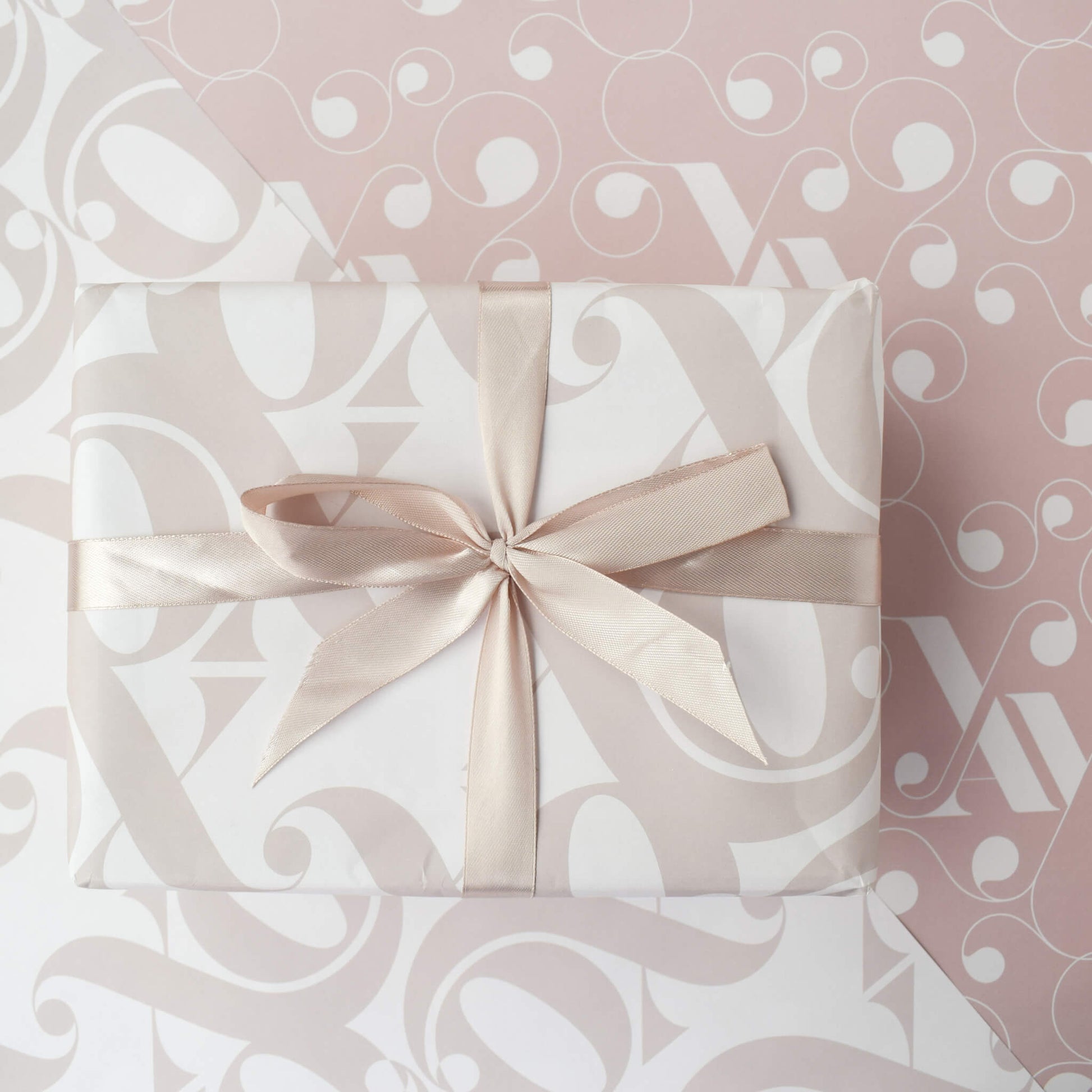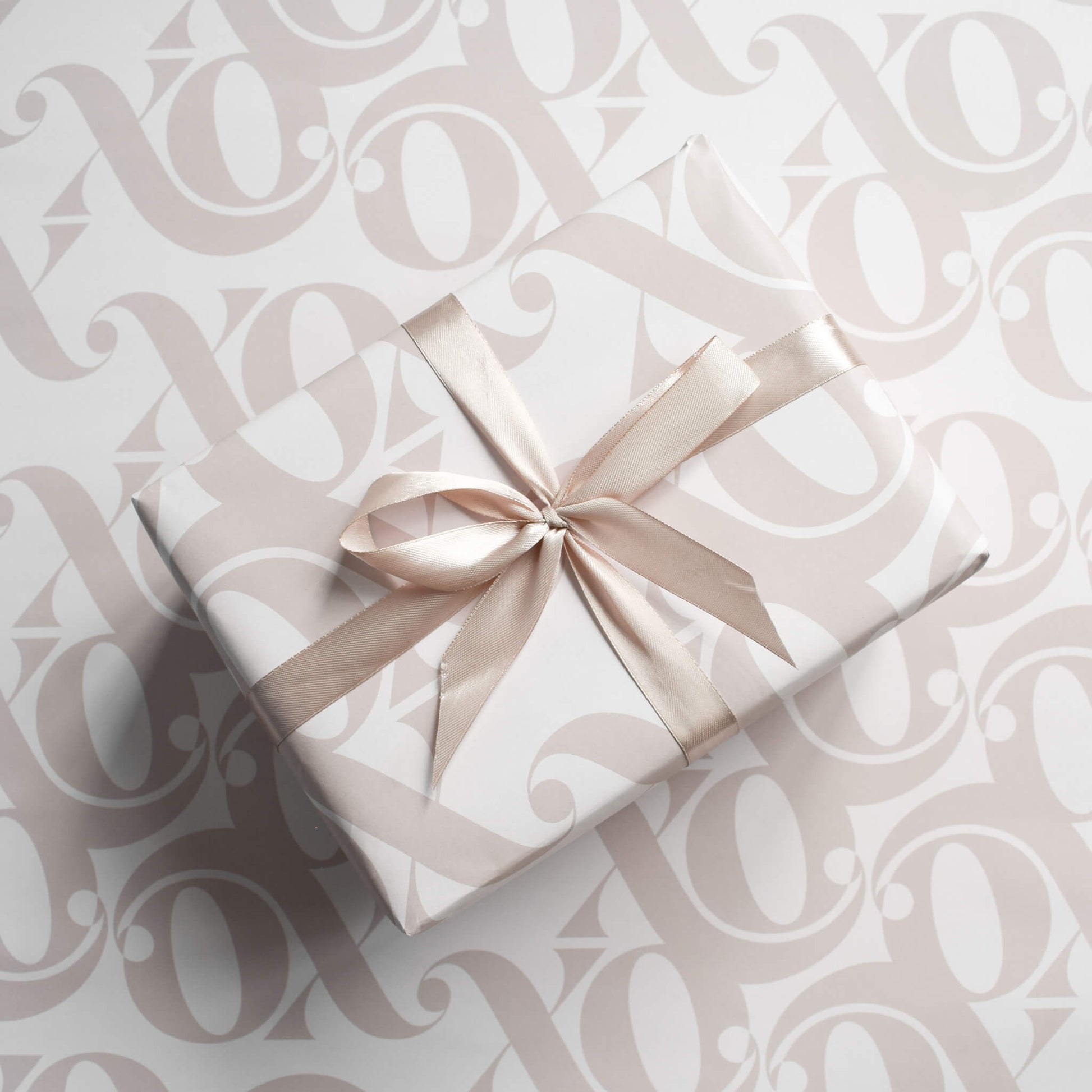 Two sheets of luxury gift wrap featuring the letters ‘XO’ in an elegant typographic design in a neutral colour palette. This wrapping paper is printed on thick premium matte paper which can be re-used or recycled.
