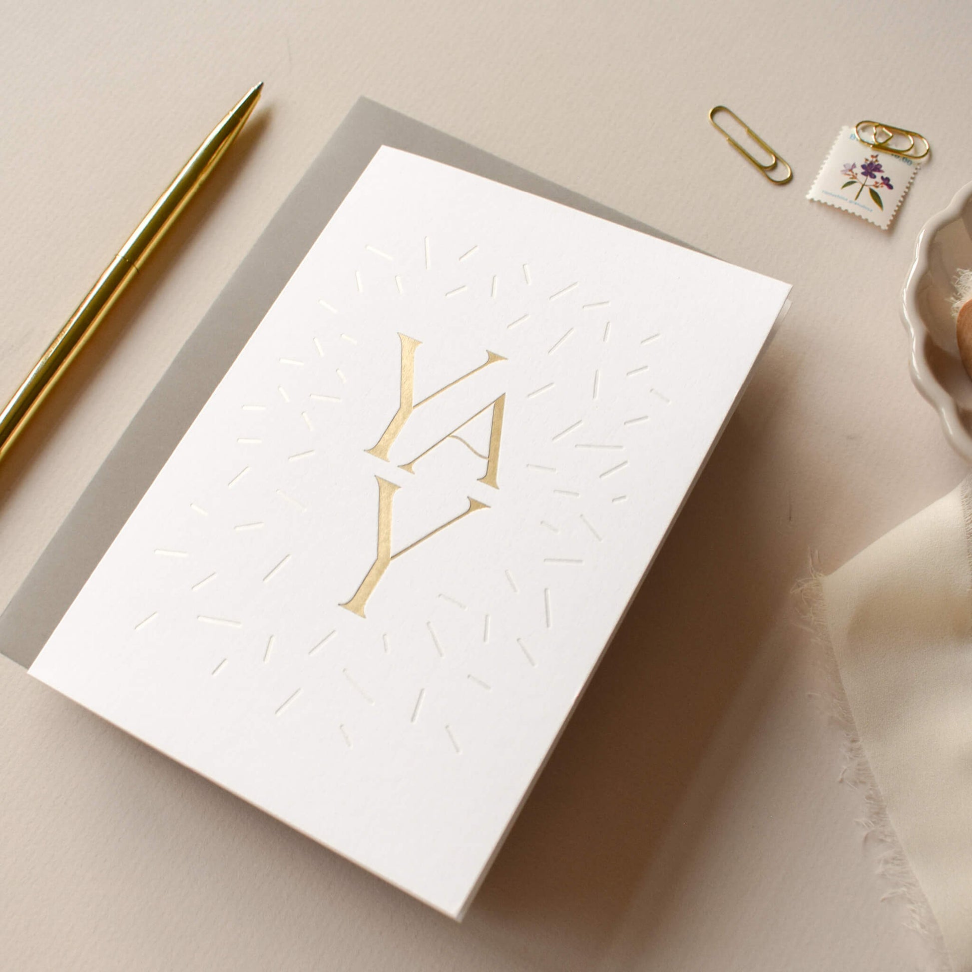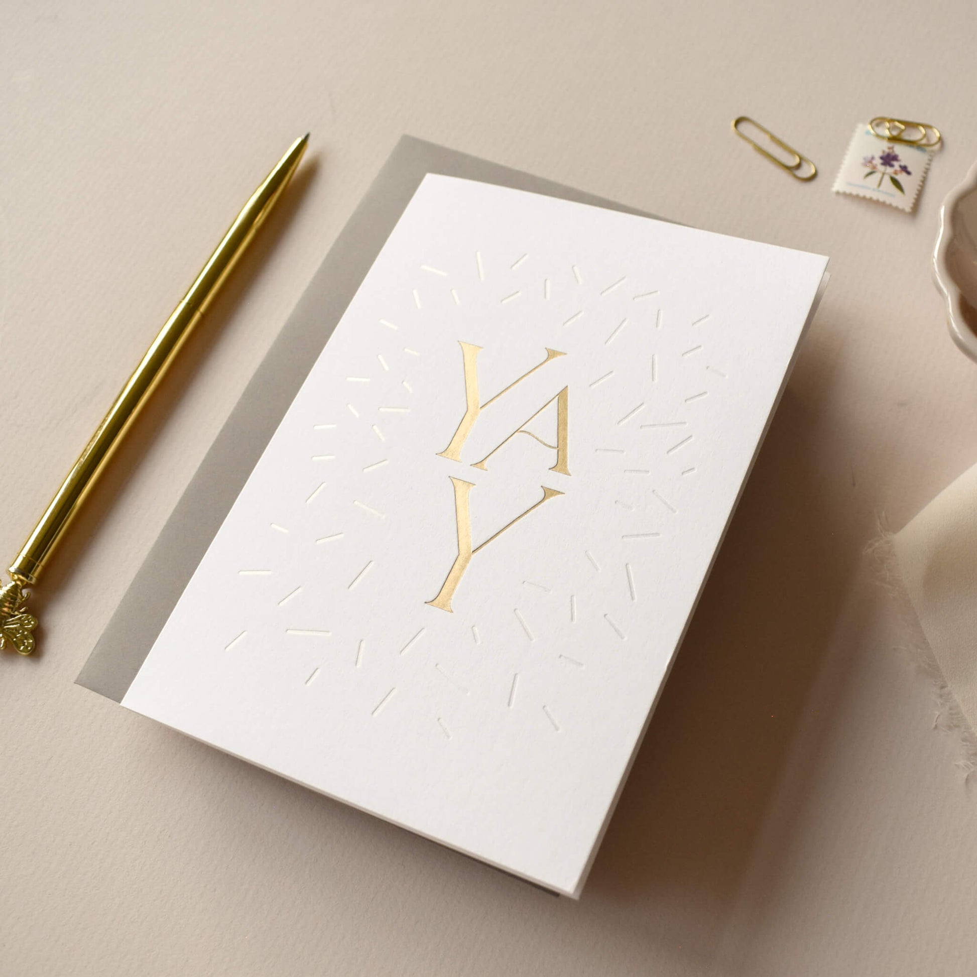 Celebrate in style with this joyful ‘YAY’ card, the perfect card to spread some cheer, whether it's a birthday, new baby or wedding. Featuring bold gold foil lettering, surrounded by subtle, magical pearlescent confetti sprinkles, it’s a playful yet sophisticated choice for any occasion. Printed on crisp white card, it’s a fun, modern way to add sparkle to someone’s day.