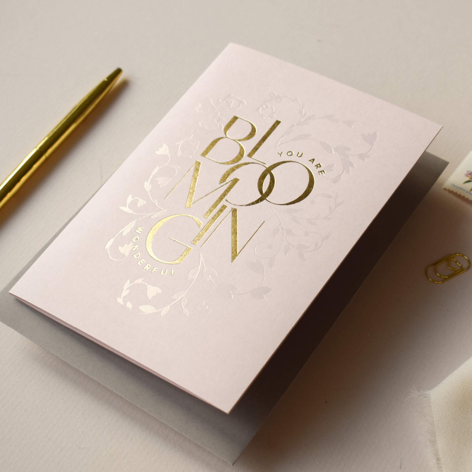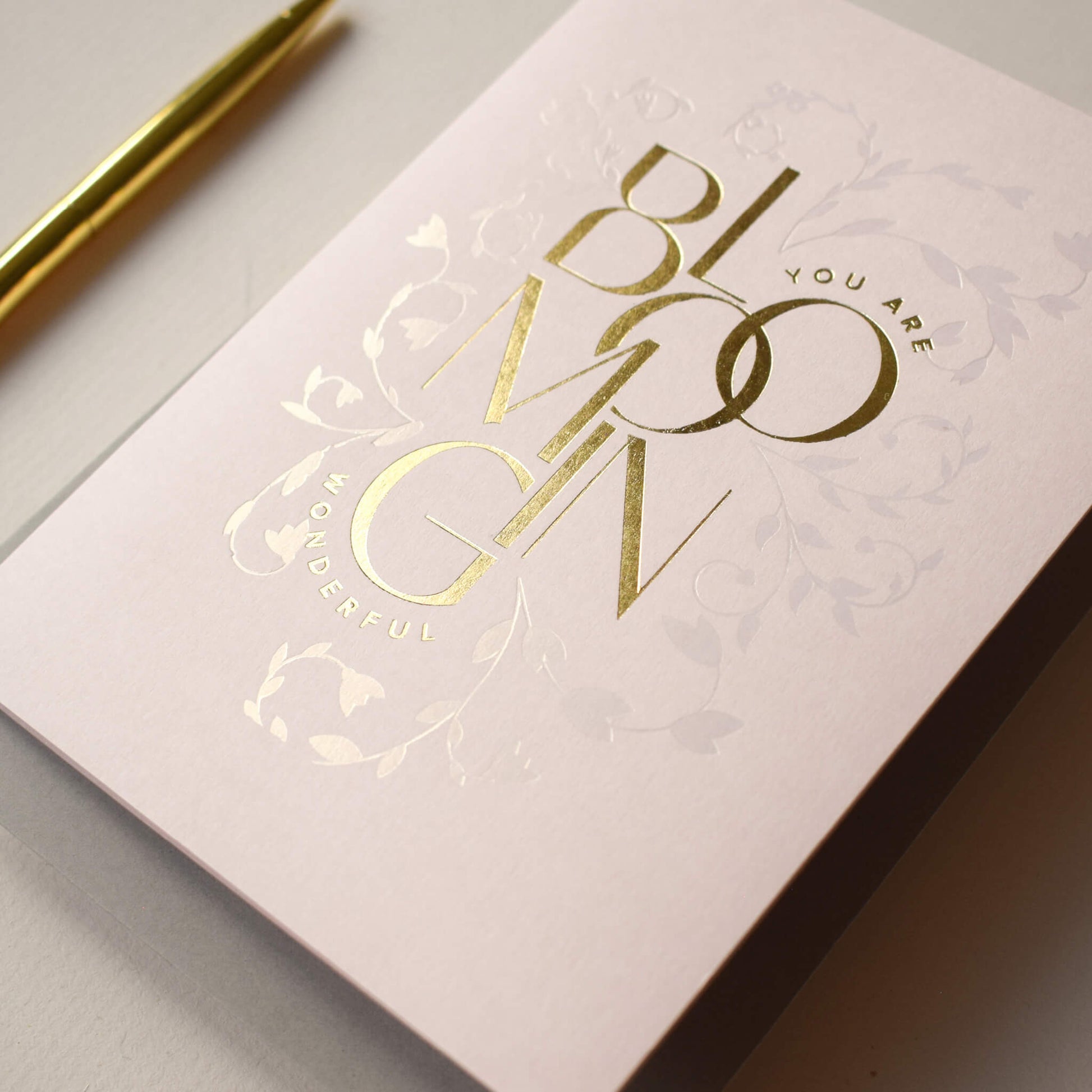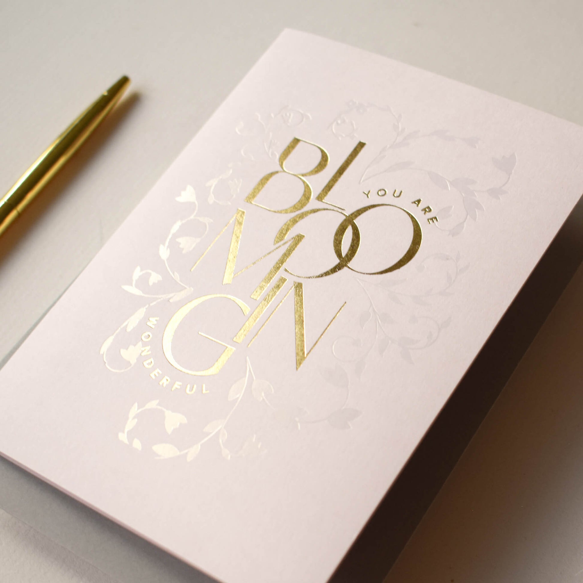 This luxury greetings card features the words 'You Are Blooming Wonderful’ in an elegant and modern design, printed in gold foil onto tactile blush pink paper. The modern typographic design is enhanced by the addition of a botanical design that surrounds the text and has been hot foil printed with a transparent foil which is beautifully subtle.