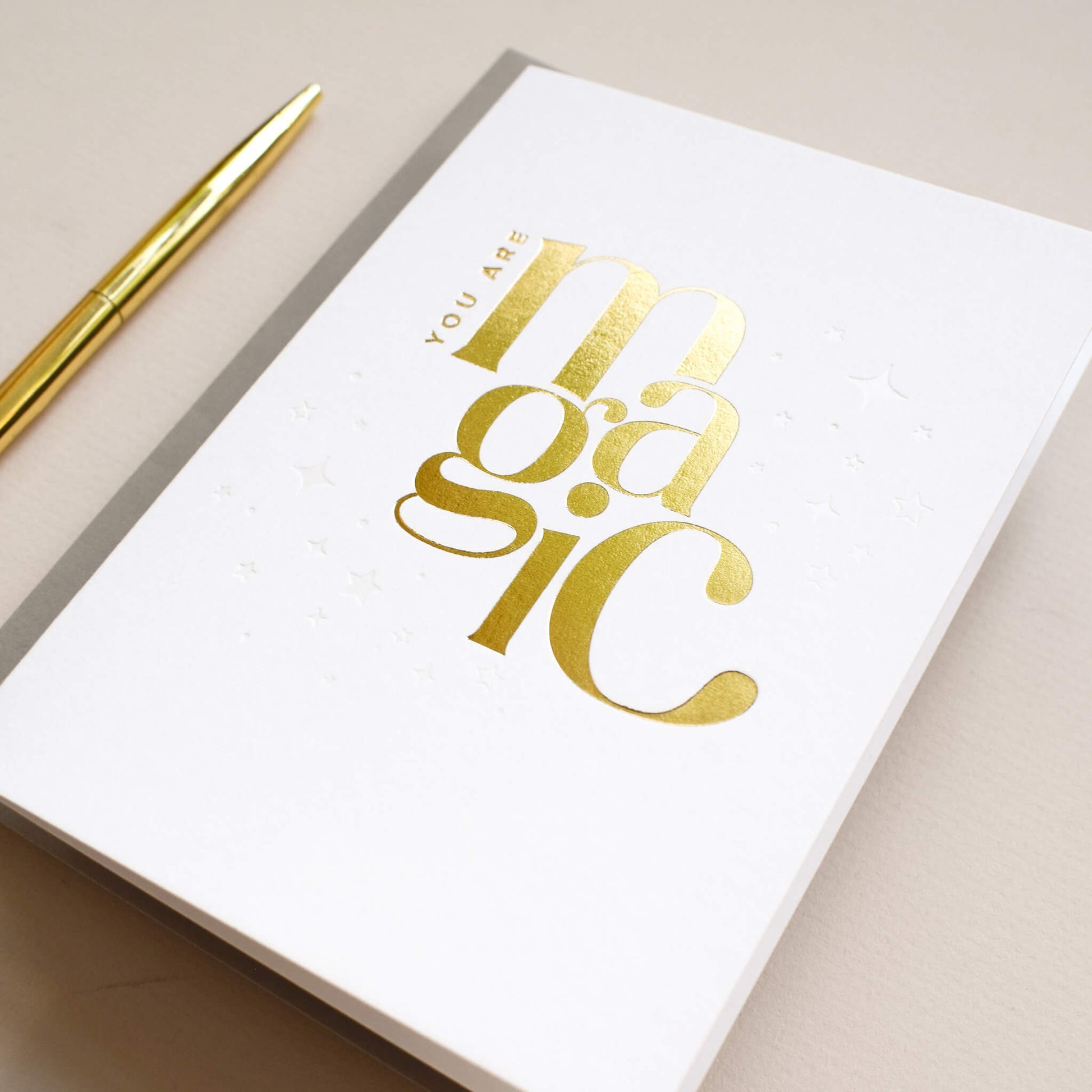 This greetings card features the words 'You Are Magic’, which have been printed onto beautiful paper with premium foil. Clusters of stars have been blind printed around the text to add to the magic of this stunning card. Suitable for a range of occasions, or even just to remind someone how great they are, because sometimes we all need a reminder.